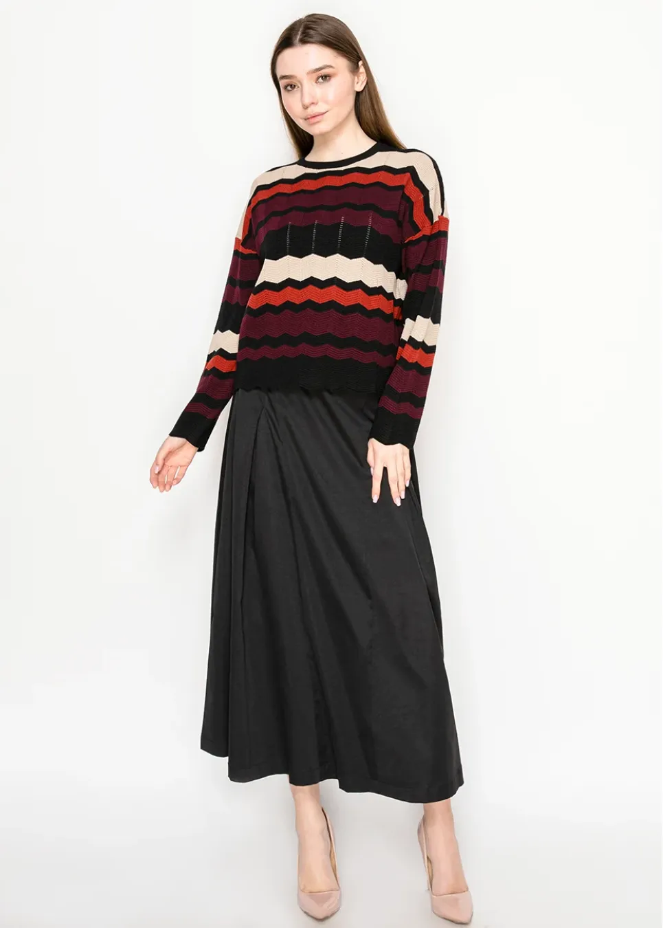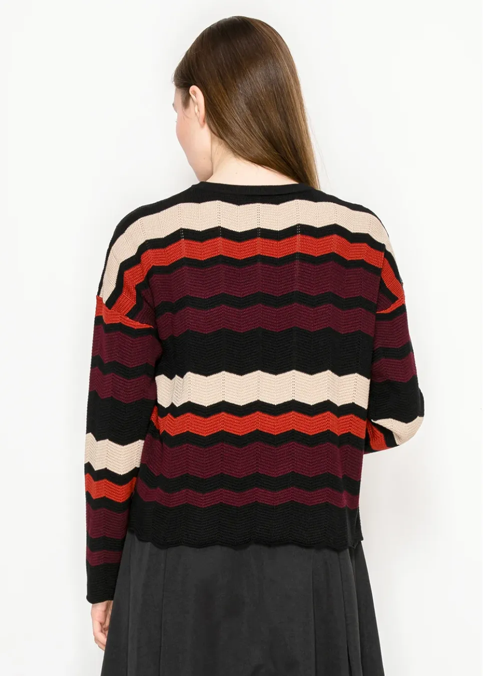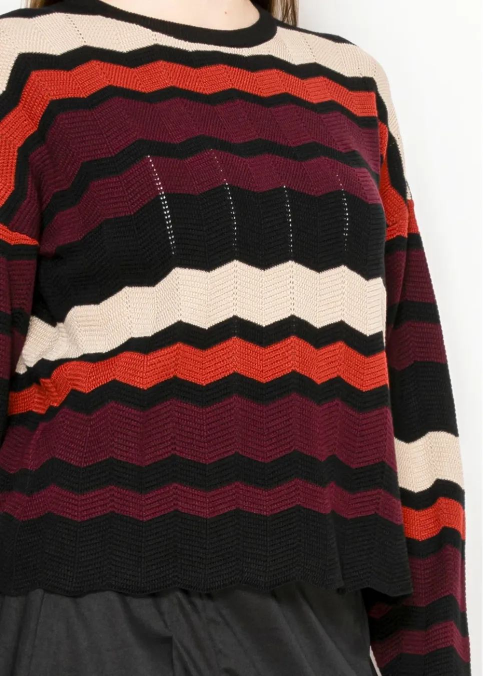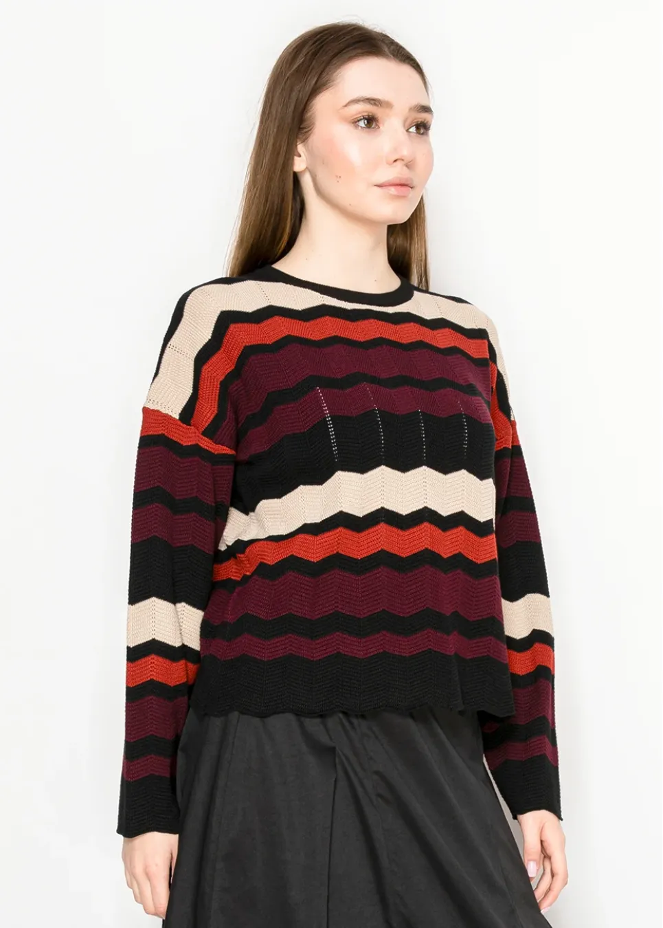 Rich tones and chevron patterning give this knit a refined yet playful finish. A versatile piece that transitions seamlessly from weekday to weekend.