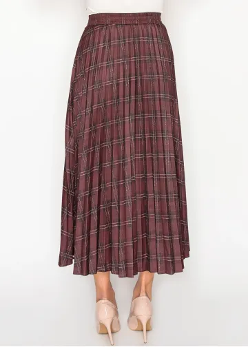 A classic pleated midi skirt in burgundy plaid with a comfortable elastic waistband. Perfect for pairing with knits, blouses, or layered fall looks.
