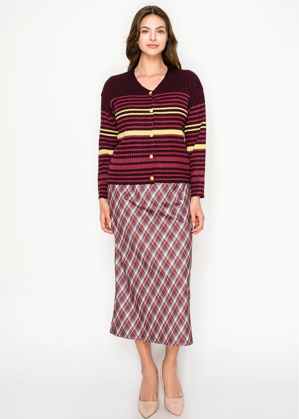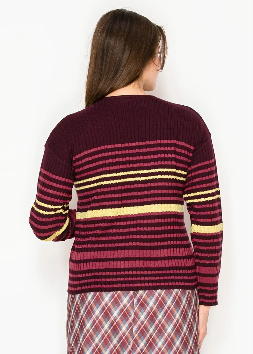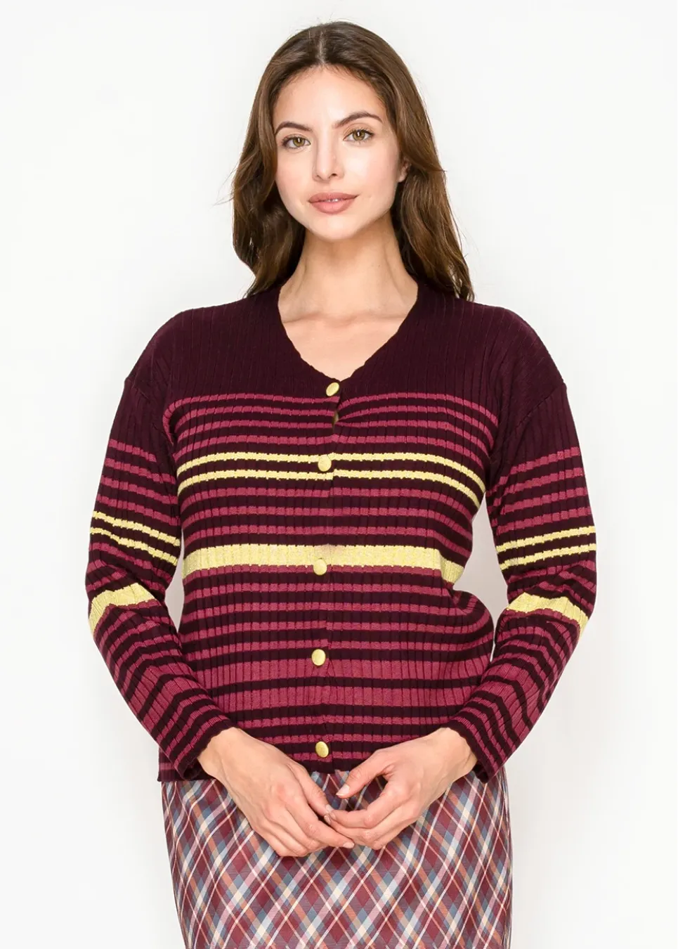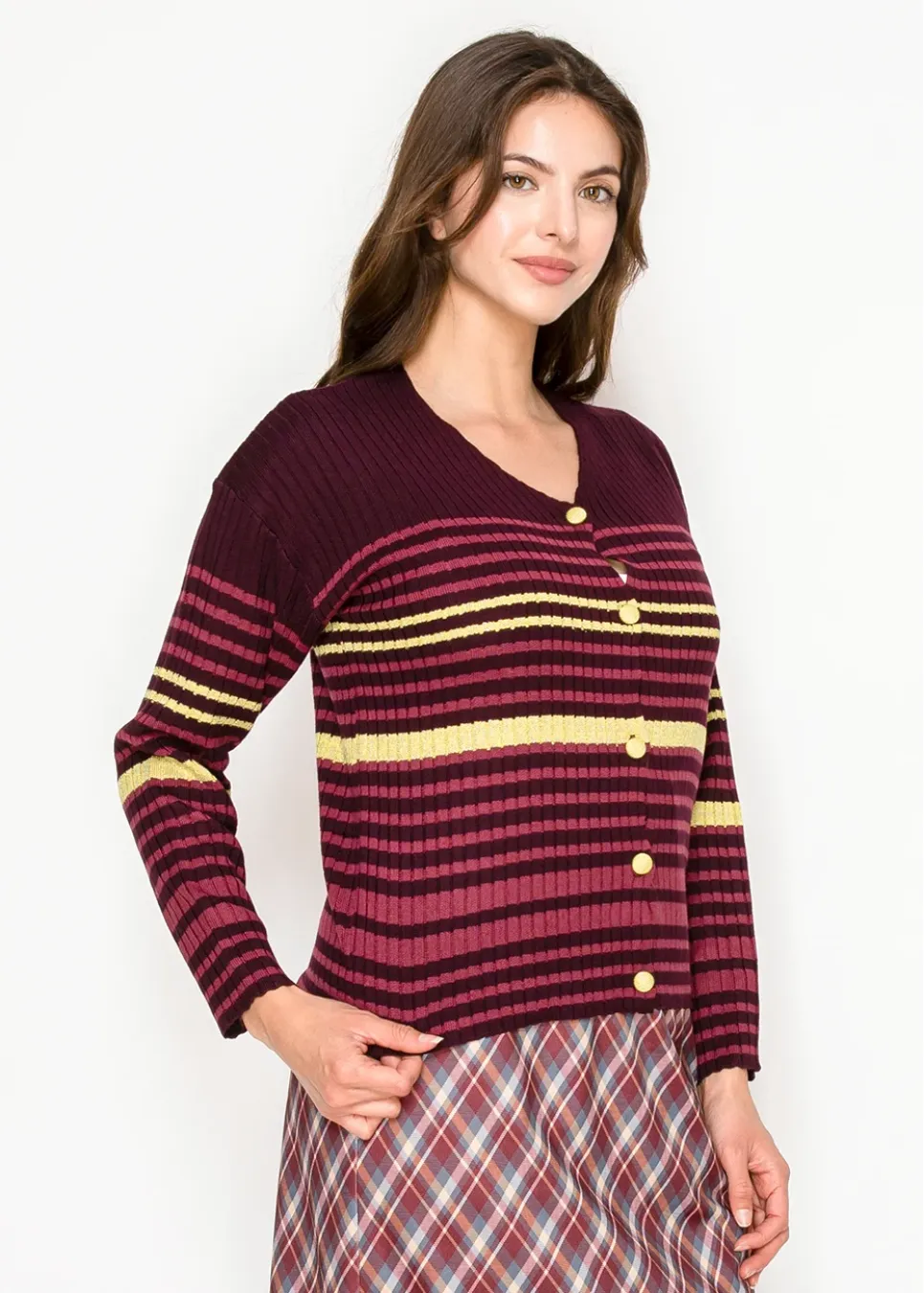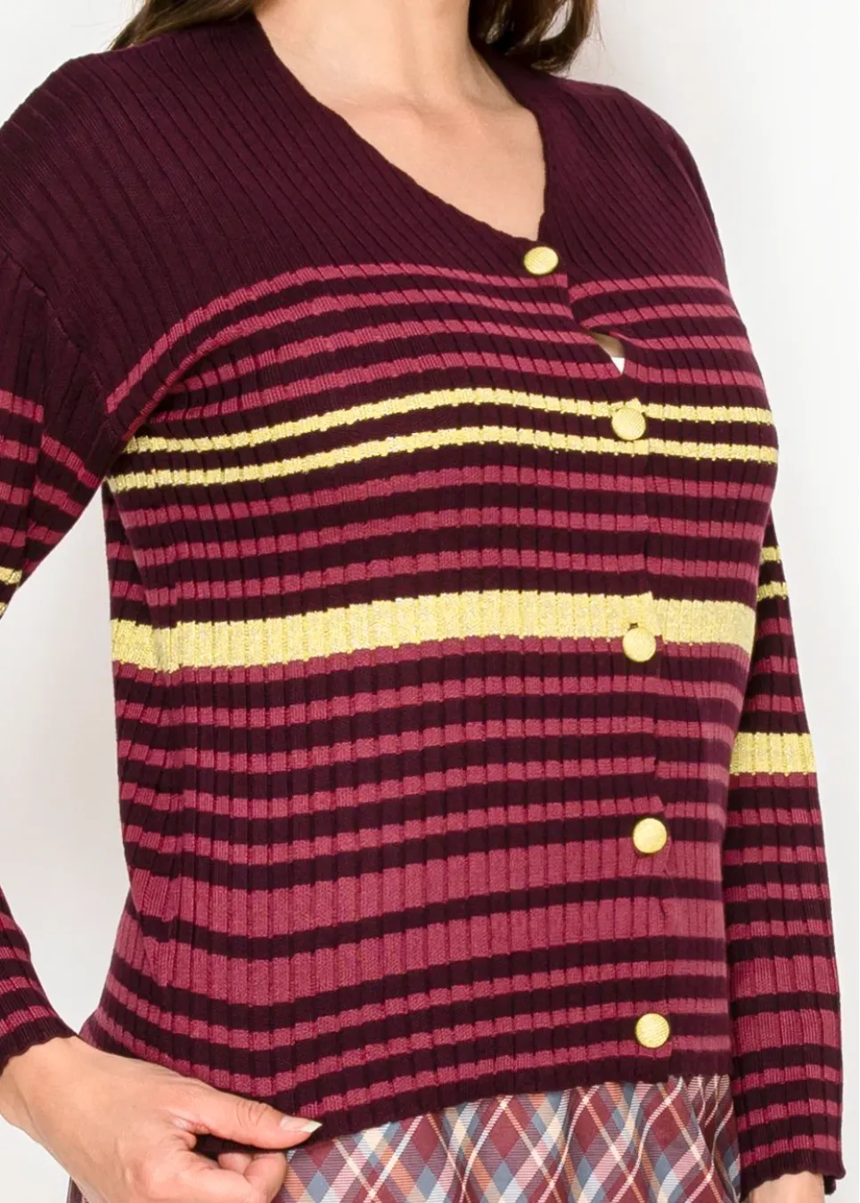 Burgundy Ribbed Cardigan with Stripes