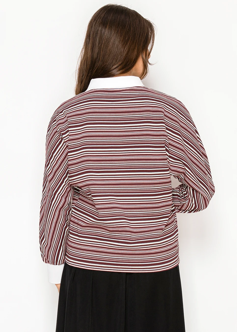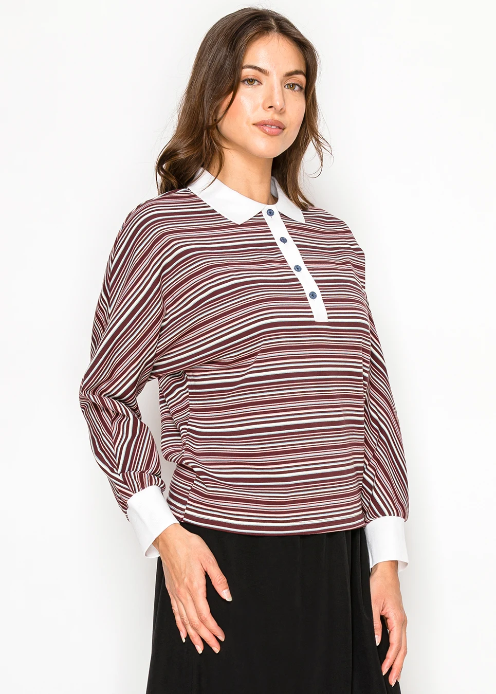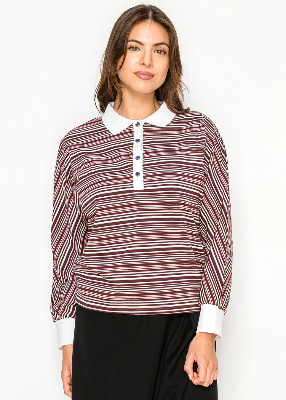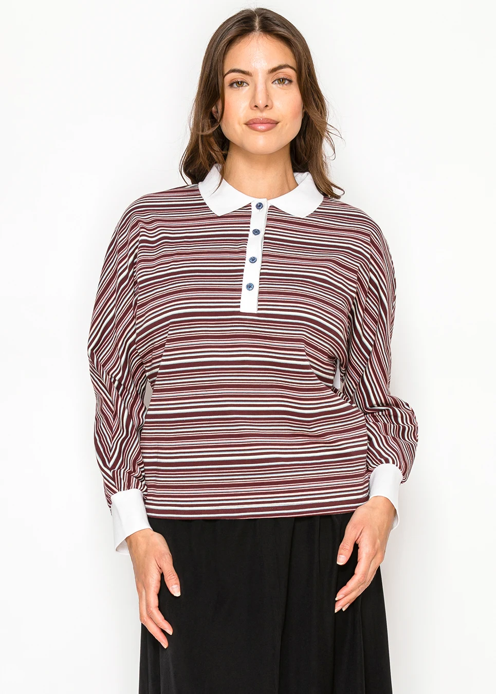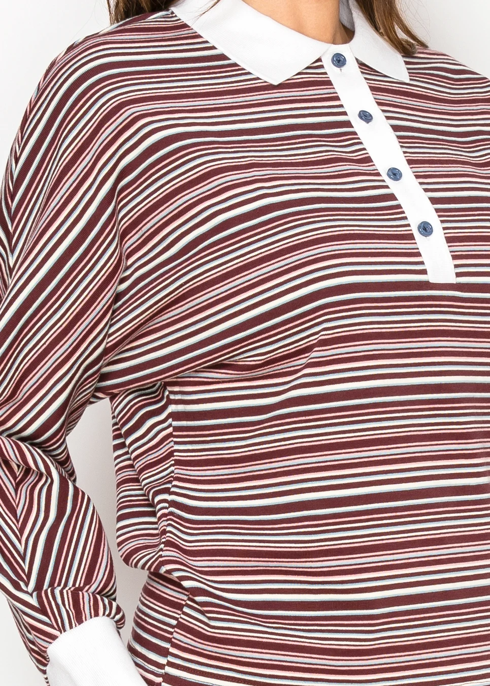 Some days you want comfort, but not a plain basic. This one gives you texture through pattern and structure through the collar. The fabric stretches gently as you move, and the hemline sits neatly at the hips.