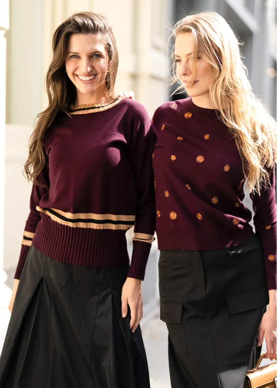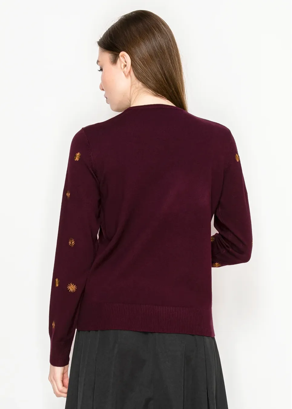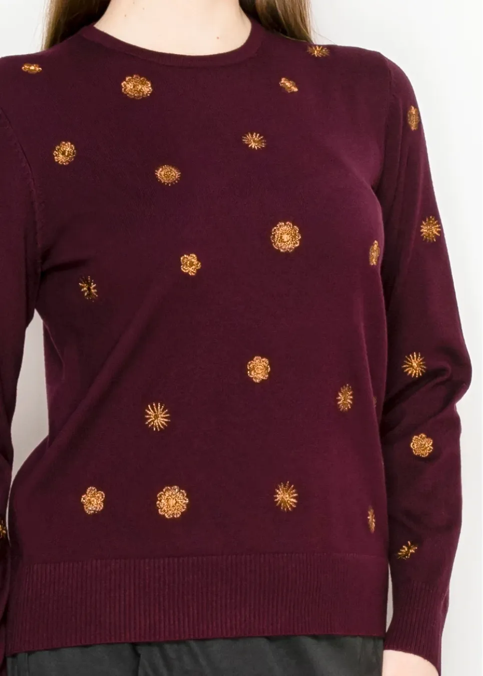 Soft knit in a rich burgundy shade, dotted with intricate golden floral motifs. An easy way to bring warmth and charm to your everyday looks.