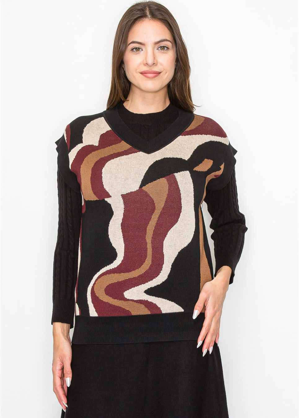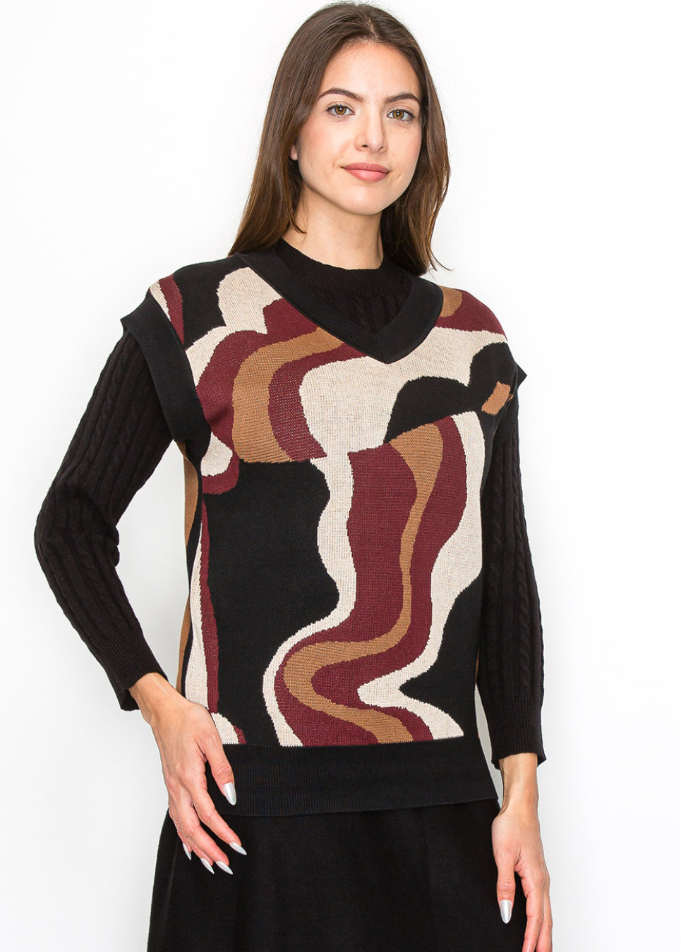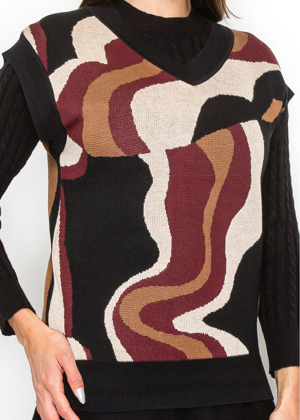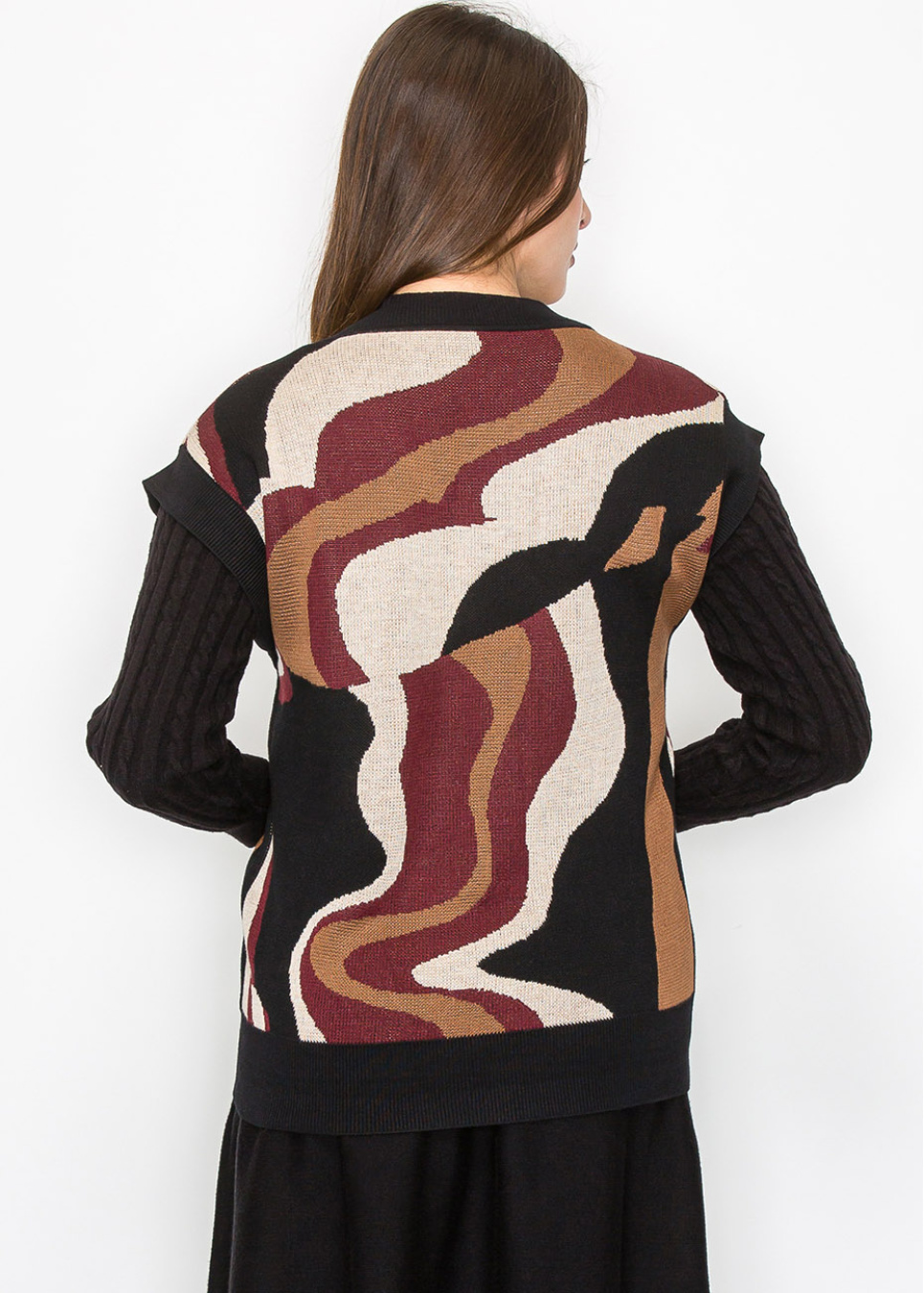 Featuring a bold wave pattern in rich burgundy and warm neutrals, this vest brings a modern twist to a classic piece. The V-neck design makes it easy to pair with your favorite tops. A stylish choice for modest layering that adds a touch of flair to any outfit.