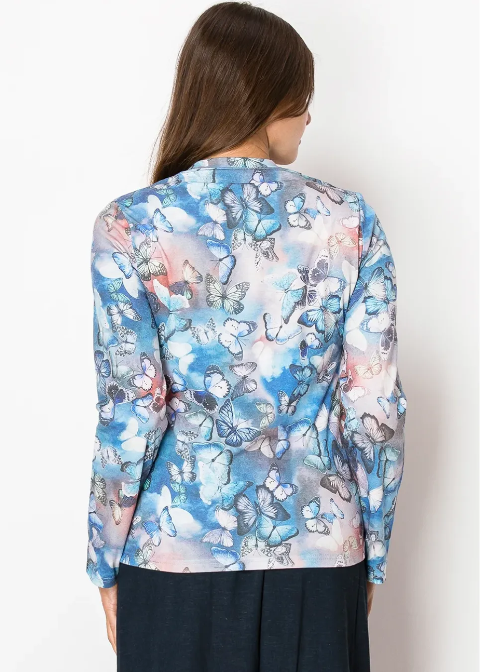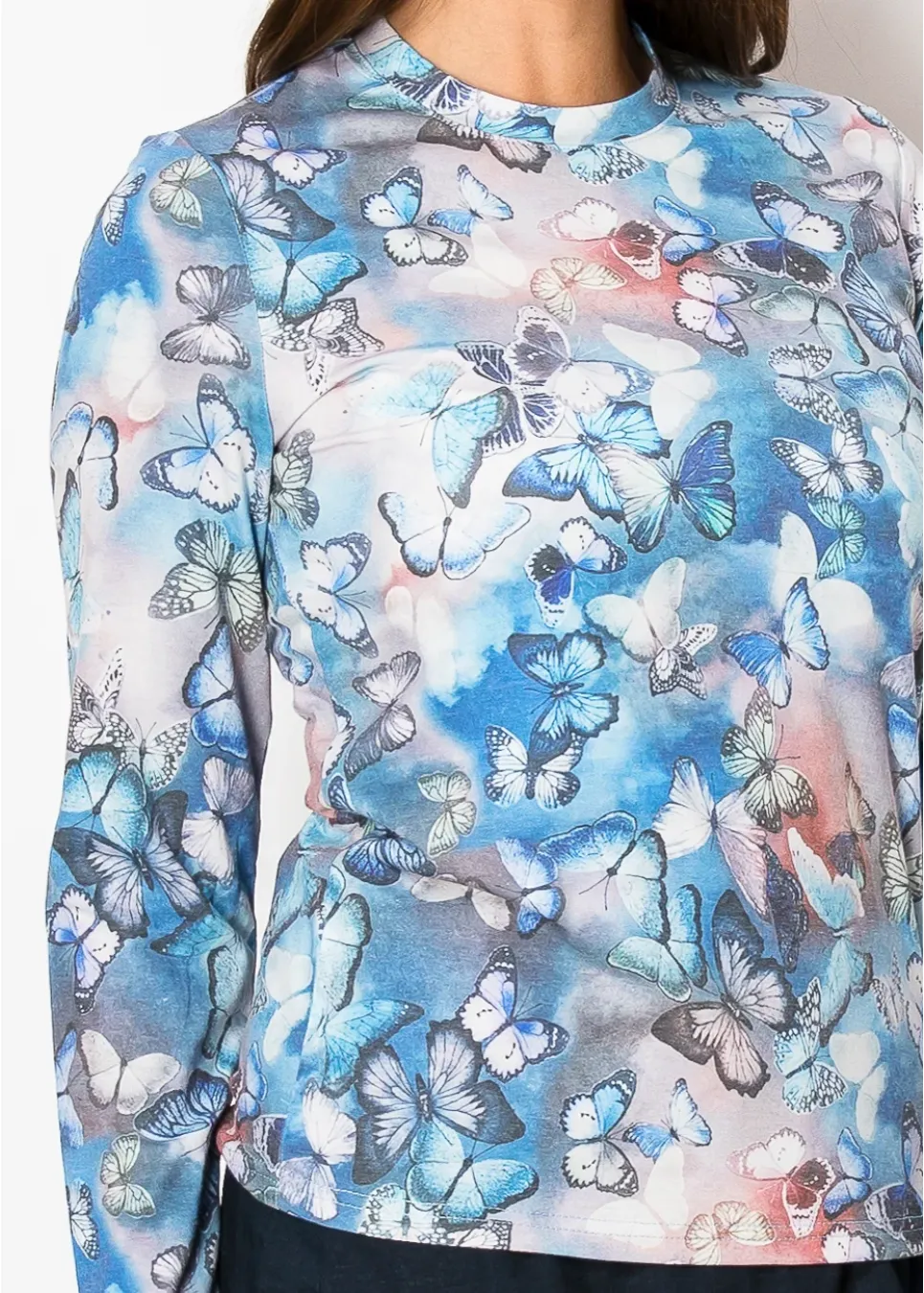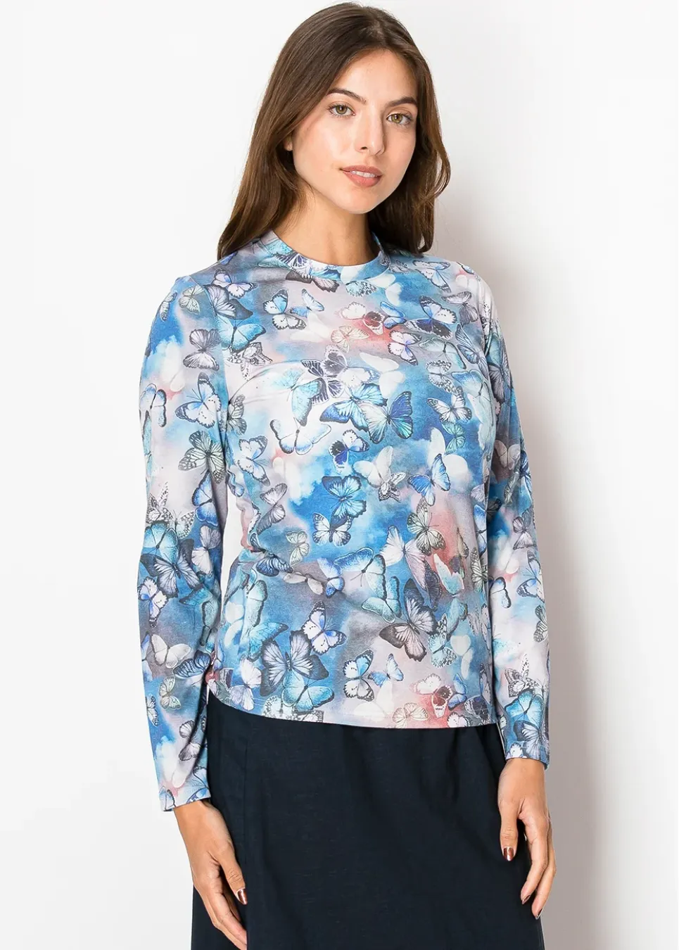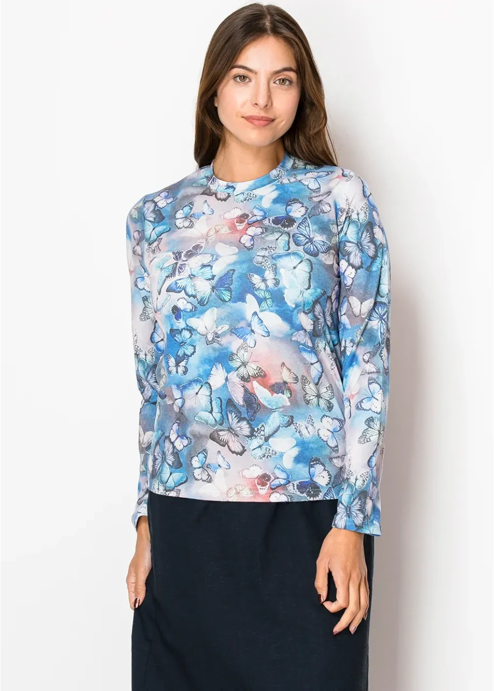 This lightweight top is like a breath of fresh air, covered in soft shades of blue and fluttering butterflies. The relaxed fit and long sleeves make it an easy choice for everyday wear while keeping things modest and beautiful. Pair it with a flowy skirt for a look that’s as graceful as it is comfortable.