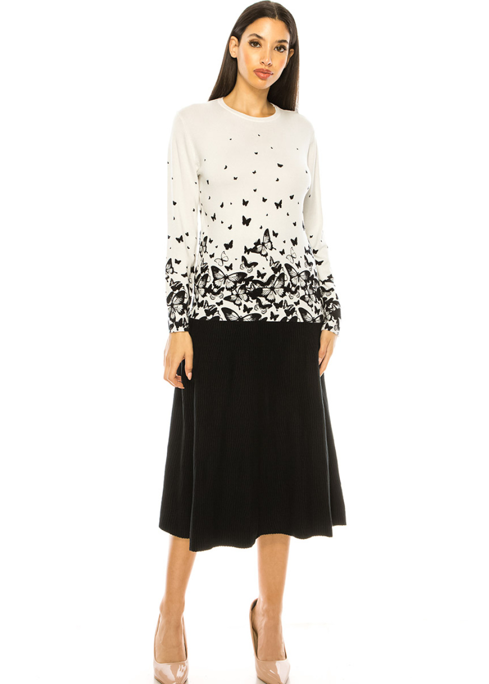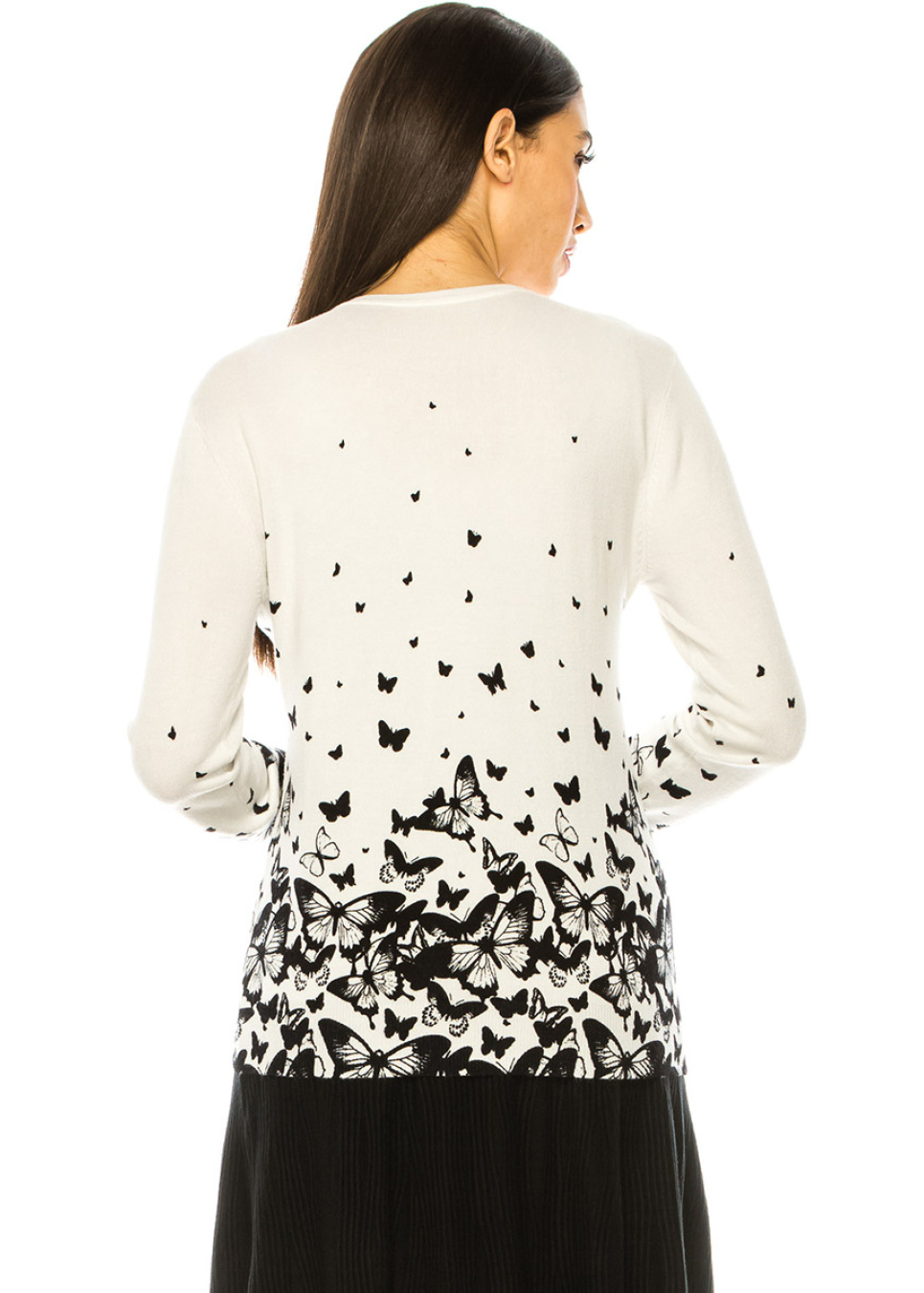Embrace your feminine side with this lovely white sweater featuring a playful black butterfly print. The loose fit and soft, high-quality fabric will keep you comfortable all day long, while the unique design will make you stand out in any crowd. Perfect for pairing with your favorite skirt or pants, this sweater is a must-have addition to any frum woman's wardrobe.