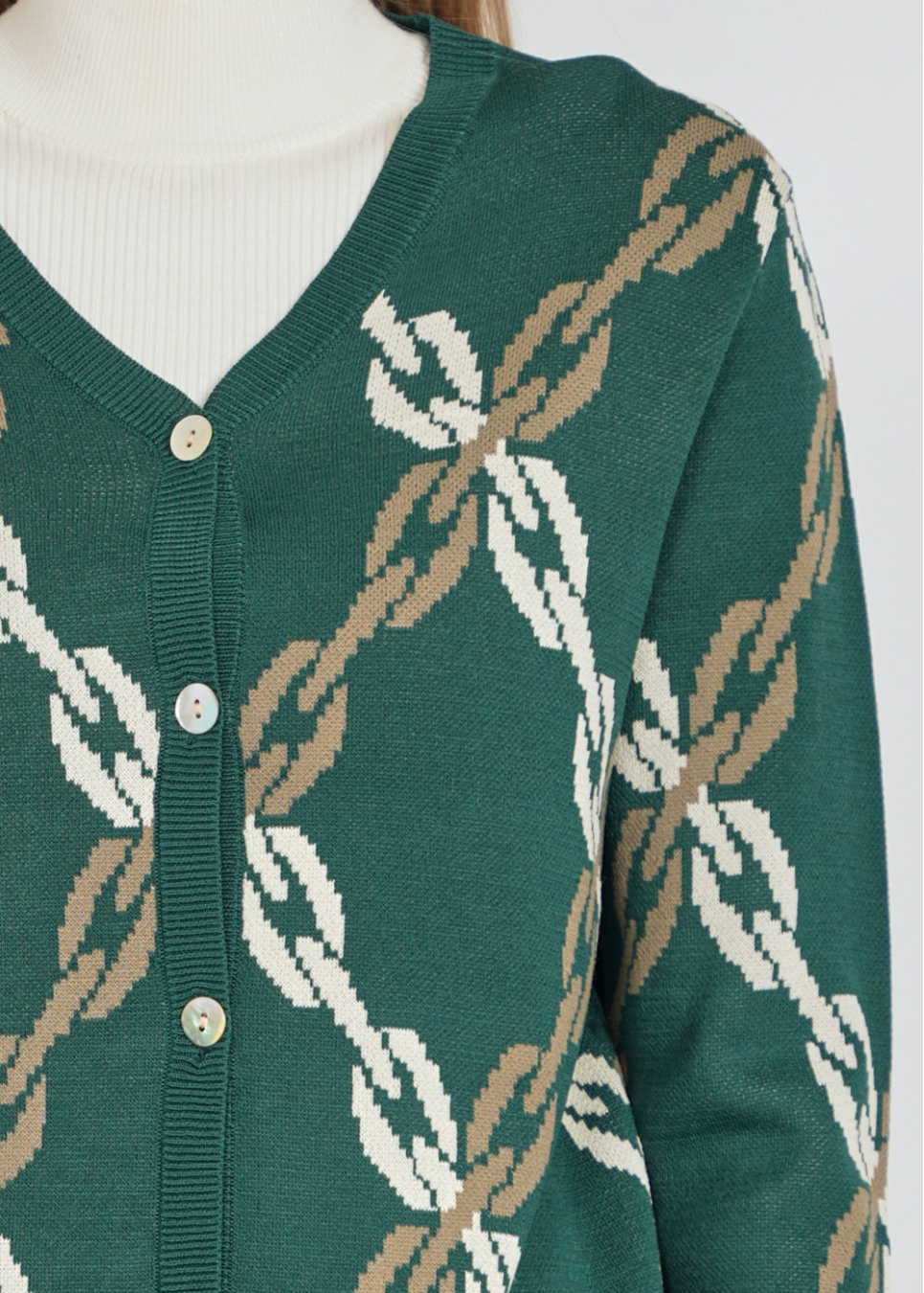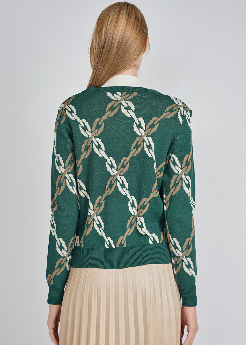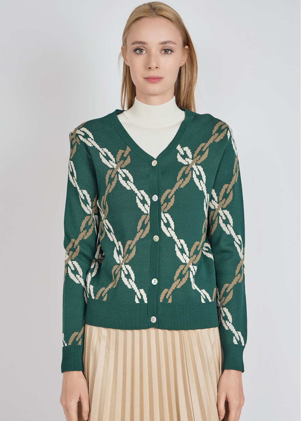 Buttoned Green Cardigan with Elegant Chain Motif