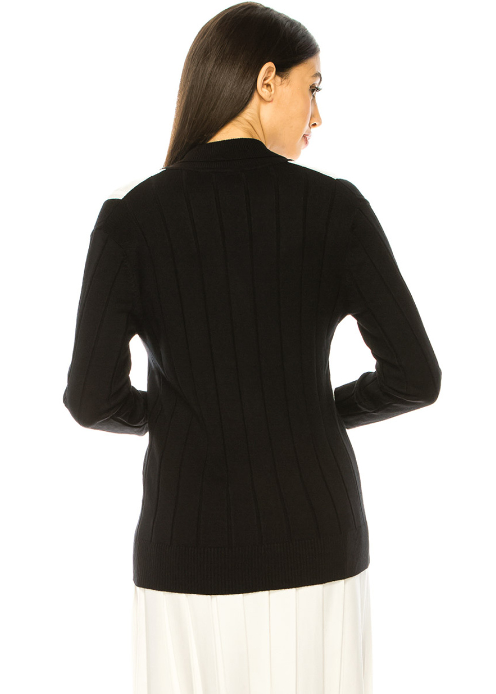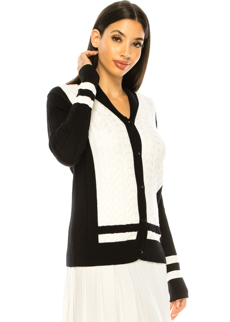 Stay comfortable and stylish in this cozy cable knit cardigan, featuring a classic black and white color scheme. The soft and warm fabric makes it the perfect choice for layering over your favorite tops and dresses.