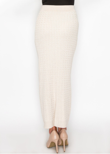 This cozy cable-knit cream skirt brings warmth and style to your wardrobe. With a simple pull-on design, it has a comfortable waistband and a long, modest fit that flatters while keeping things casual. The classic cable-knit texture gives it that soft, timeless look, perfect for pairing with your favorite sweaters or blouses.