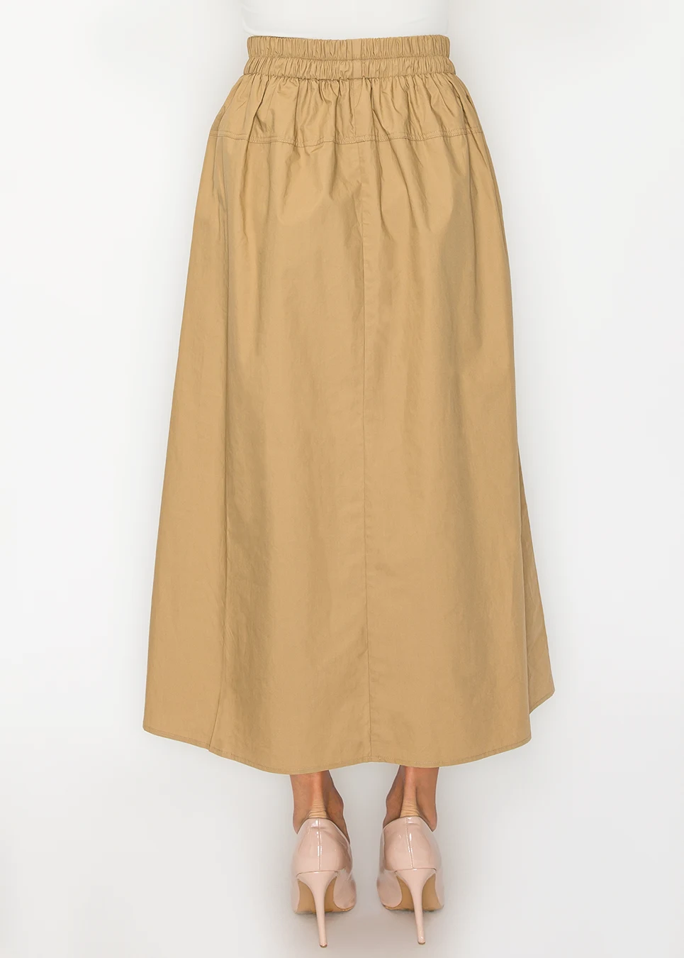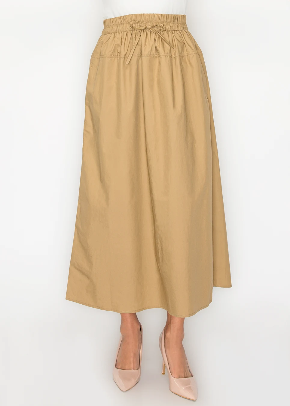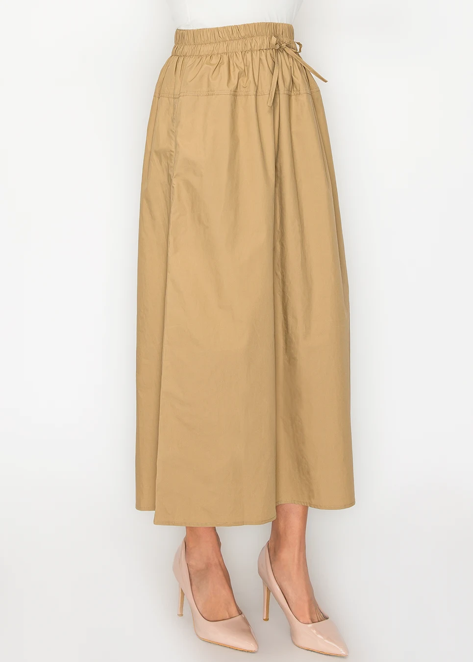 Camel, cotton, full gathered midi — the ingredients are simple and the result is a skirt that works in more situations than it has any right to. Elastic drawstring waist with a tie front. A-line silhouette with real volume.