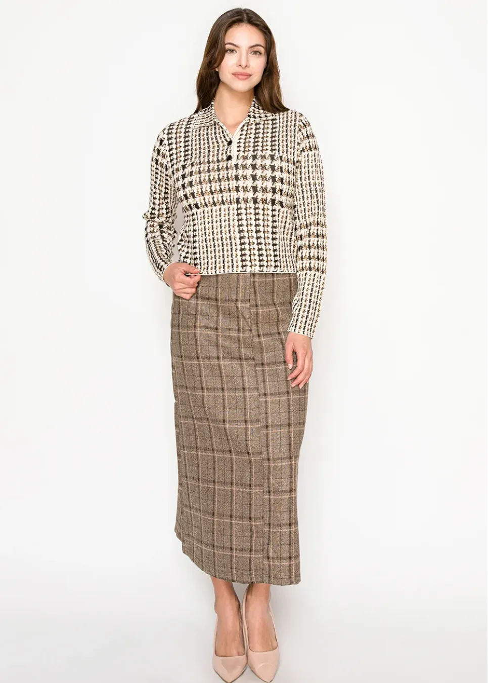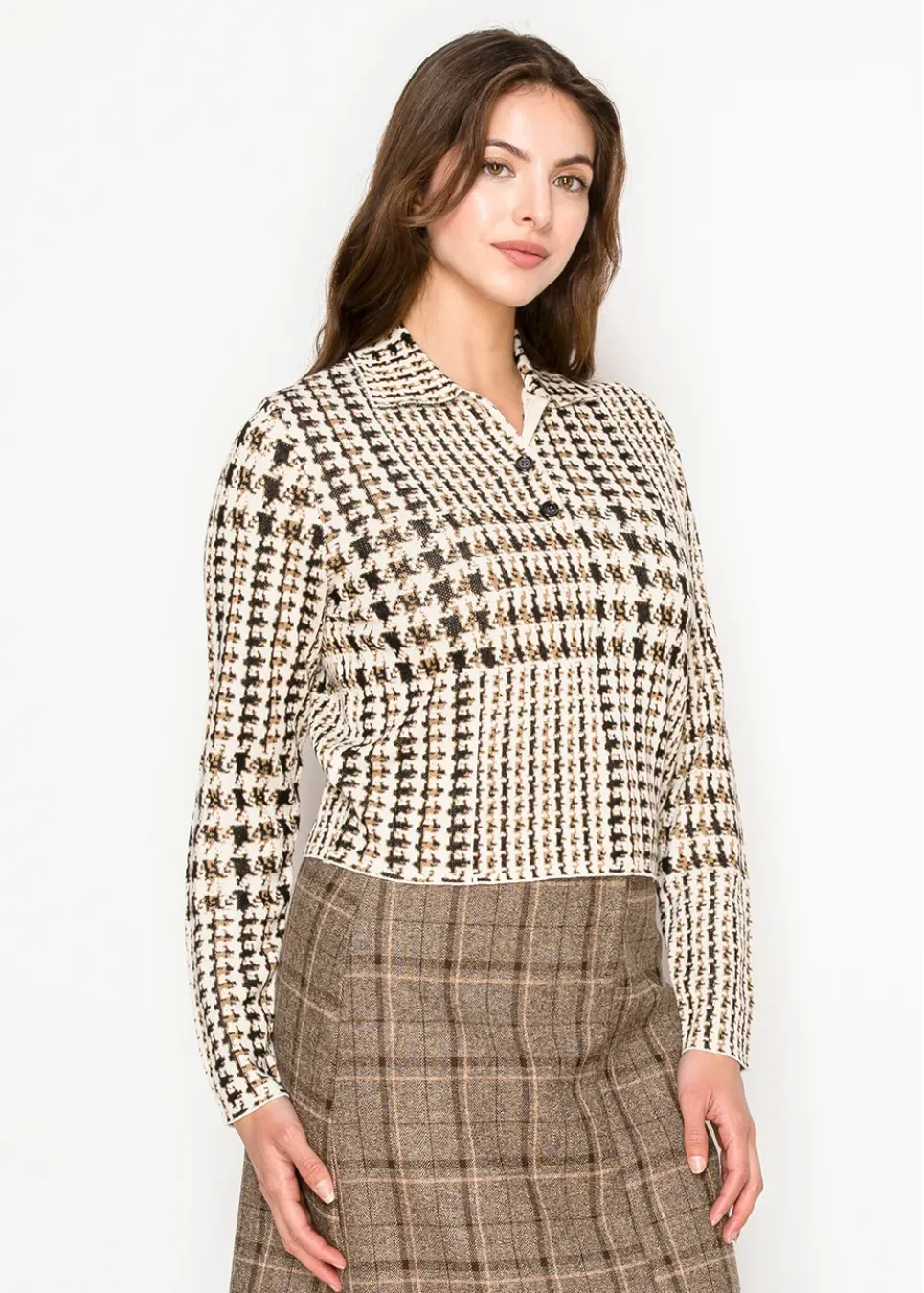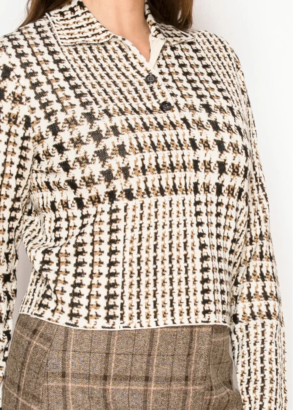 A timeless pattern with a modern twist. This cozy knit top features a crisp collar, button front, and soft neutral tones — perfect layered or worn solo.
