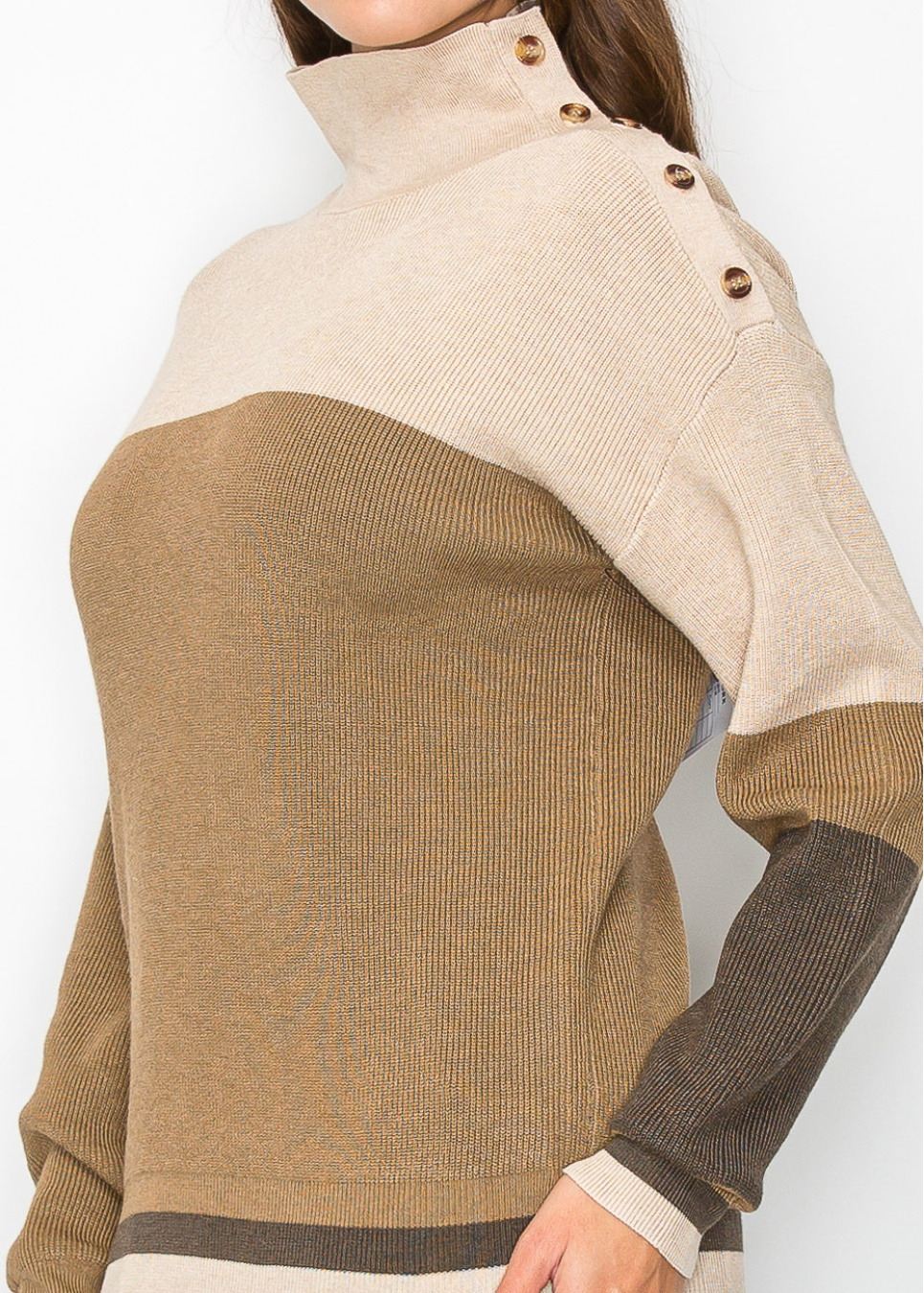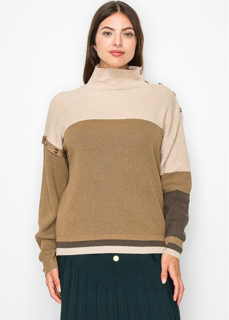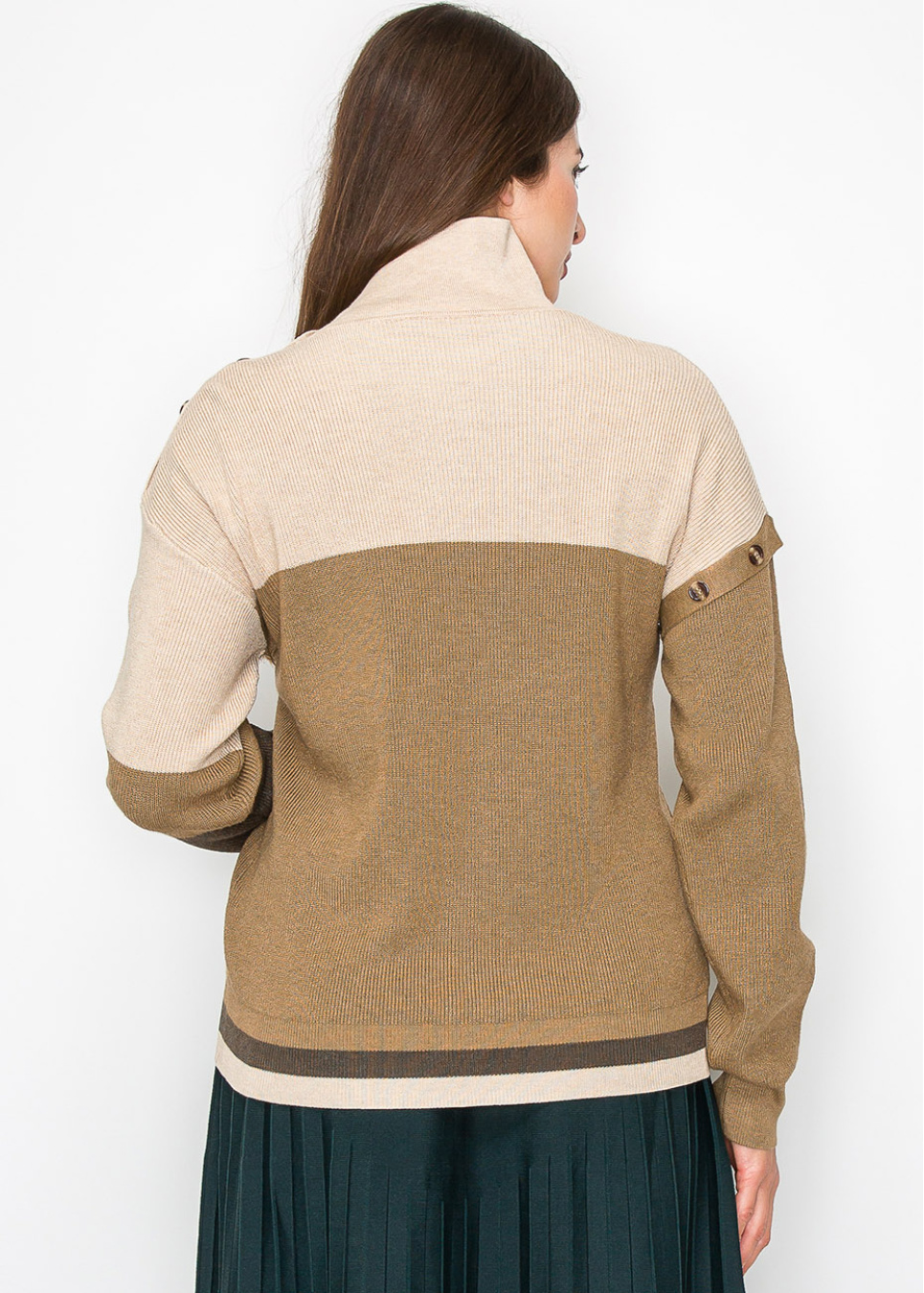 For those who love a classic neutral palette, this knit sweater brings together rich camel and beige tones. The buttons on the shoulder and sleeves offer a chic accent, and the high collar adds a touch of sophistication. This sweater is an ideal option for days when you want both comfort and style.