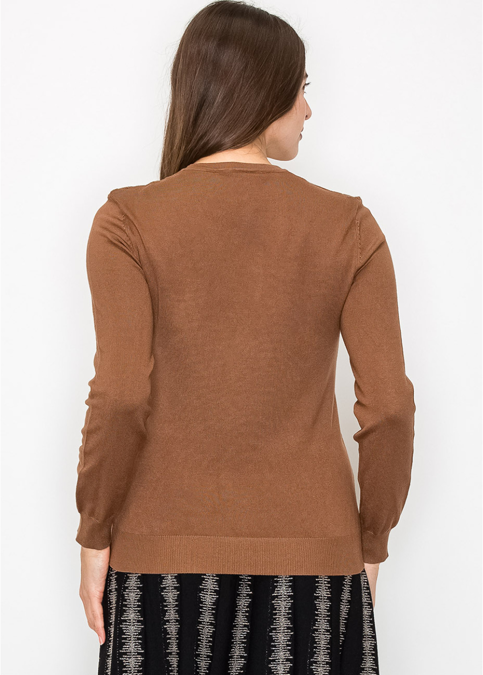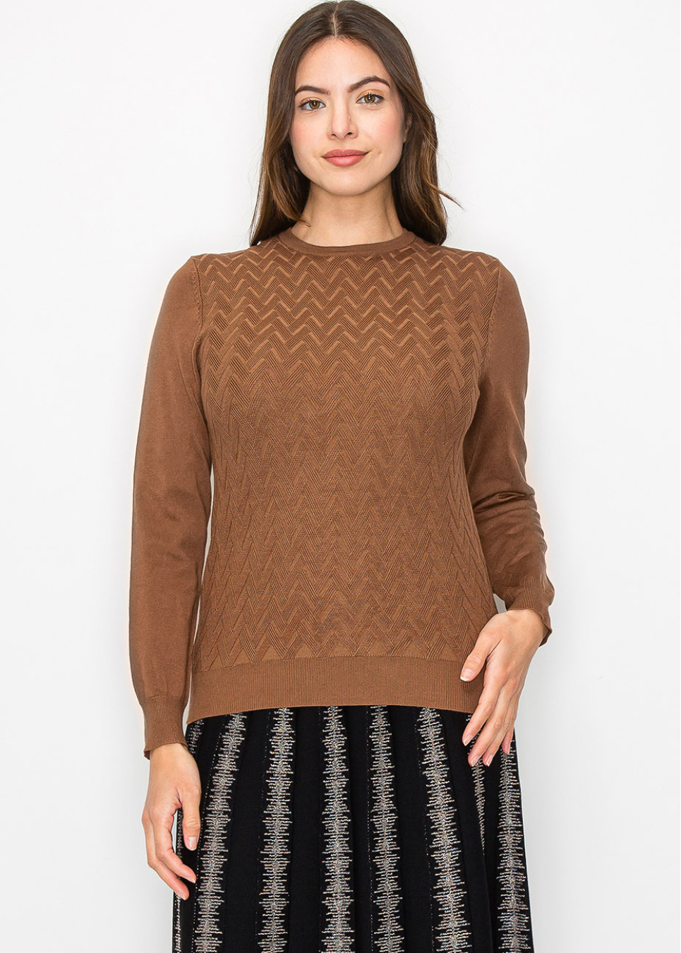 A cozy camel knit with a refined chevron pattern, this sweater offers both style and comfort. The crew neck and fitted silhouette make it versatile for any occasion, ensuring you stay warm and stylish throughout the season.