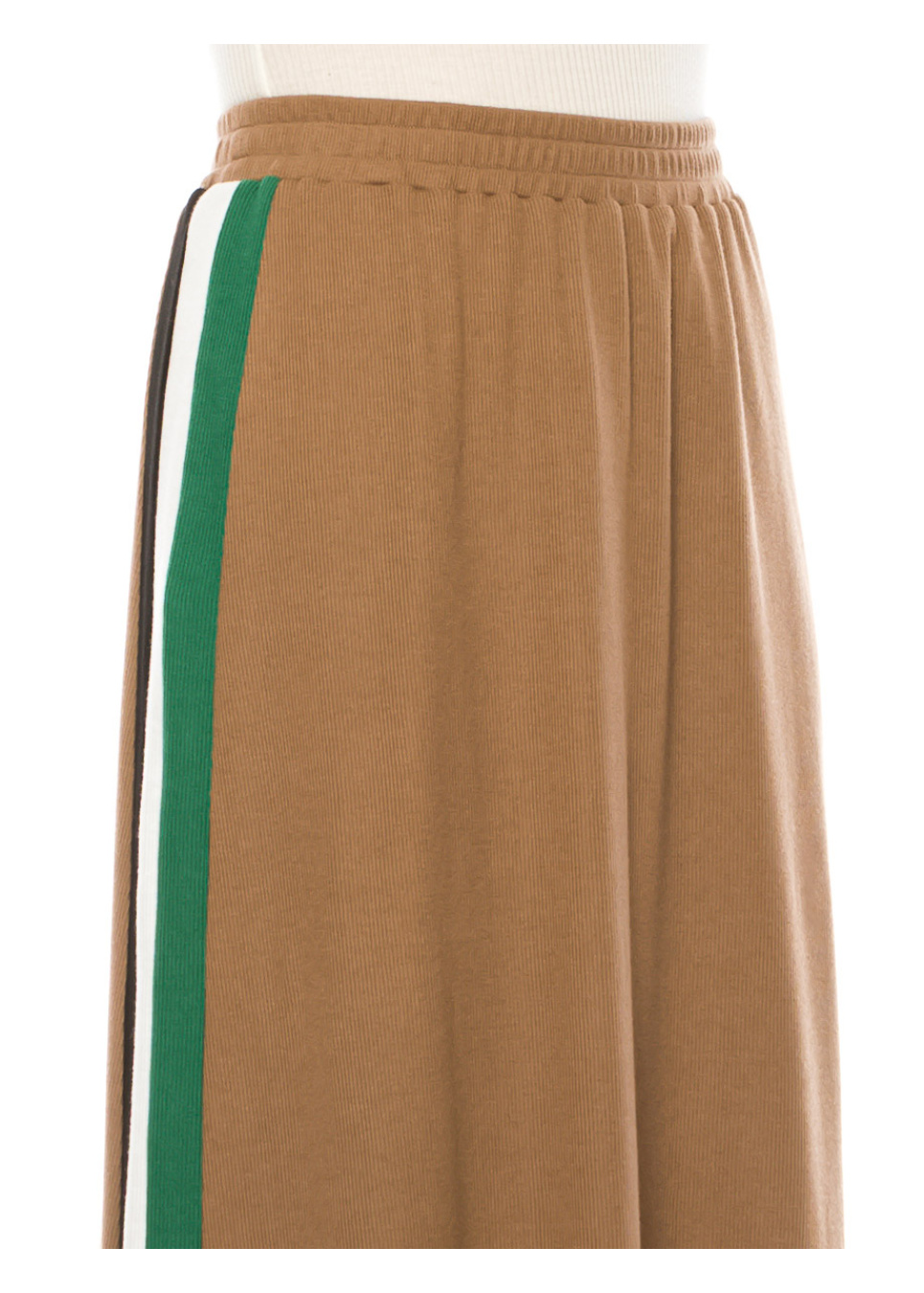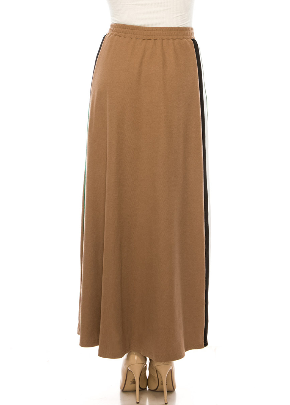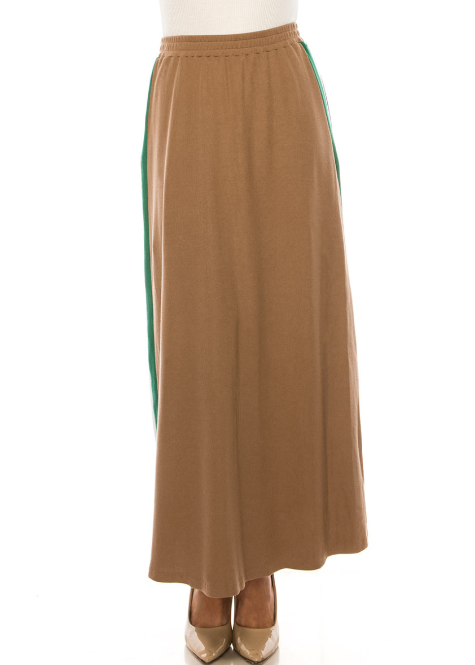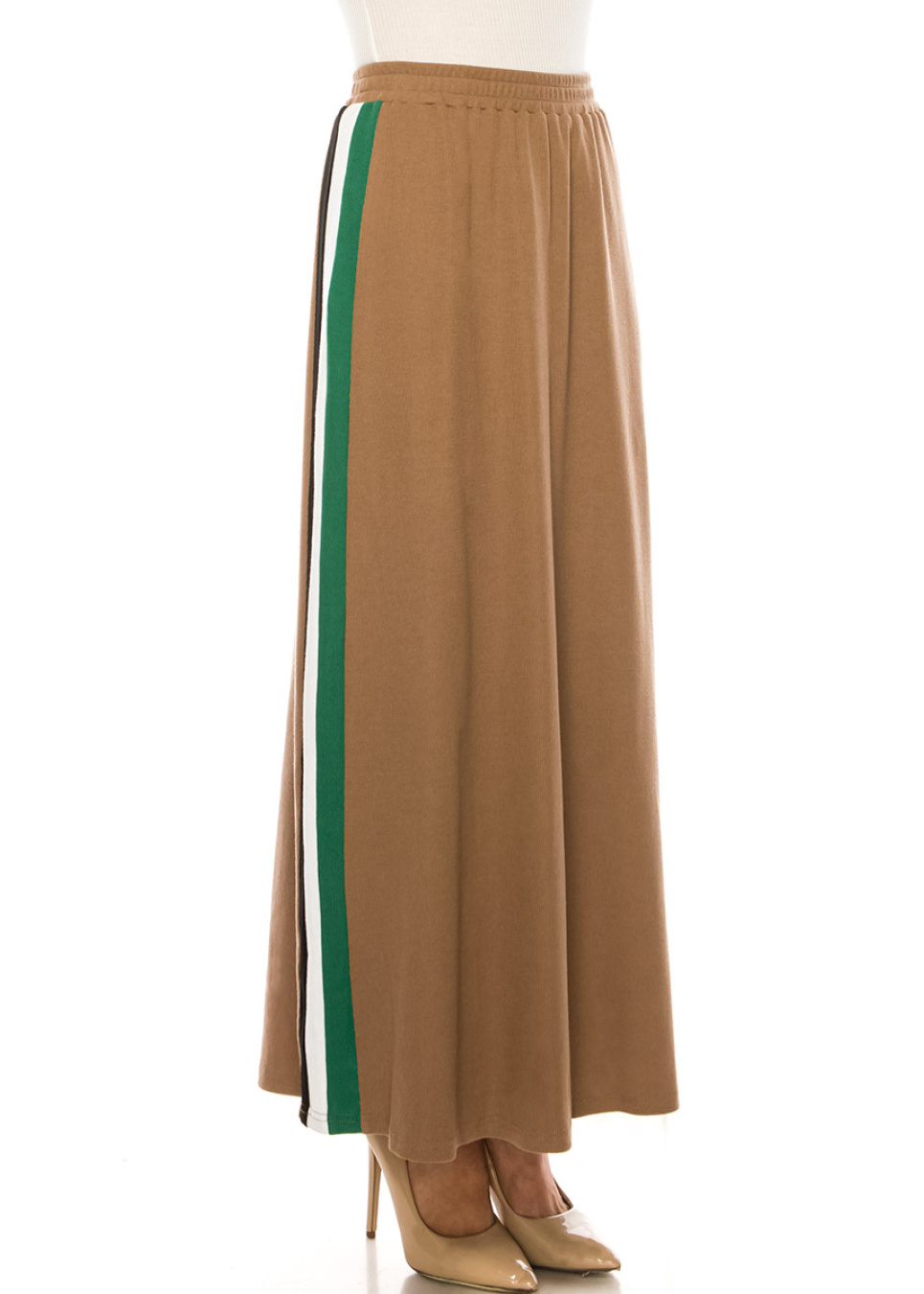 Are you looking for a chic and comfortable addition to your modest wardrobe? Look no further than this stunning camel maxi knit skirt. With colorful stripes along the sides and a soft knit material, this skirt effortlessly blends fashion and comfort. The elastic waistband ensures a secure and comfortable fit, while the modest maxi length provides ample coverage for any occasion.