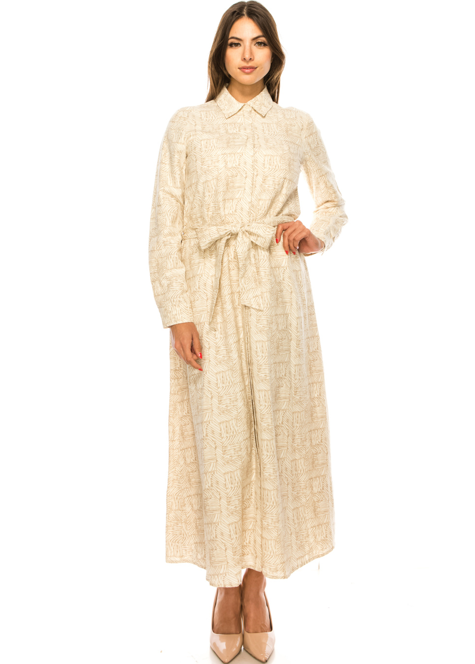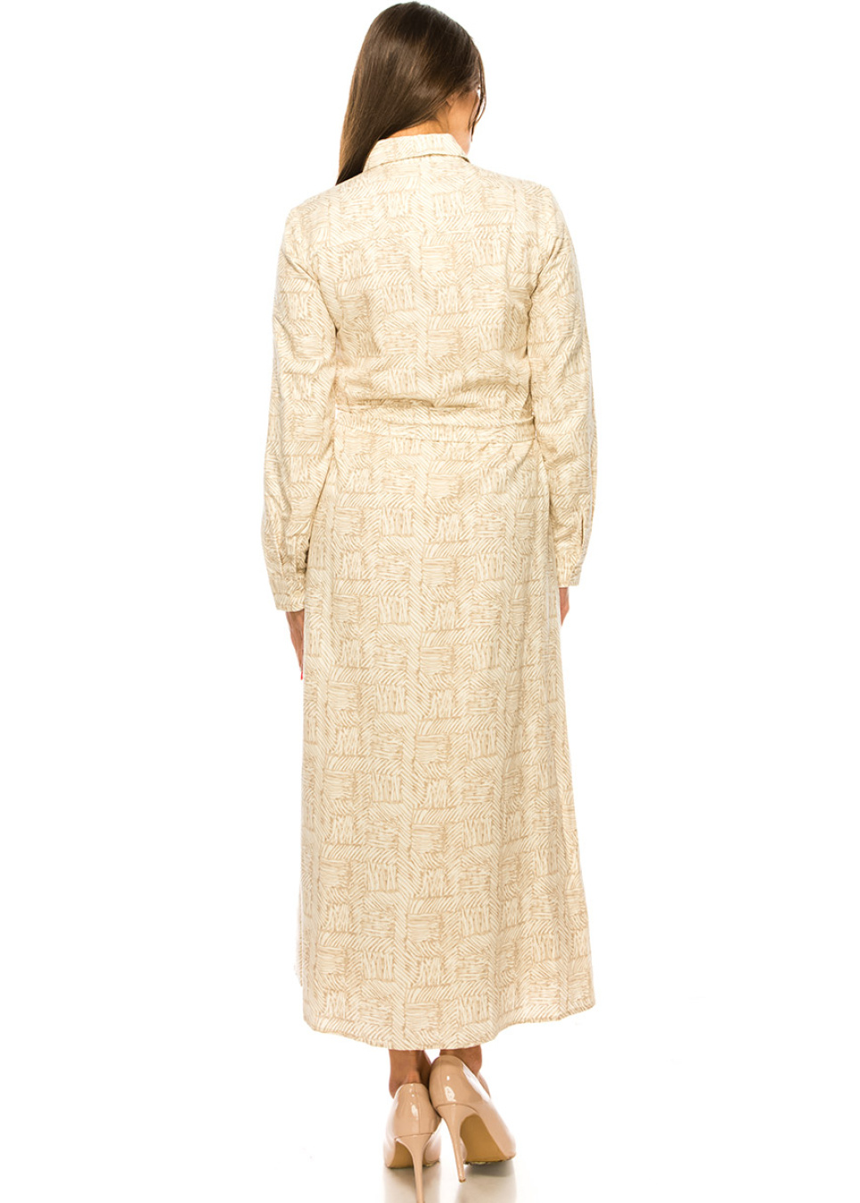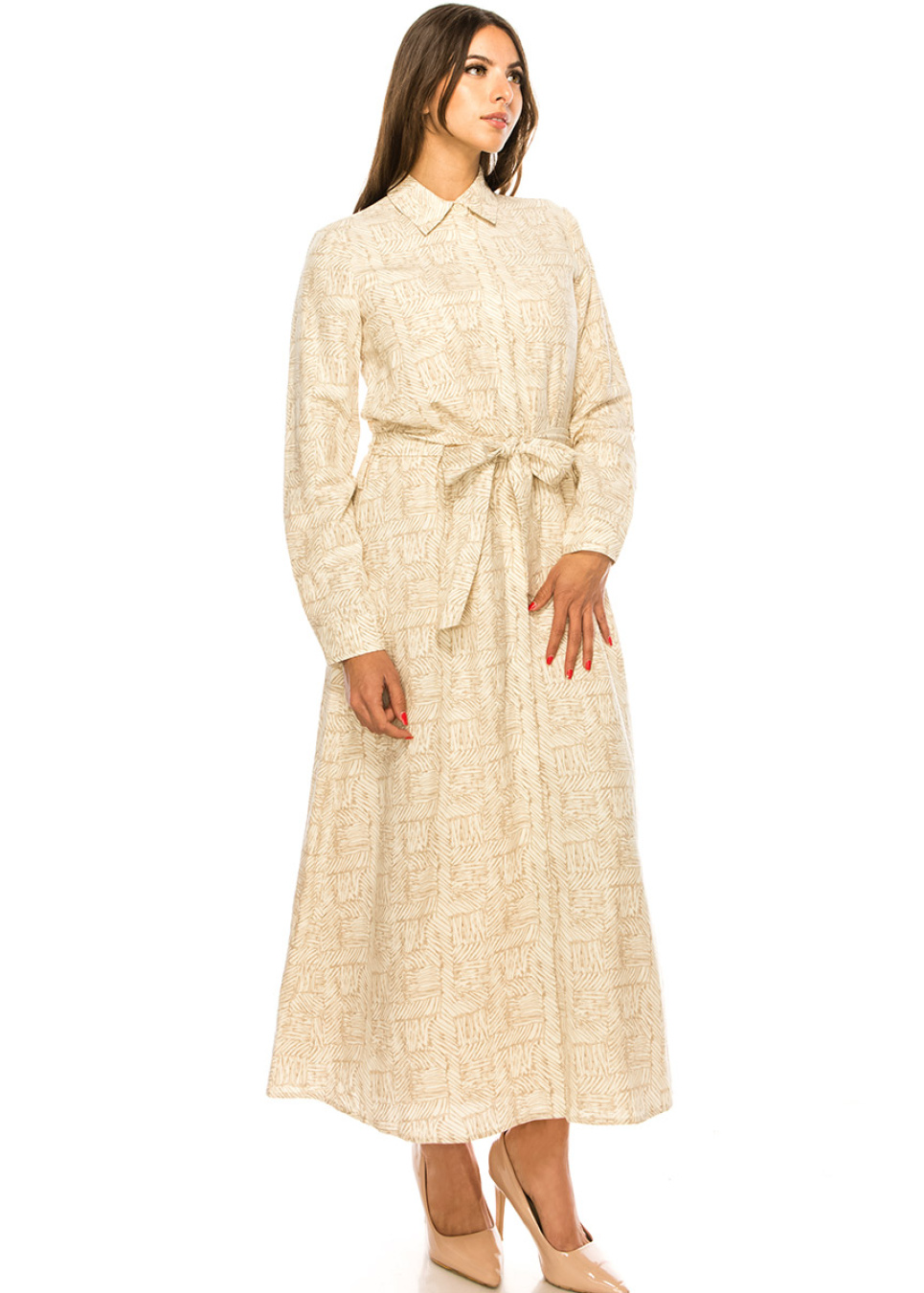 This elegant camel maxi dress is perfect for any professional setting. Featuring a classic shirt collar and a flattering waist belt, this dress is both comfortable and stylish. The unique print adds a touch of personality to your outfit without compromising on professionalism.