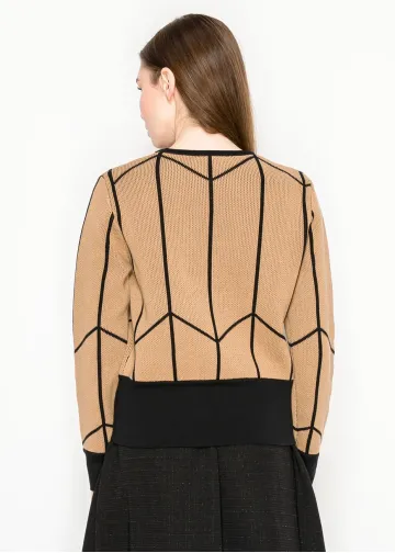 A camel knit sweater defined by sharp black geometric lines. The bold contrast gives a modern edge to a classic crewneck shape.