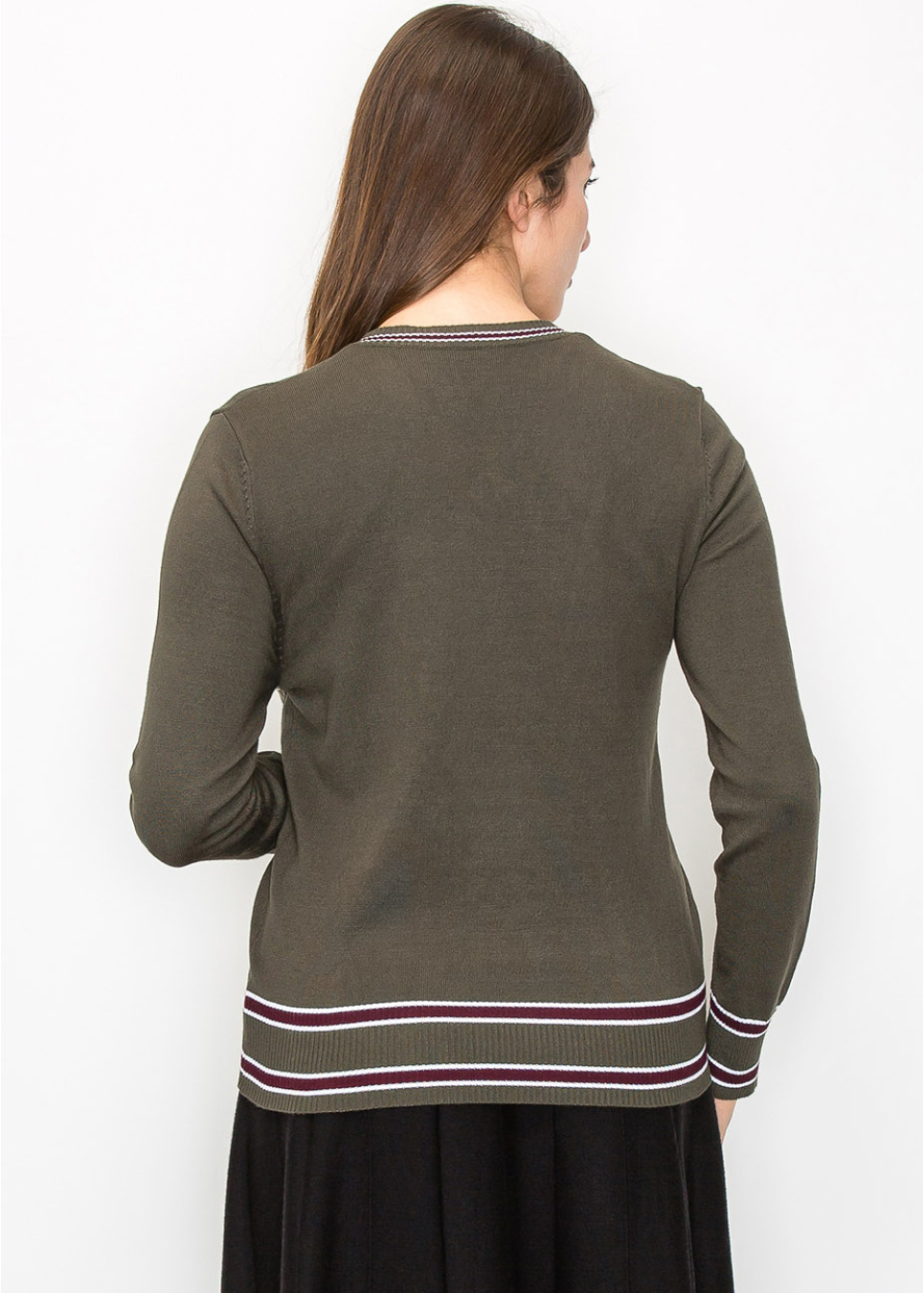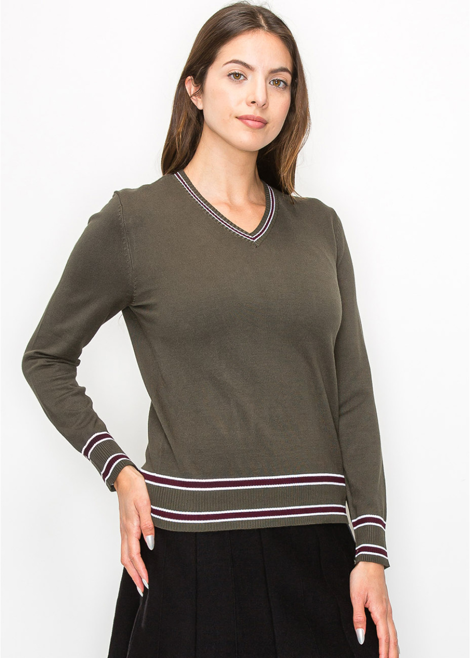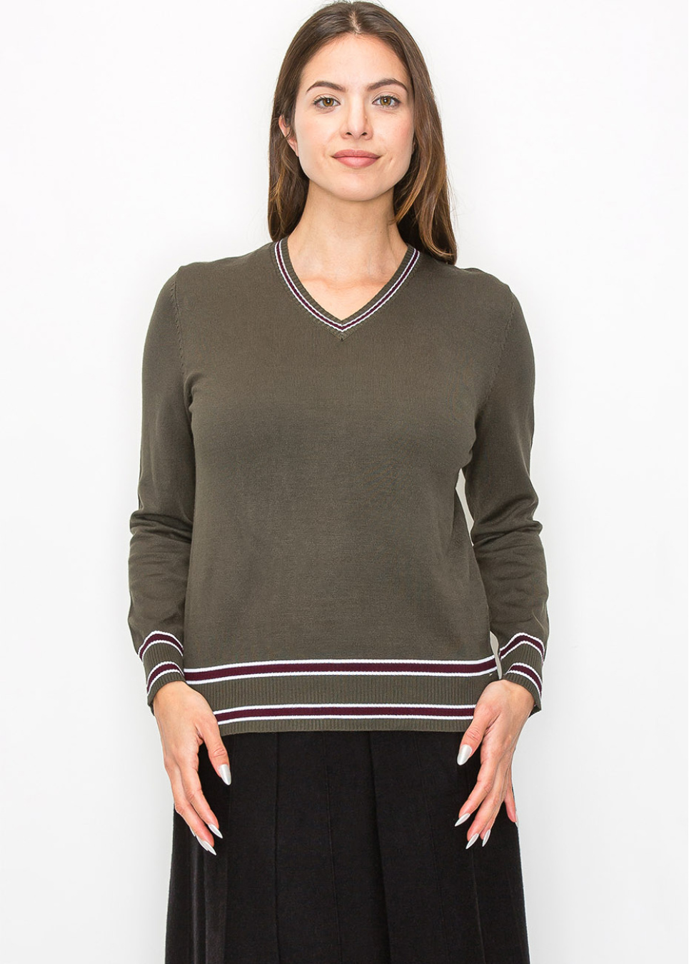 Stay comfy and chic with this casual olive V-neck sweater. The subtle striped trim adds a fun element to the design, while the soft fabric ensures all-day comfort. It’s an easy piece to pair with skirts or other favorites for a relaxed yet put-together outfit.