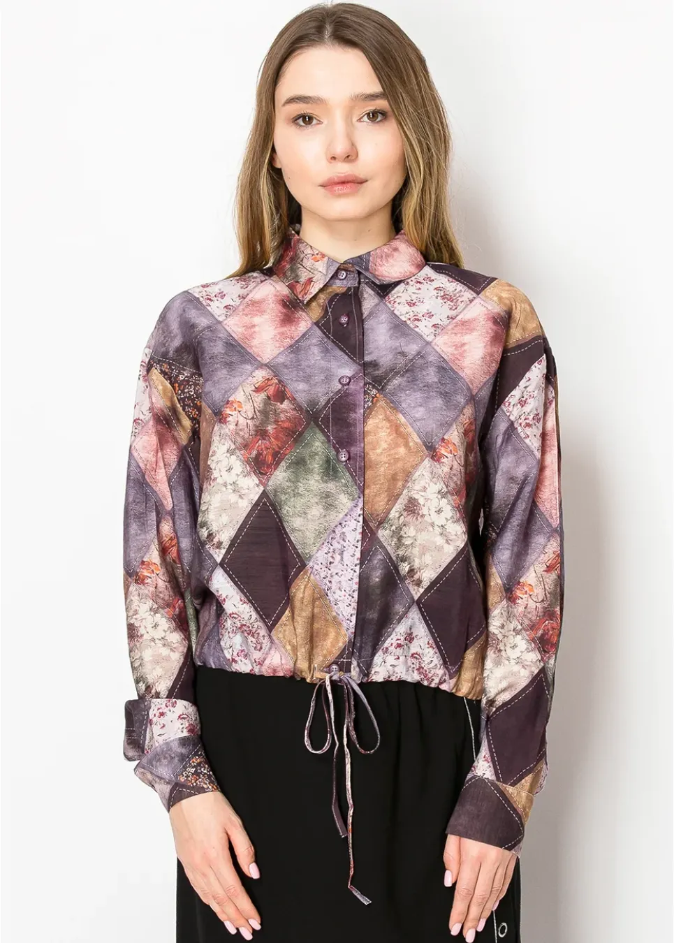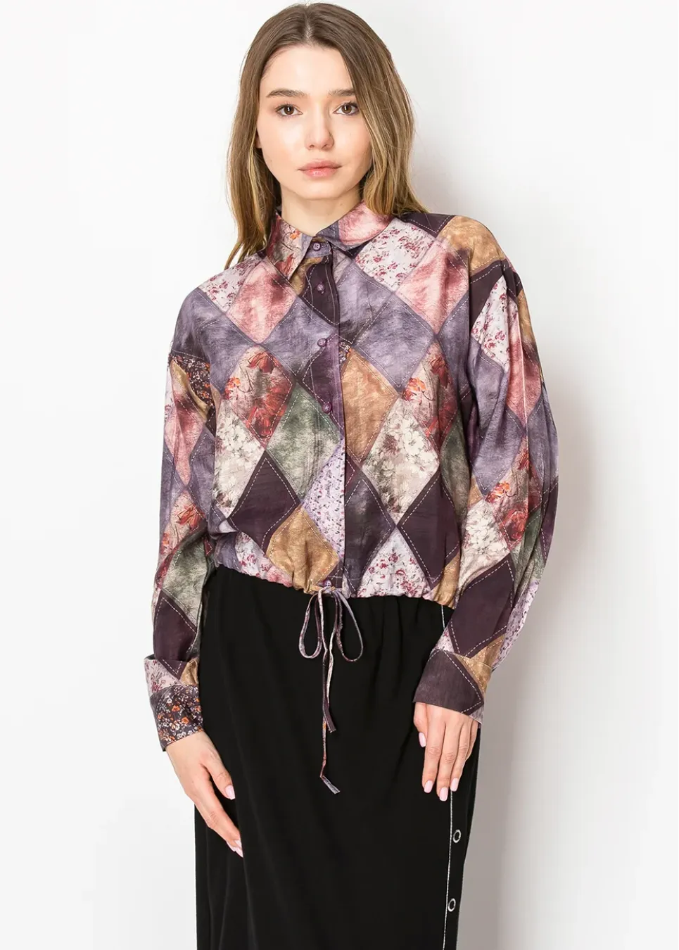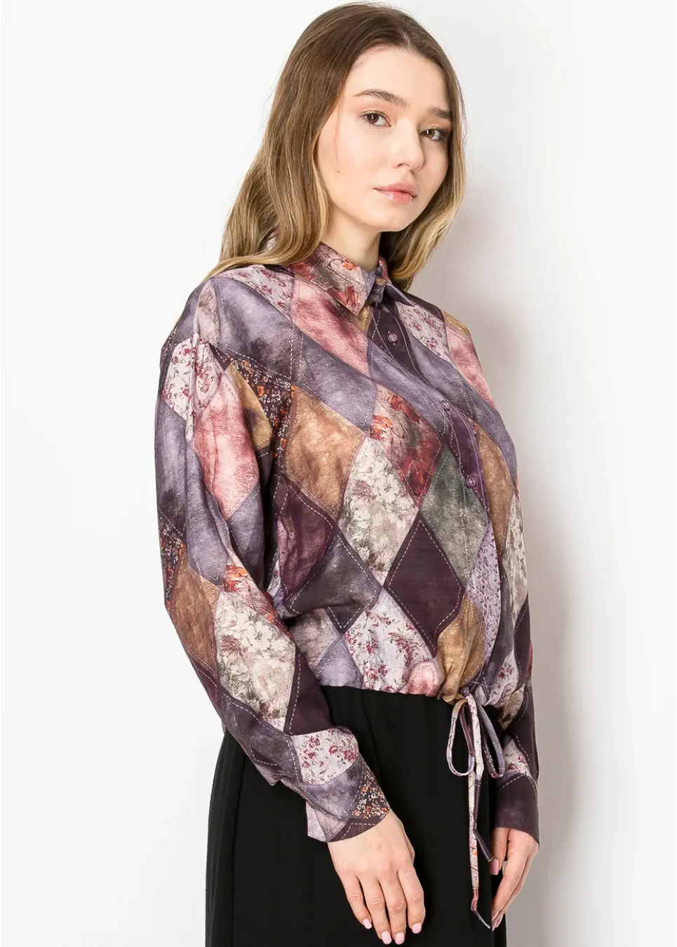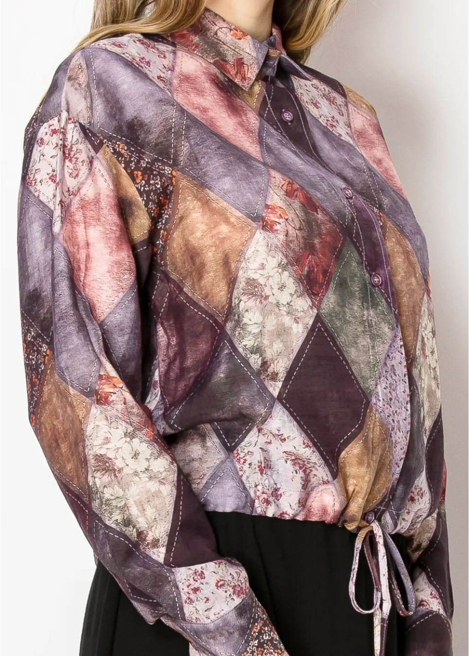 A blend of purple and floral patchwork creates a cozy, stylish vibe. The button-up front and adjustable hem make it versatile and easy to style for casual or dressy occasions.