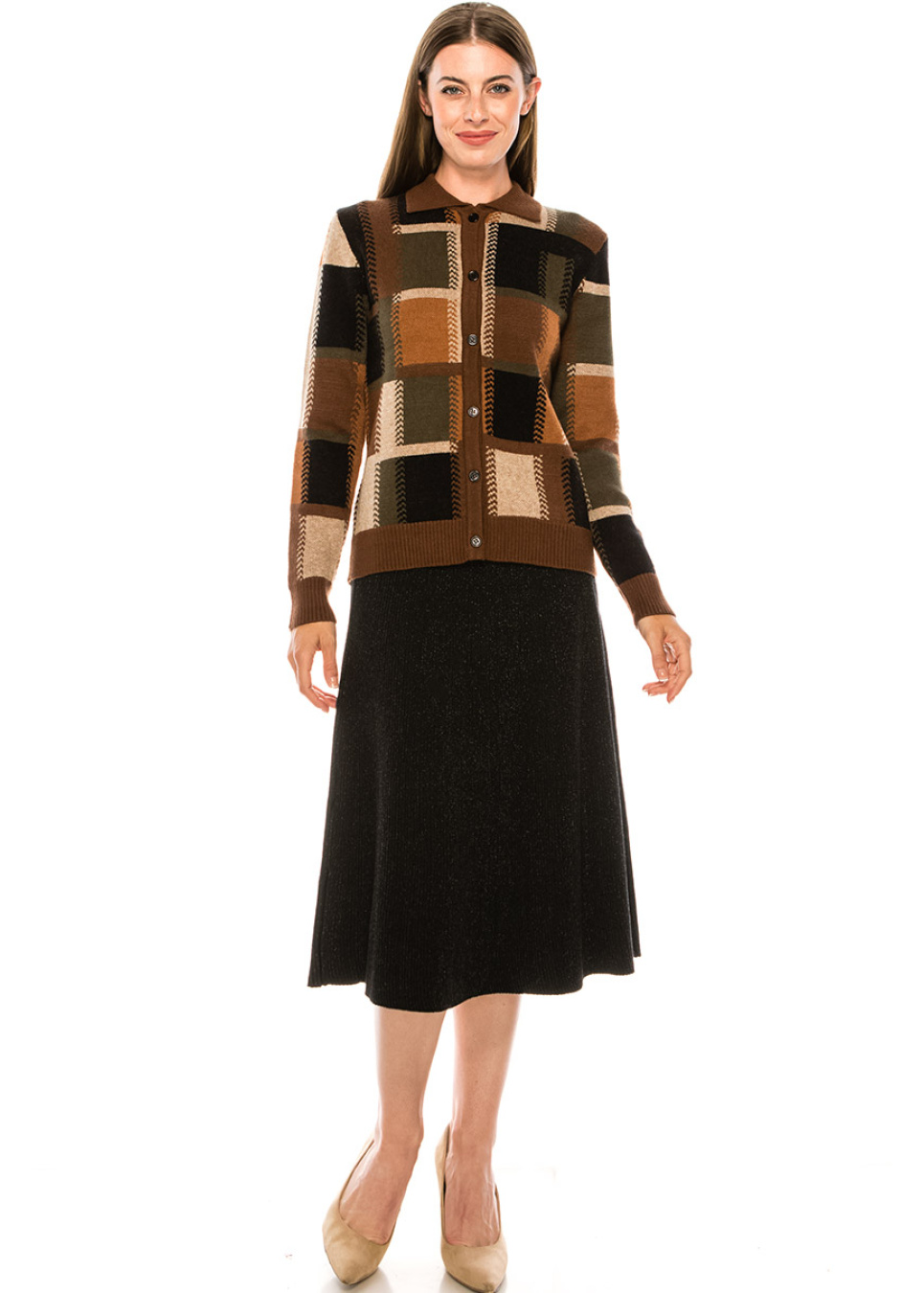 This cardigan is feminine in spirit and classic in style. Shirt-collar adds a casual look. The autumn color palette makes it the perfect match for this fall. The high-quality soft fabric will keep you cozy and warm.