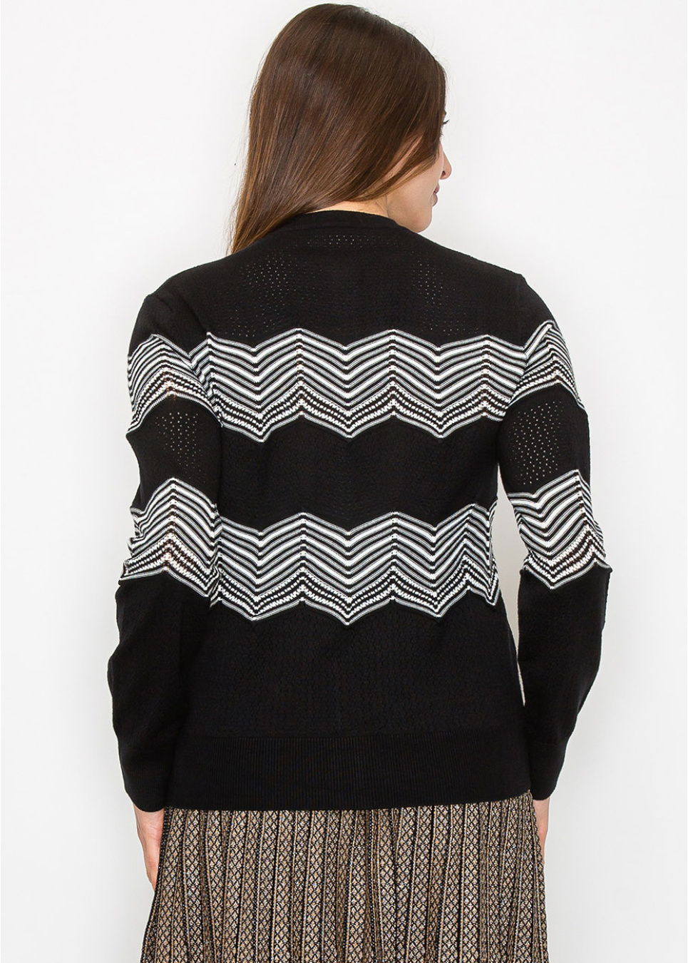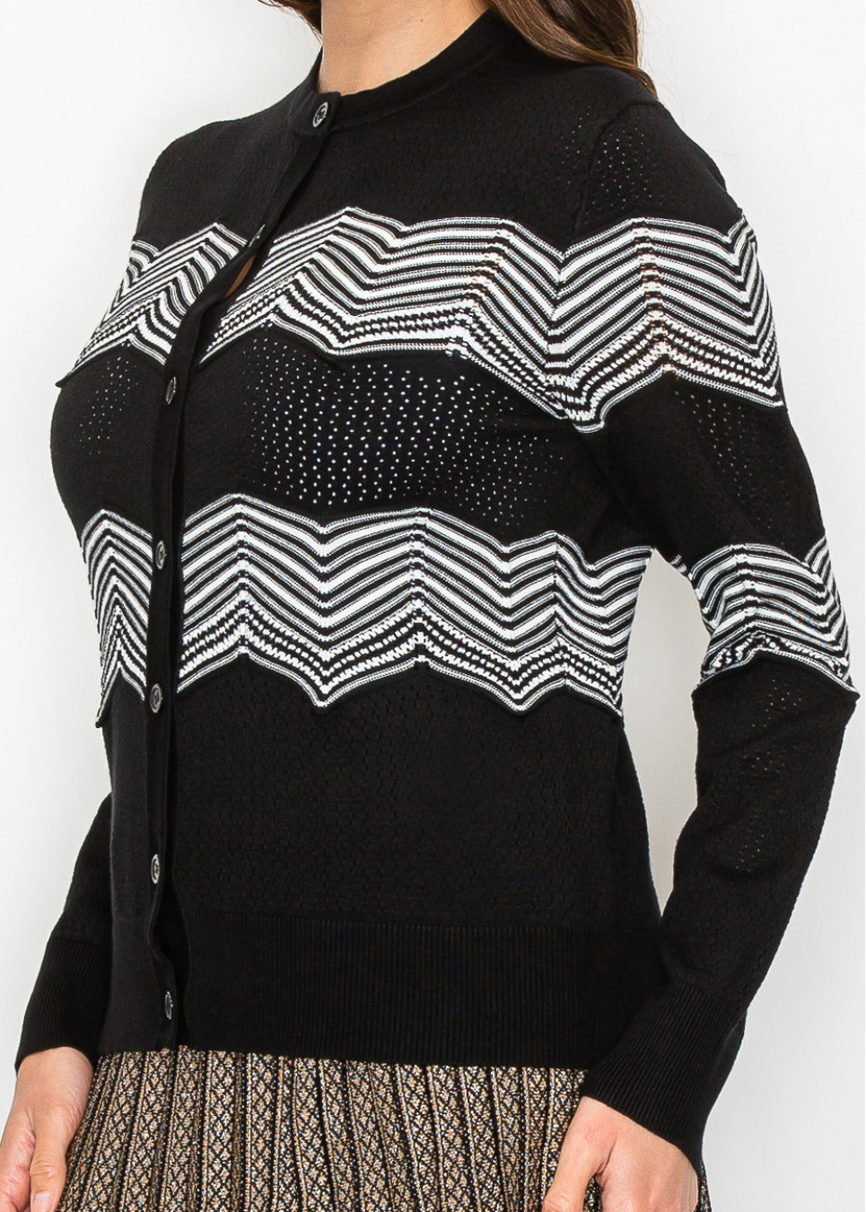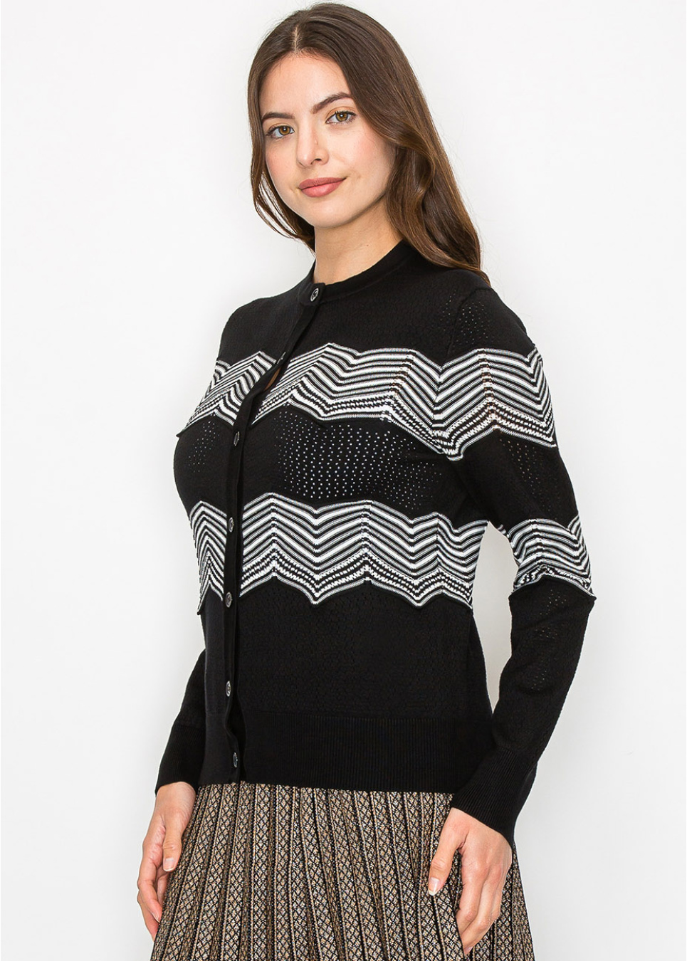 The playful chevron design brings a fun twist to this black cardigan, combining bold white stripes with a timeless button-down front. Perfect for layering over anything from casual tops to dresses, the soft knit fabric keeps you comfortable all day long. Whether you’re heading out or staying cozy indoors, this piece adds an extra spark to your look.