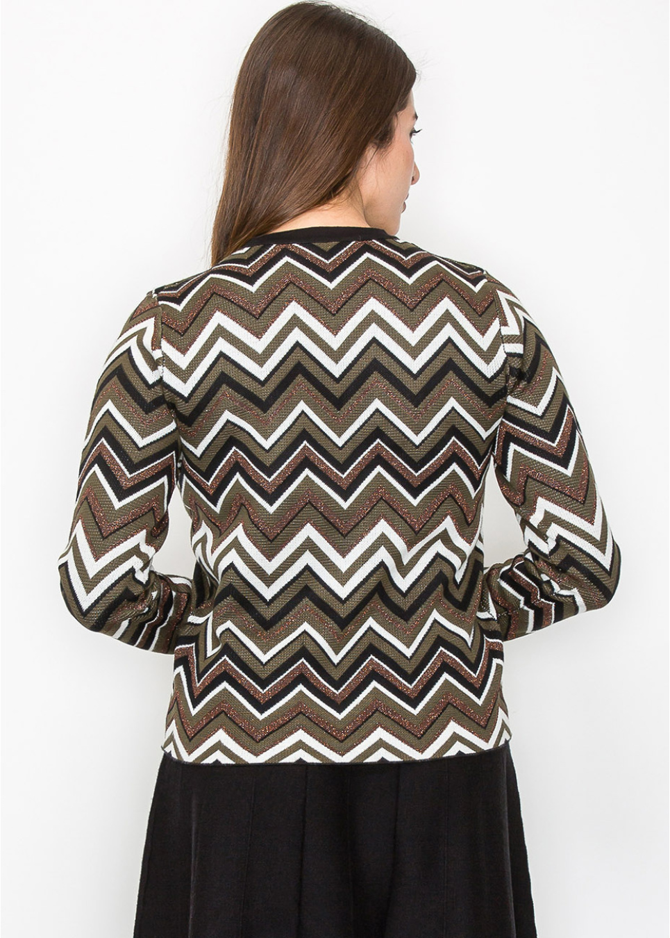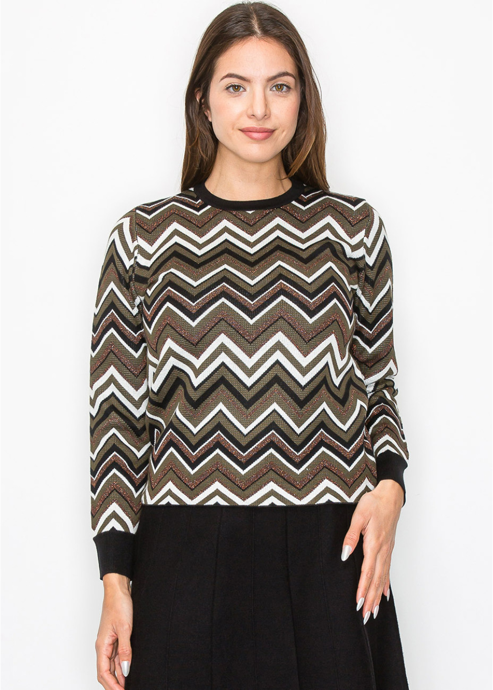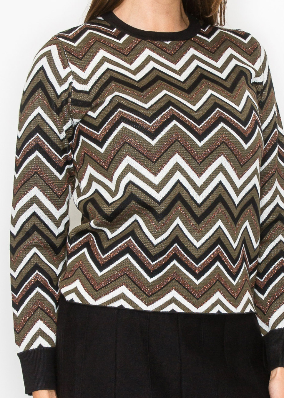 Featuring a bold chevron wave pattern in earthy hues, this sweater is perfect for adding a bit of interest to your outfit. The crew neckline and long sleeves ensure a modest fit, while the intricate pattern brings a touch of personality to your style. Ideal for cool days when you want to stay warm without sacrificing style.