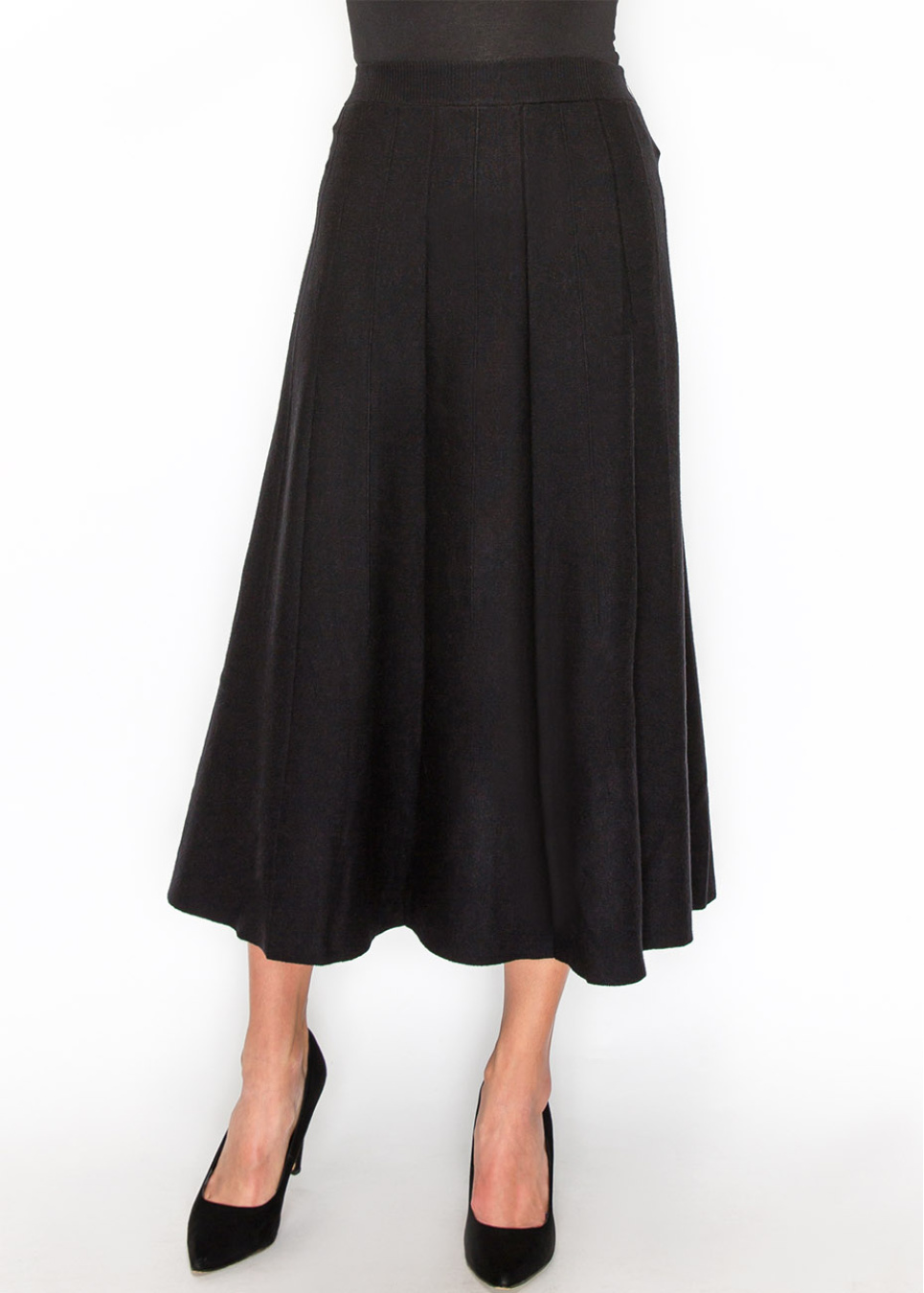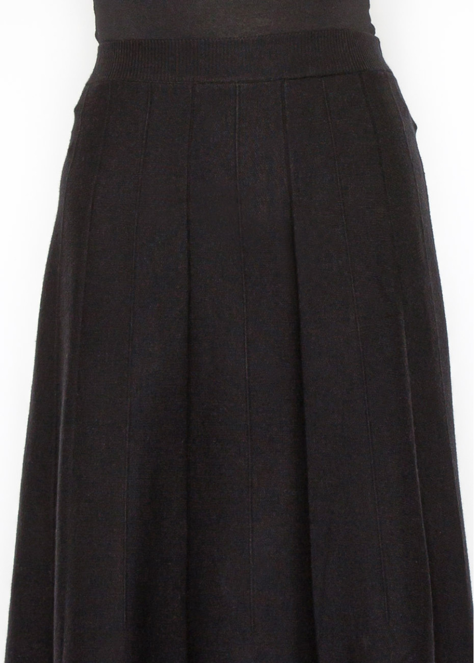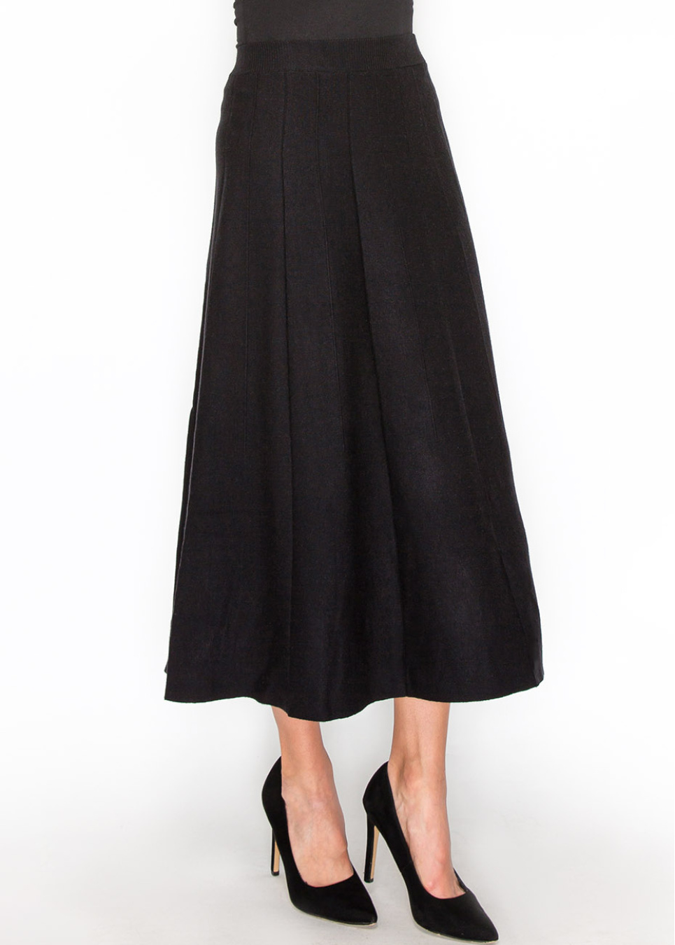 This classic black midi skirt features soft pleats that create a timeless silhouette. Perfect for any occasion, this versatile piece pairs effortlessly with any top in your wardrobe.