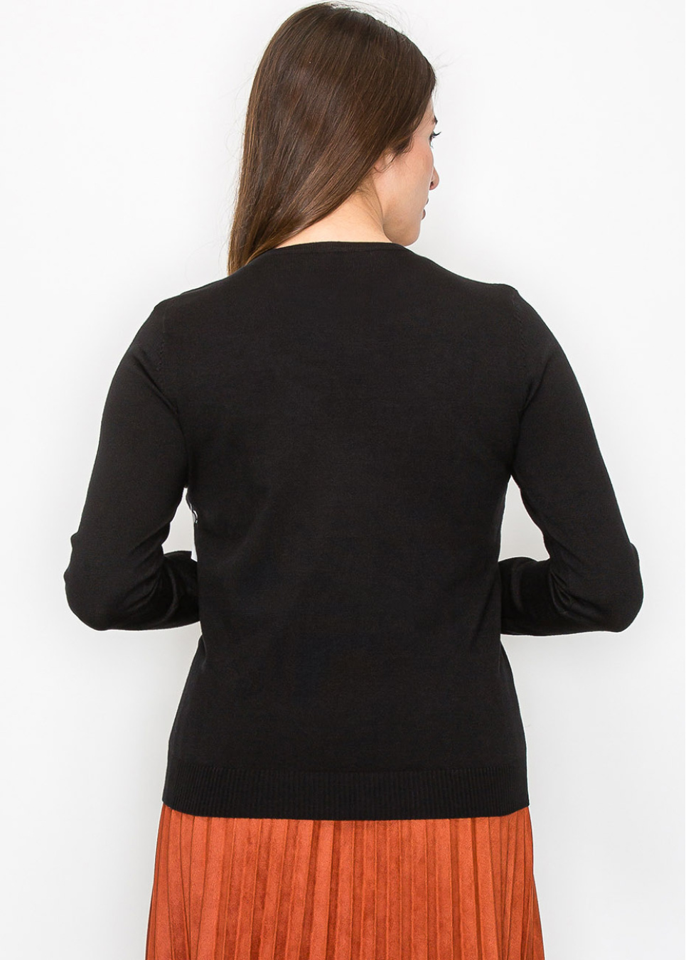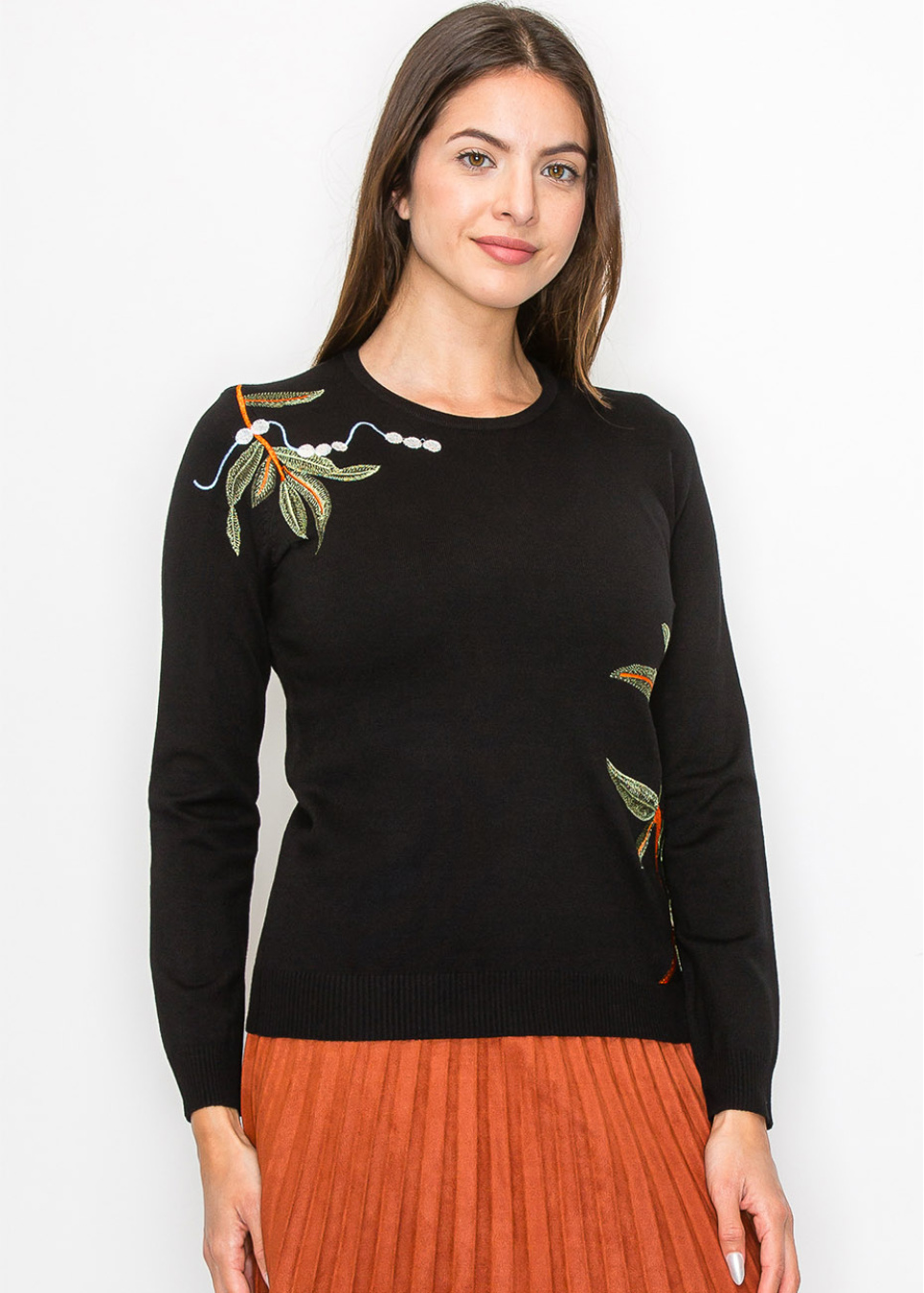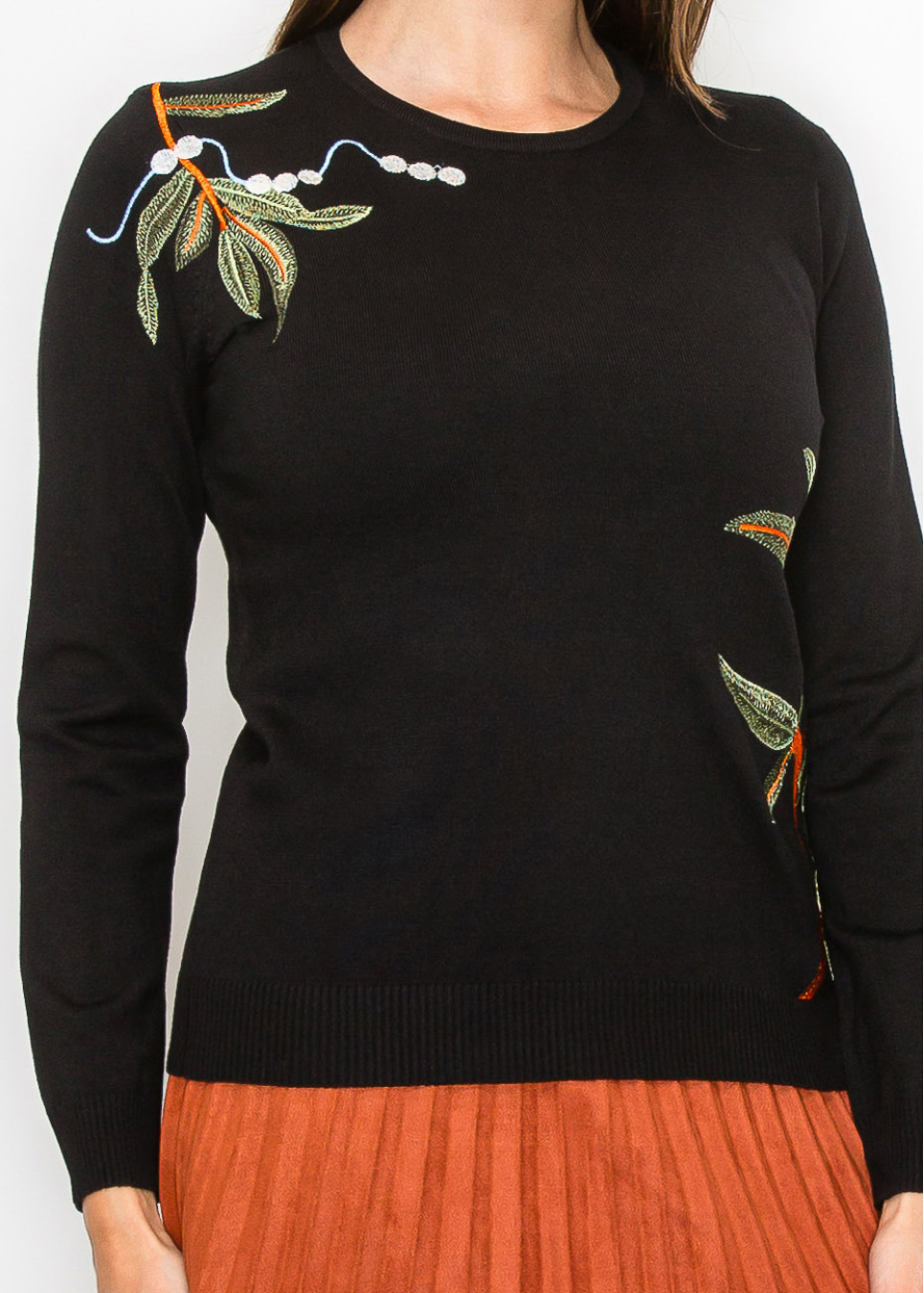 Add a pop of color to your wardrobe with this classic black sweater, featuring colorful leaf embroidery. The unique design provides a perfect blend of traditional and contemporary style, ideal for layering or wearing on its own.