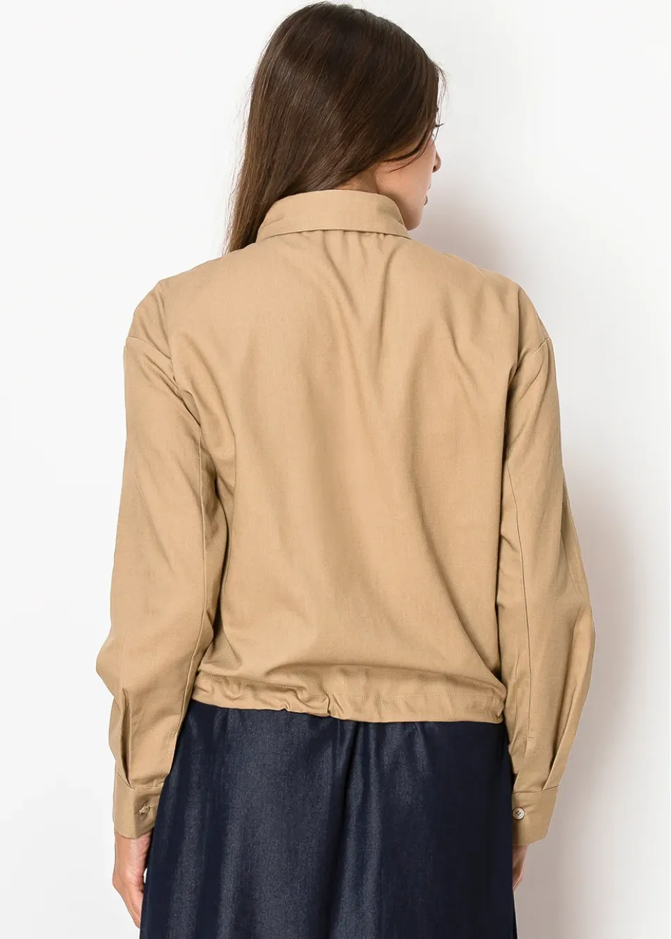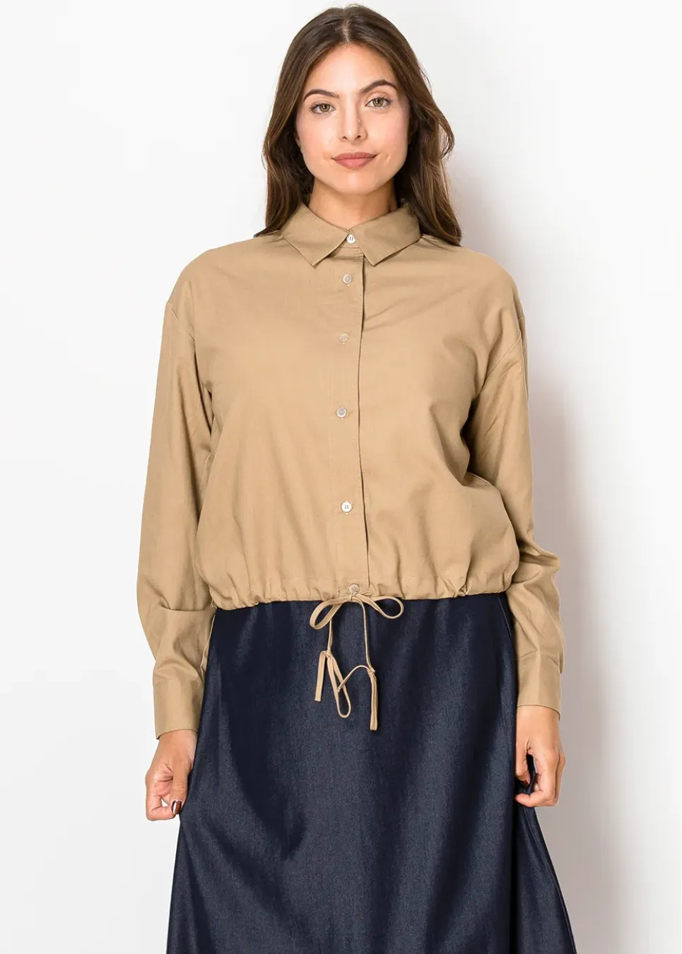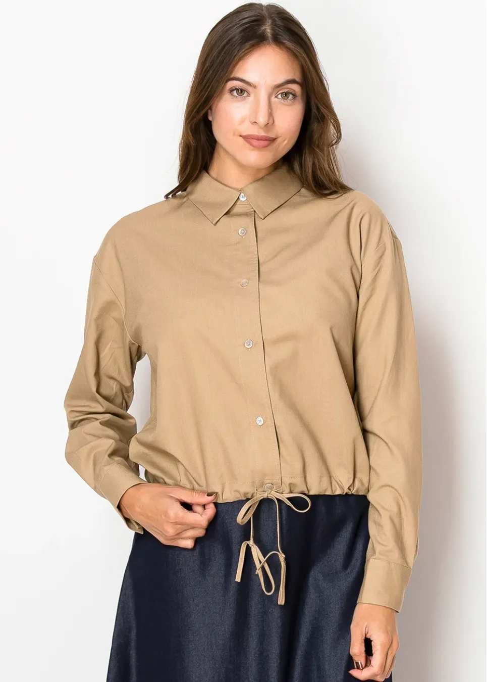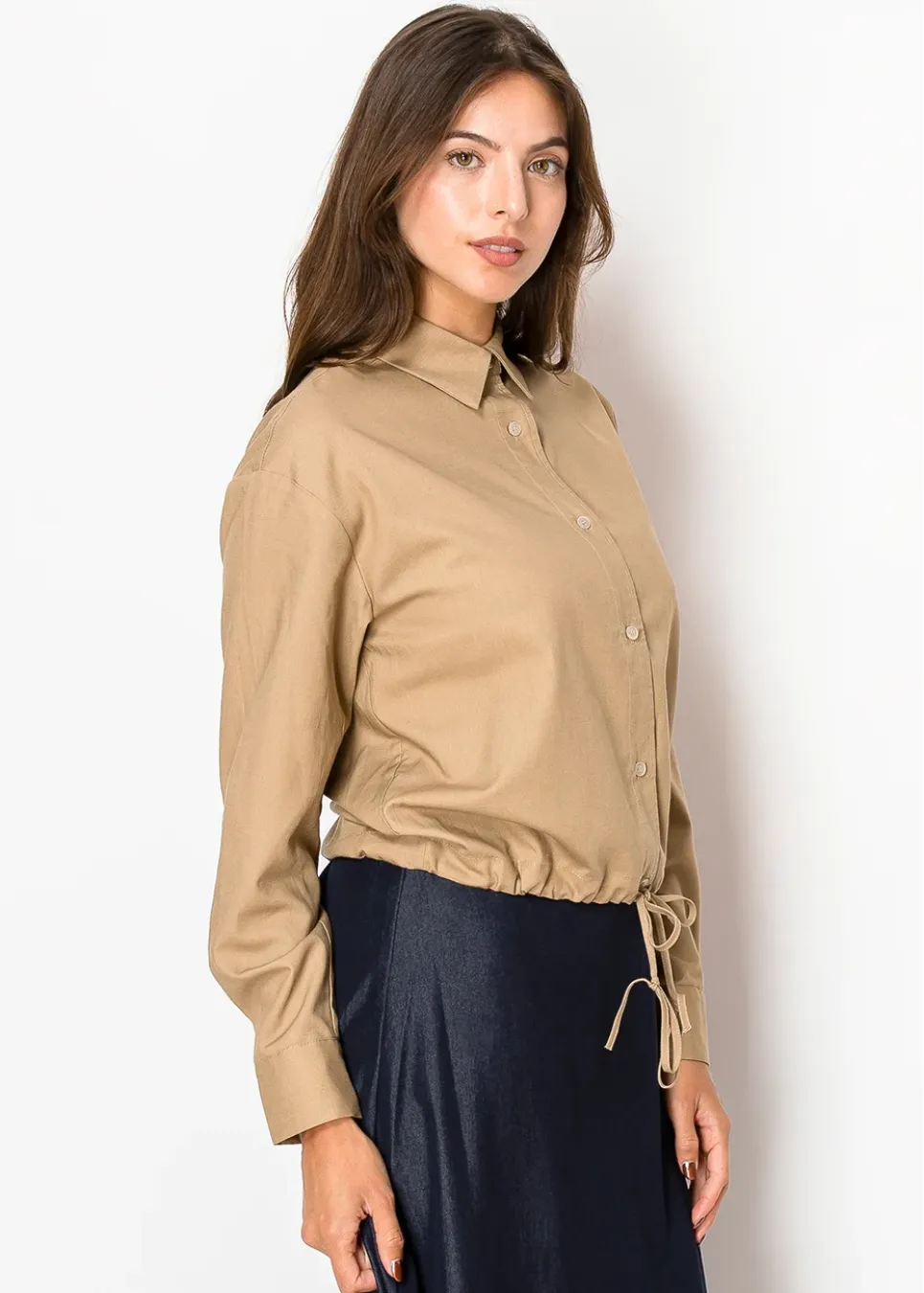 A timeless piece for modern wardrobes. This camel linen shirt is lightweight and breathable, with a relaxed fit enhanced by the tie hem. The neutral tone and clean lines make it ideal for layering or wearing solo for an understated yet elegant look.