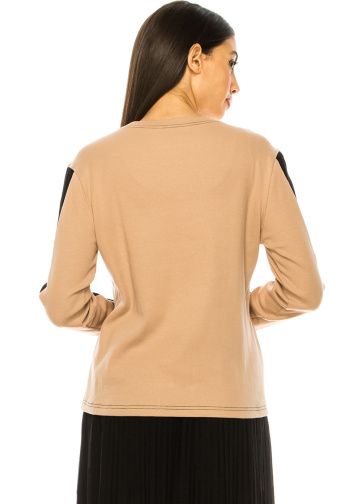 Behold the beauty of this exquisite long sleeve t-shirt in a stunning camel shade with black stripe details on the sleeves. The loose fit provides a relaxed and comfortable feel, while the soft and lightweight fabric feels like a gentle caress against the skin. Perfect for any occasion, this t-shirt is a masterpiece of modest fashion.