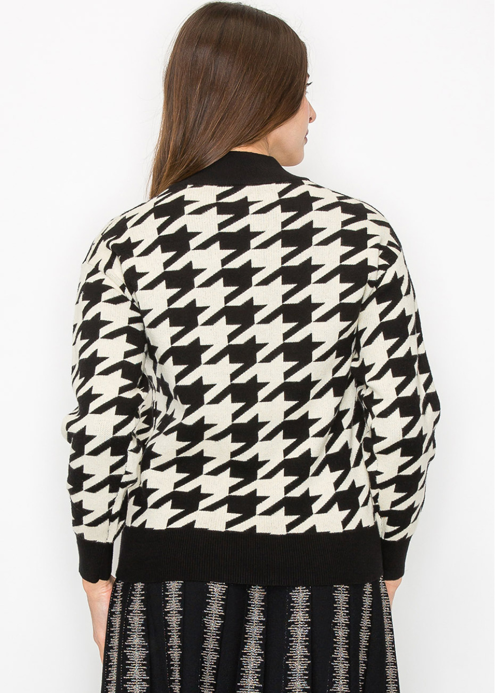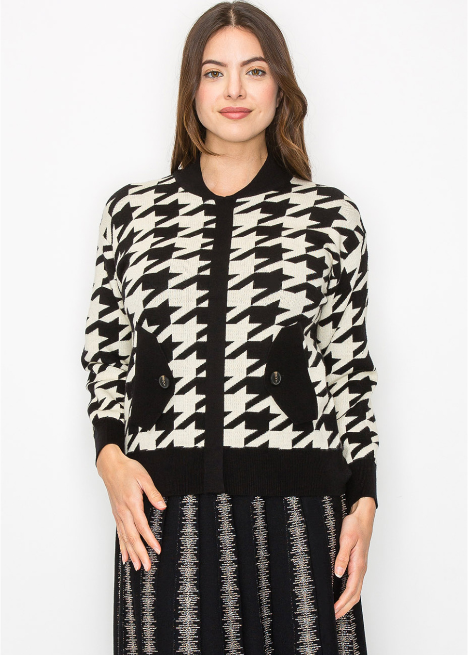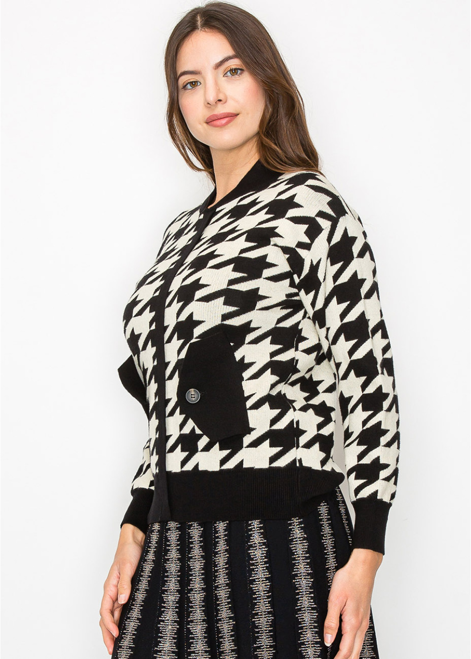 A modern take on a classic print, this houndstooth knit cardigan combines bold design with functional details. The black buttoned pockets add an extra layer of convenience and style, while the soft knit fabric ensures a comfortable fit for all-day wear.