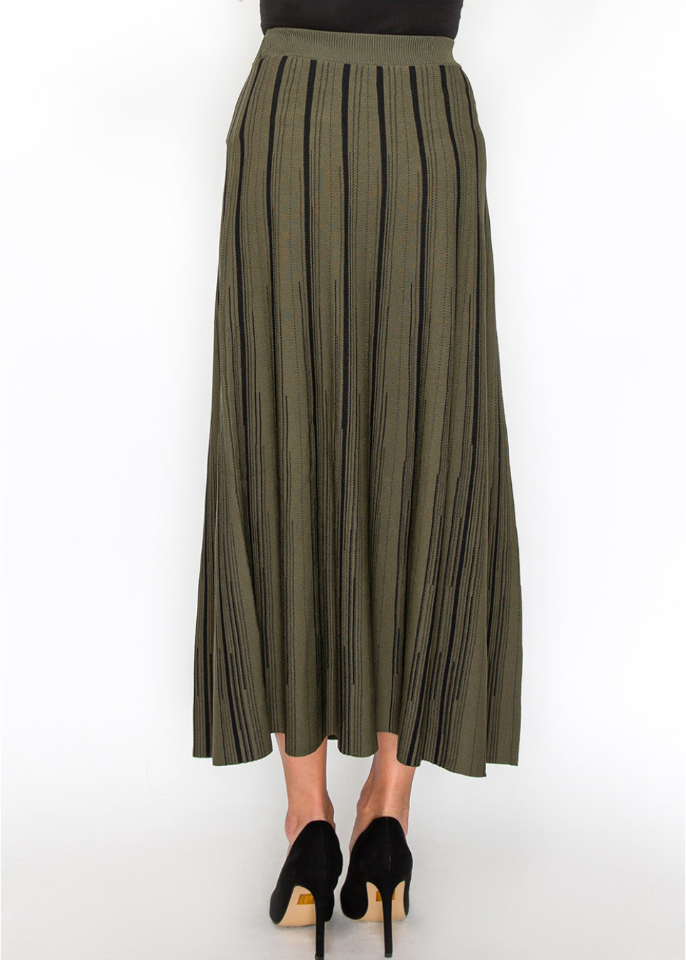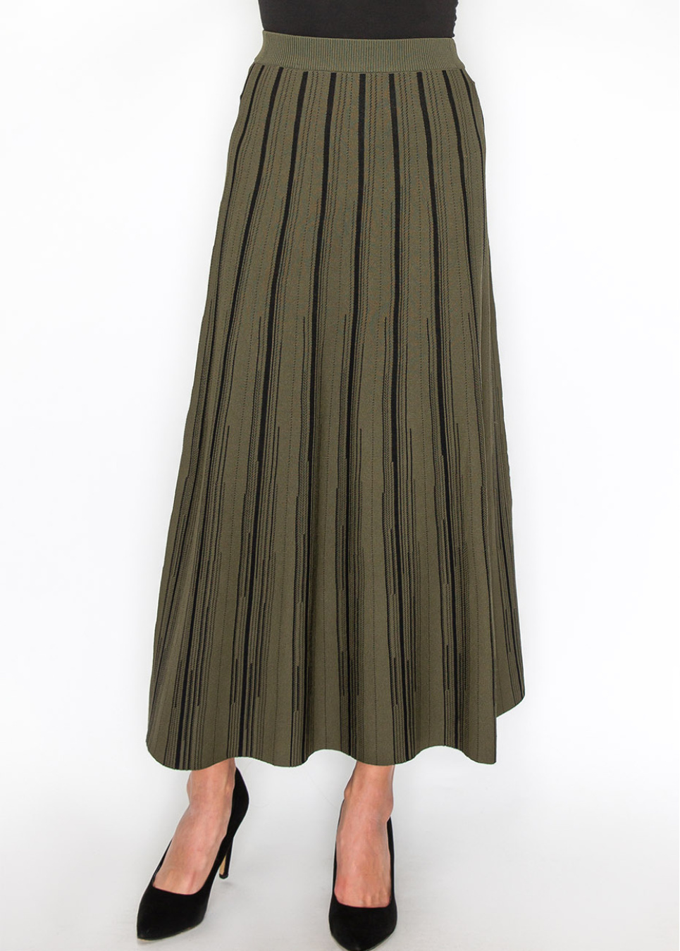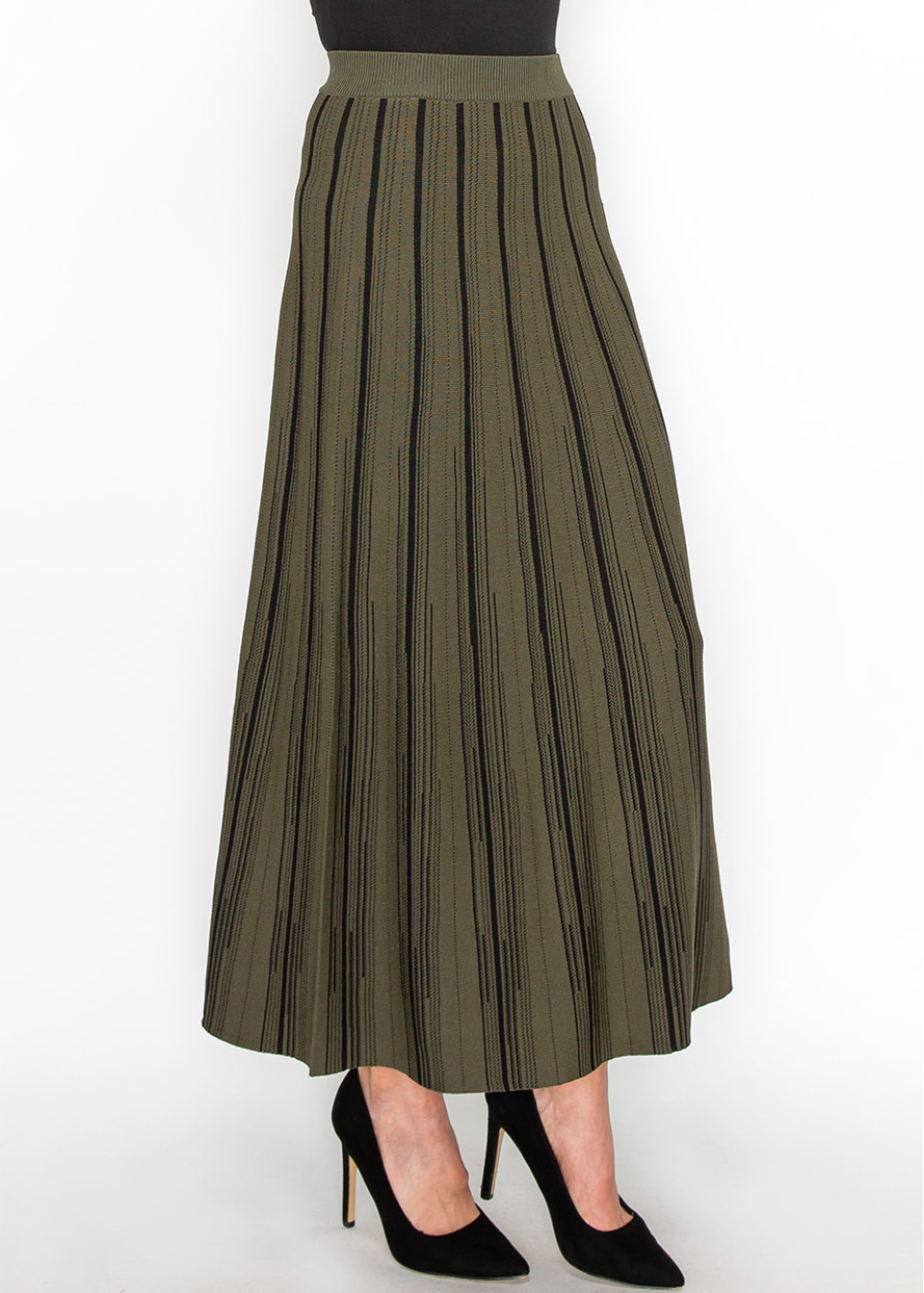 Sometimes, less is more. This striped midi skirt exemplifies that philosophy with its clean lines and straightforward design. The vertical stripes create a slimming effect, while the olive tone adds a touch of earthy elegance. Perfect for any occasion, this skirt is a staple piece that you’ll reach for time and again.
