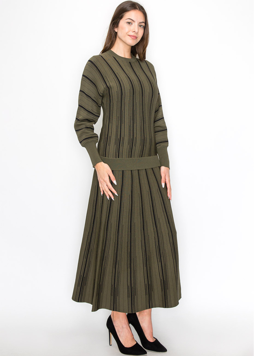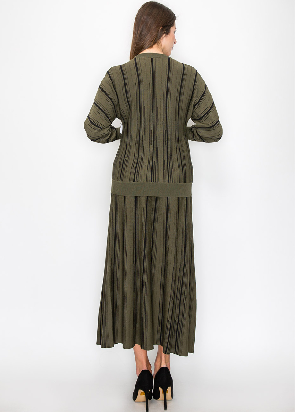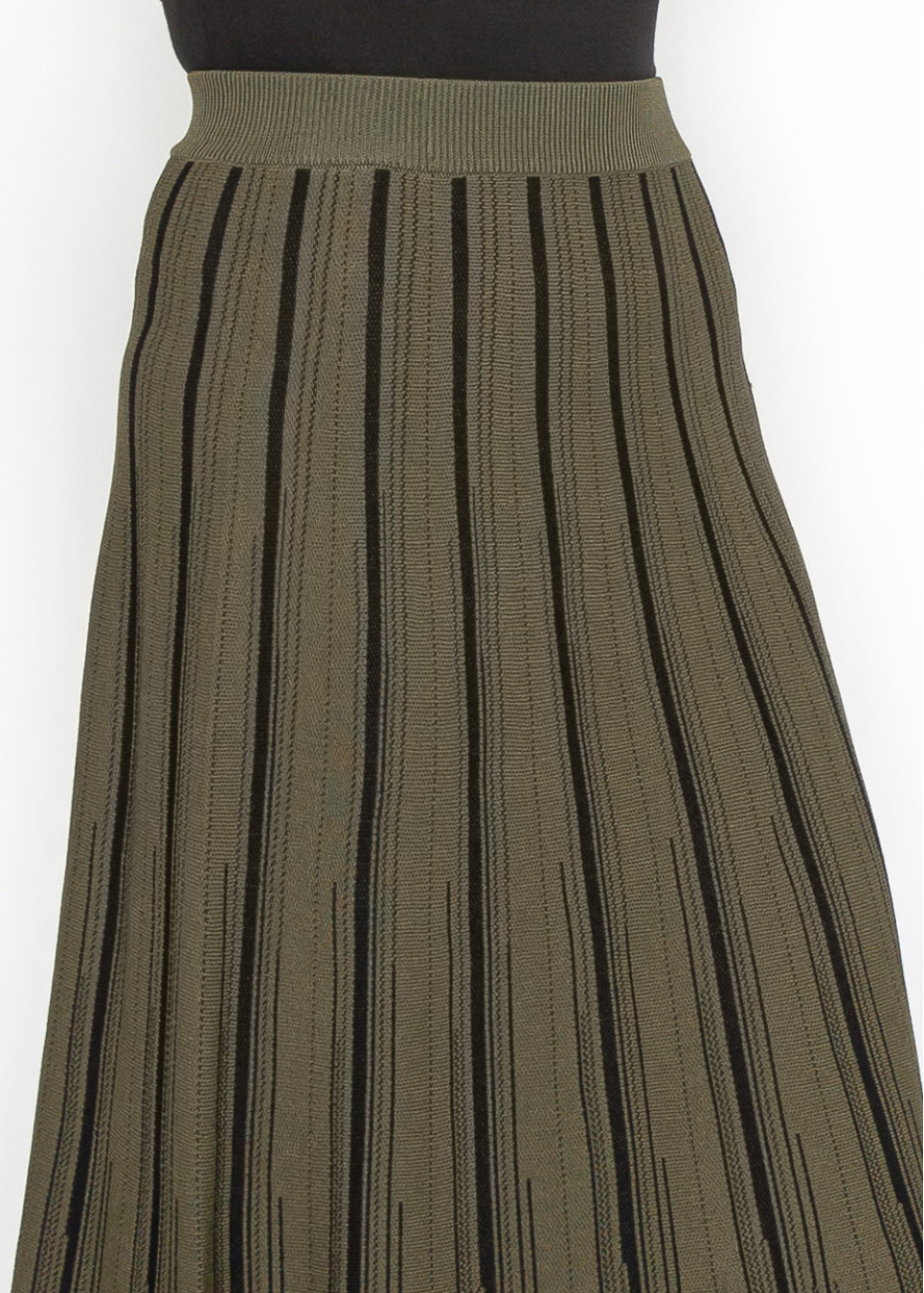 Sometimes, less is more. This striped midi skirt exemplifies that philosophy with its clean lines and straightforward design. The vertical stripes create a slimming effect, while the olive tone adds a touch of earthy elegance. Perfect for any occasion, this skirt is a staple piece that you’ll reach for time and again.