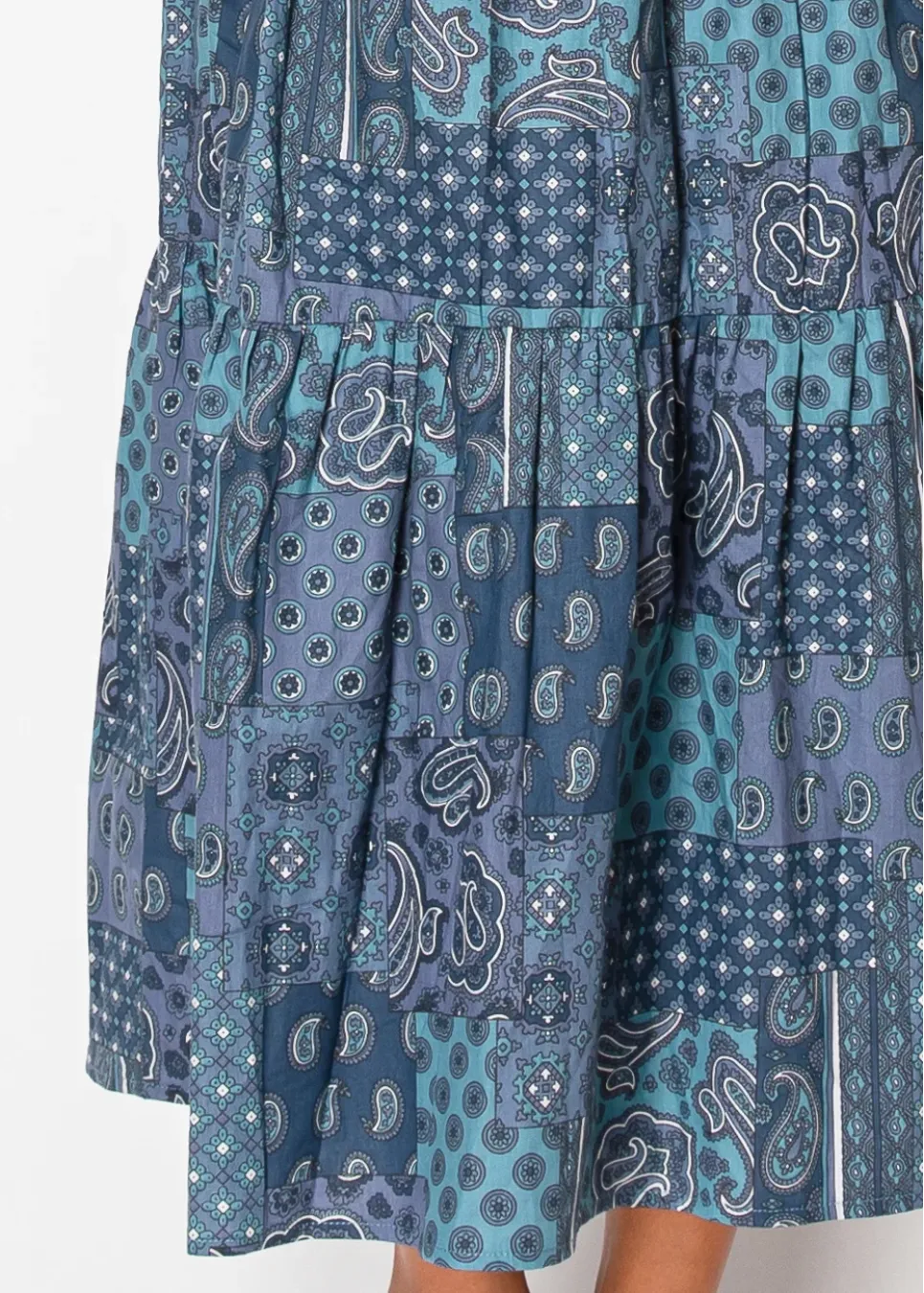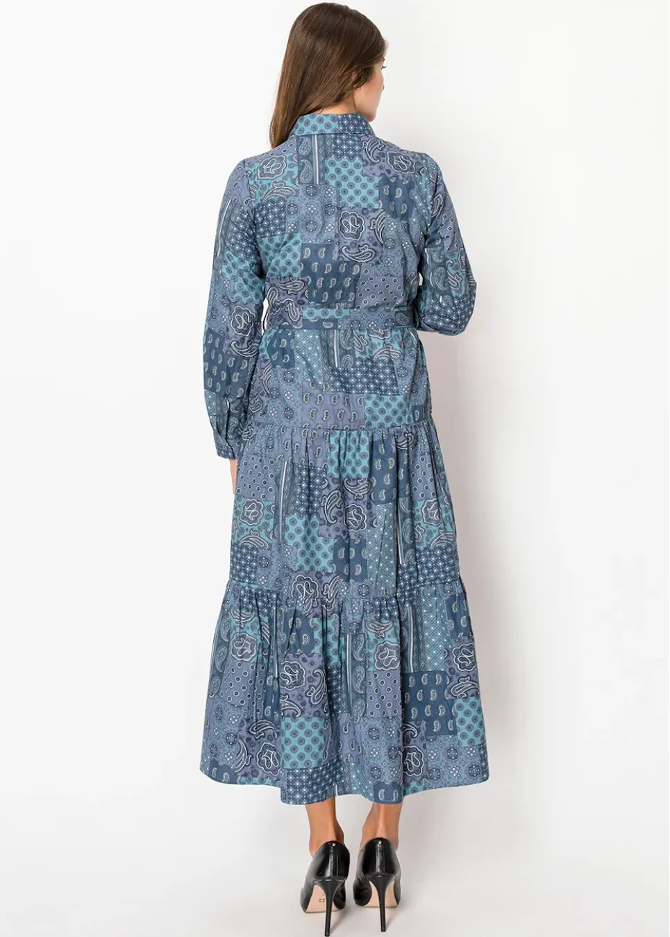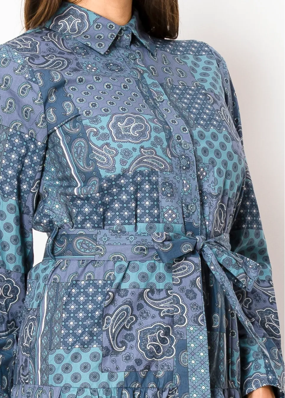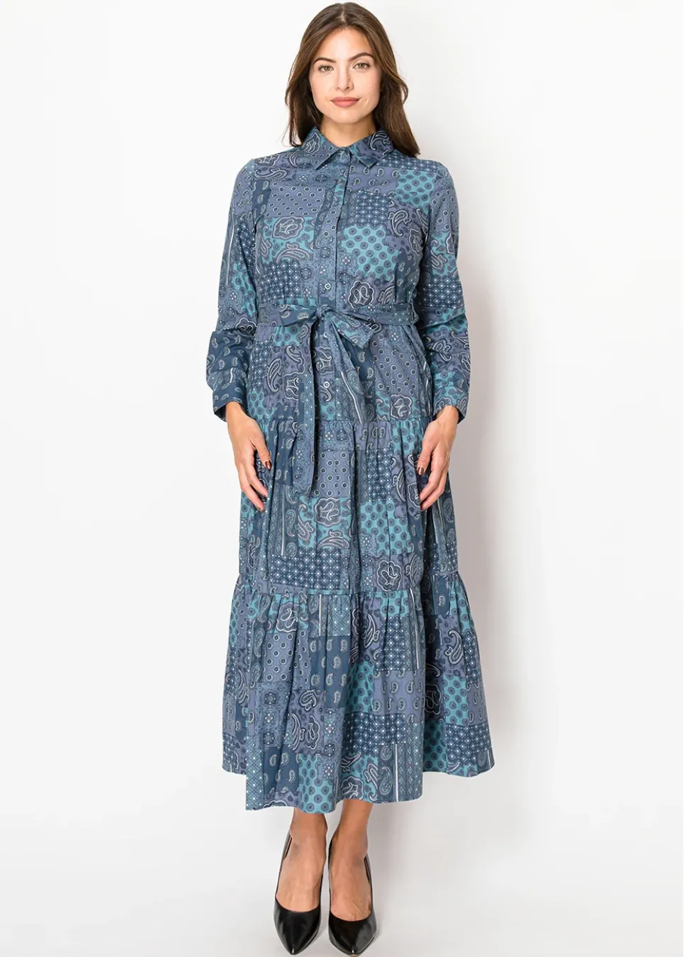 Featuring a blend of intricate patterns in teal and navy, this shirtdress is both unique and elegant. The tailored fit and full-length skirt make it ideal for modest, everyday wear.