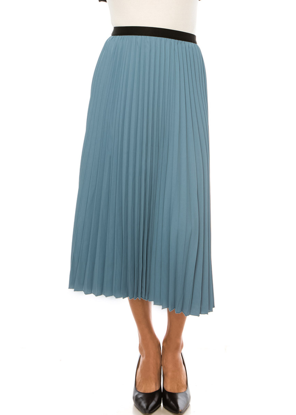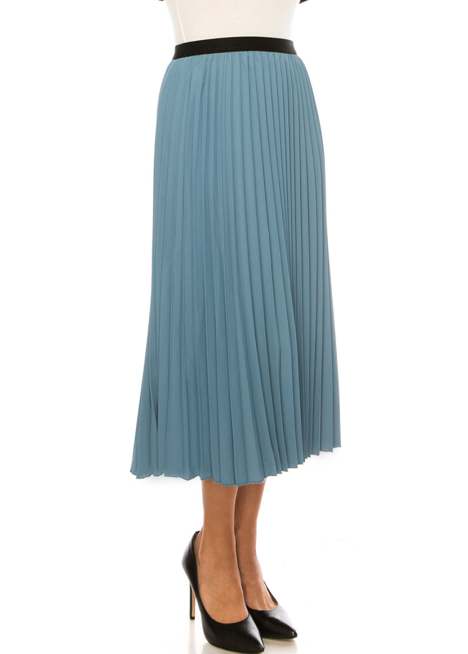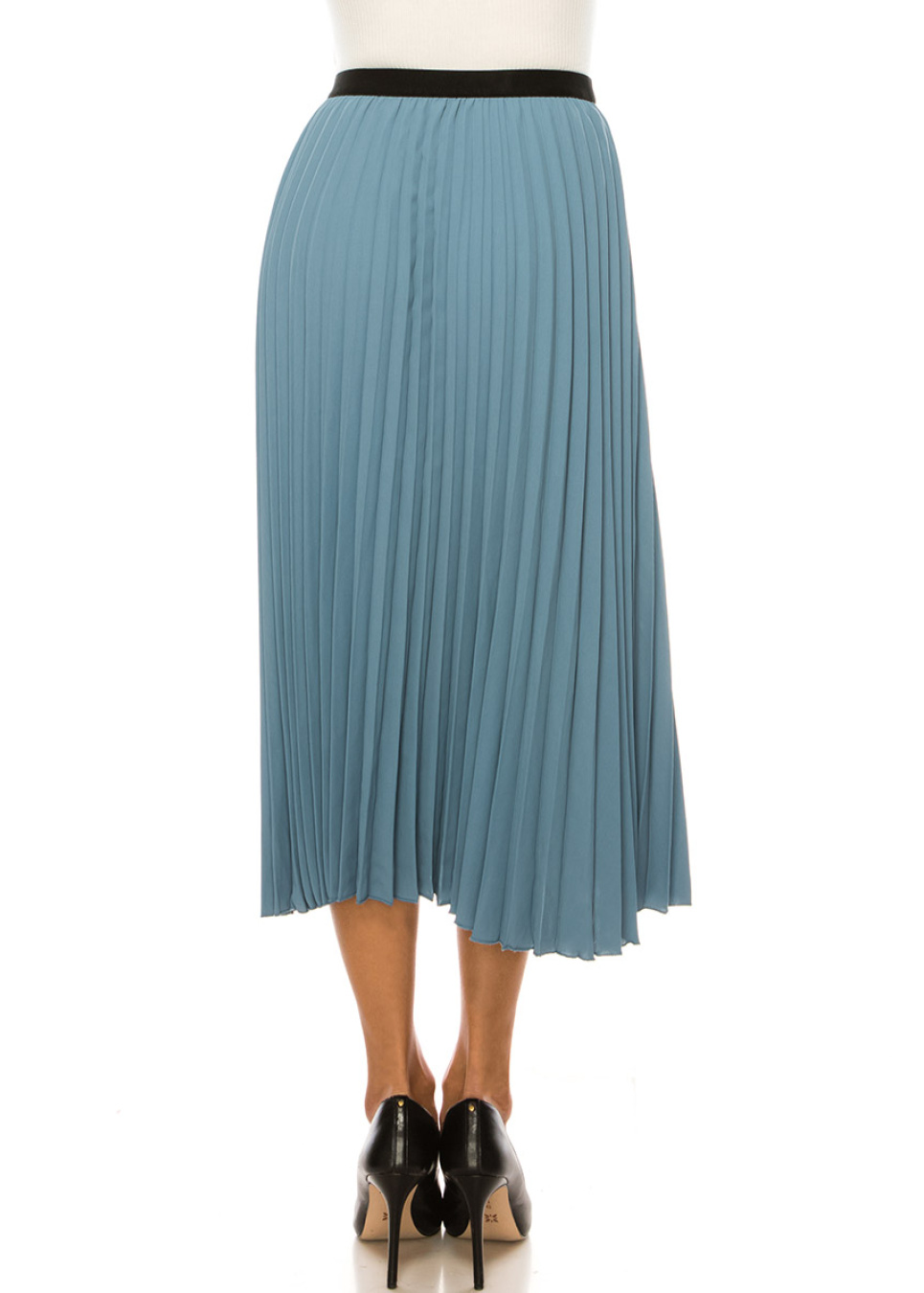 Make a stylish statement with this blue midi skirt. The soft fabric and pleated design create a modest and comfortable look, while the elastic black waistband adds a touch of edgy flair. This versatile piece is a must-have addition to your wardrobe.