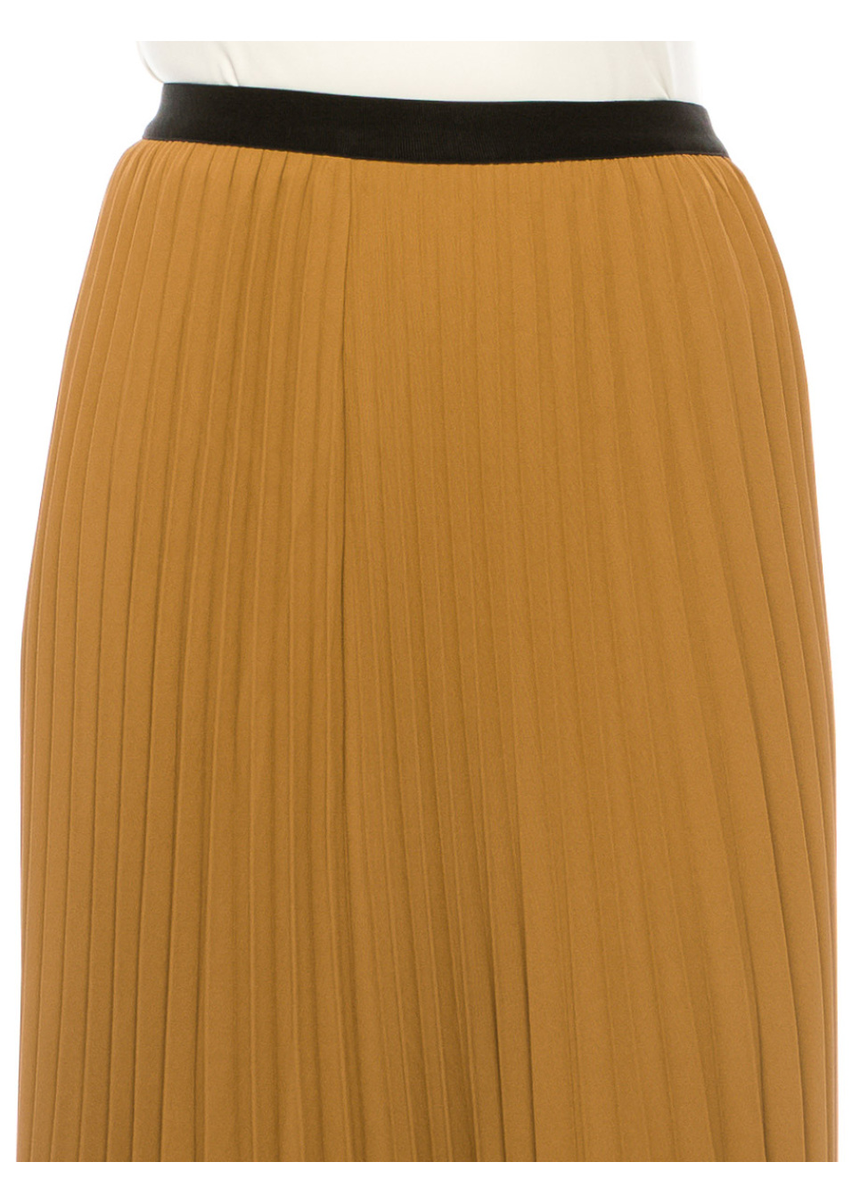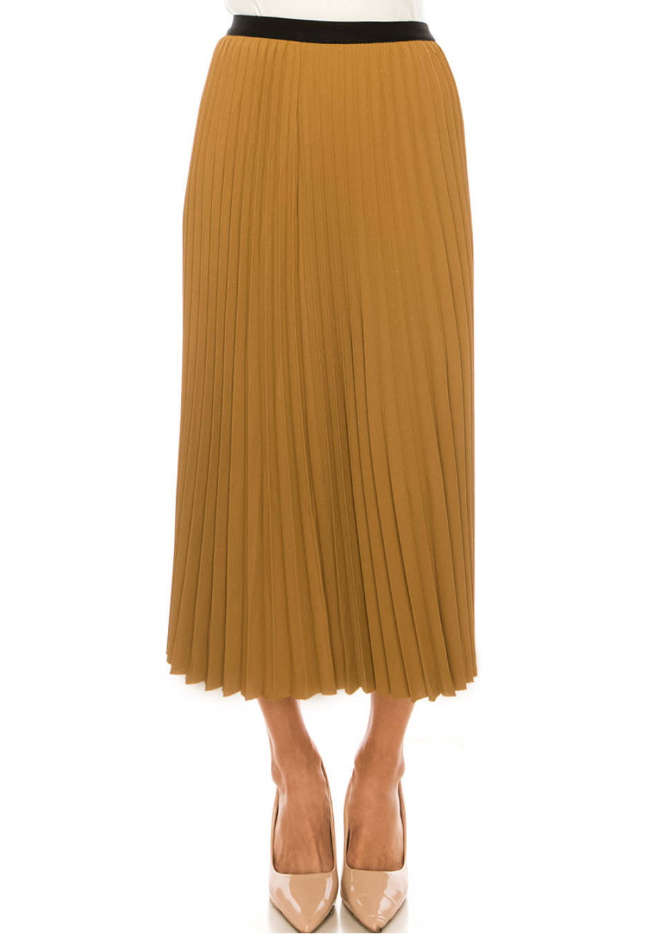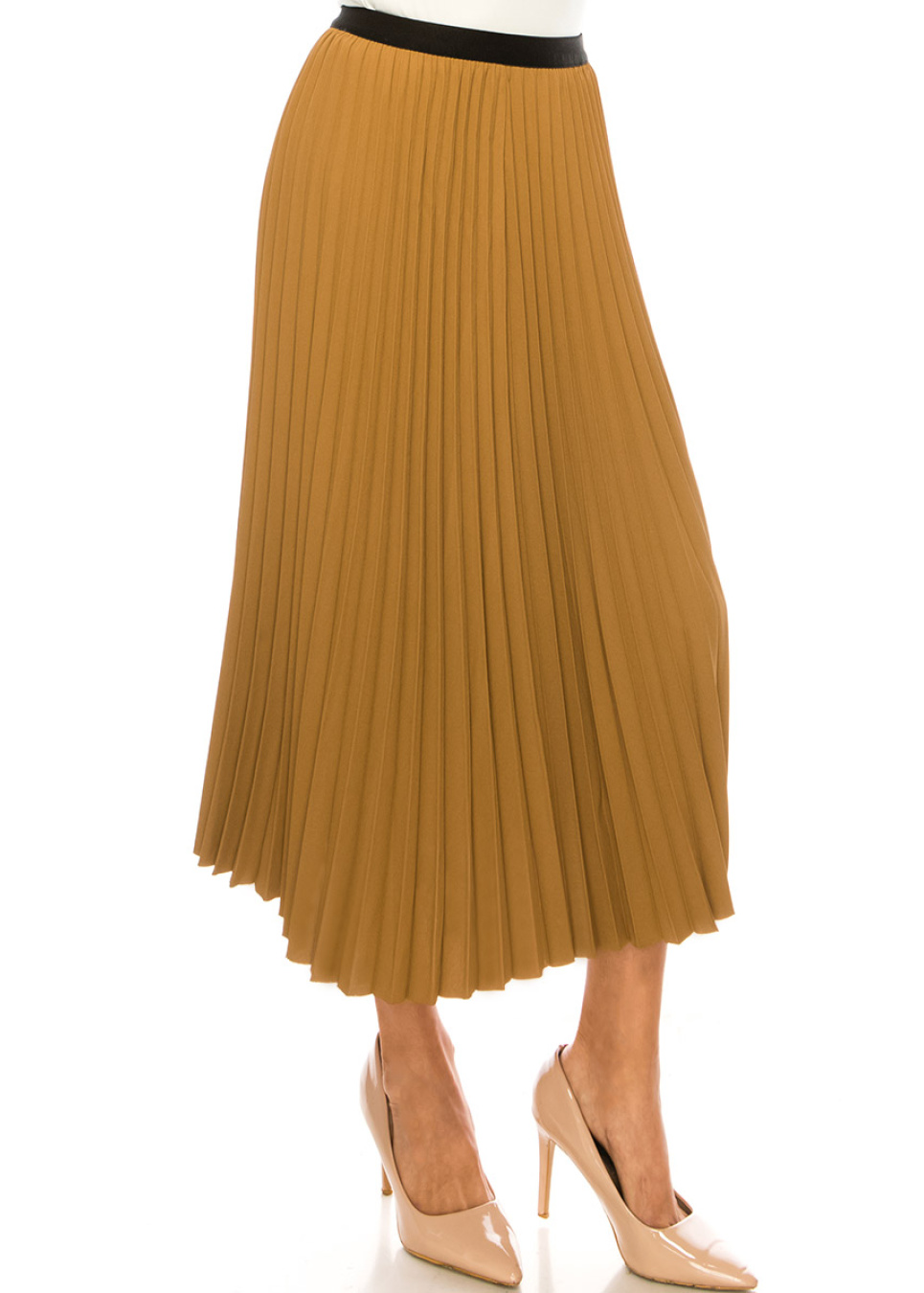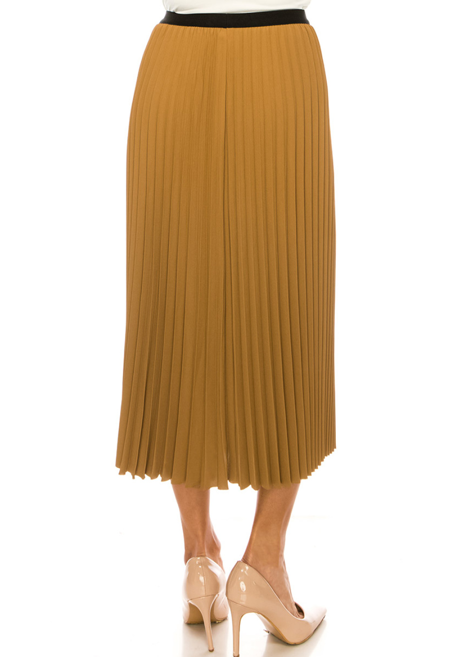 You'll feel stylish and comfortable in this chic camel pleated skirt. The modest design and soft fabric make it perfect for everyday wear, while the elastic black waistband provides a secure and comfortable fit. This versatile piece is a must-have for any fashion-forward wardrobe.