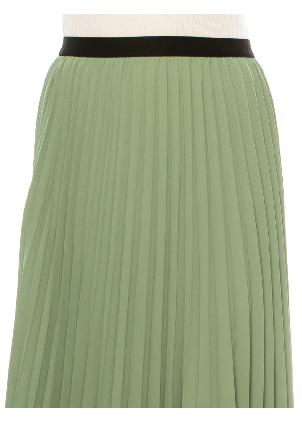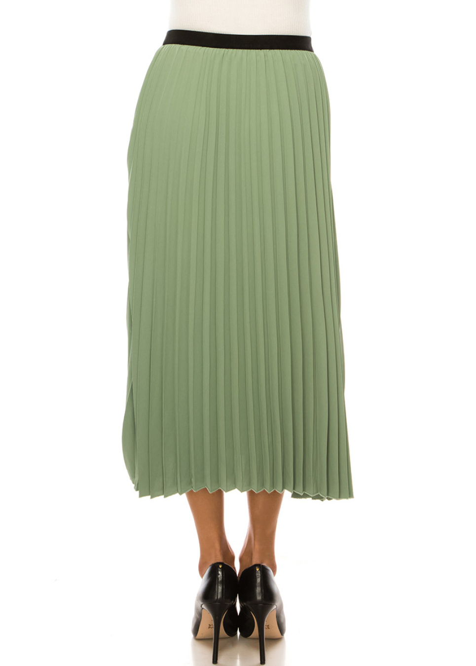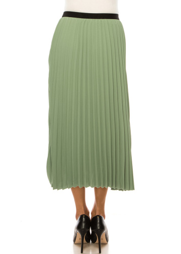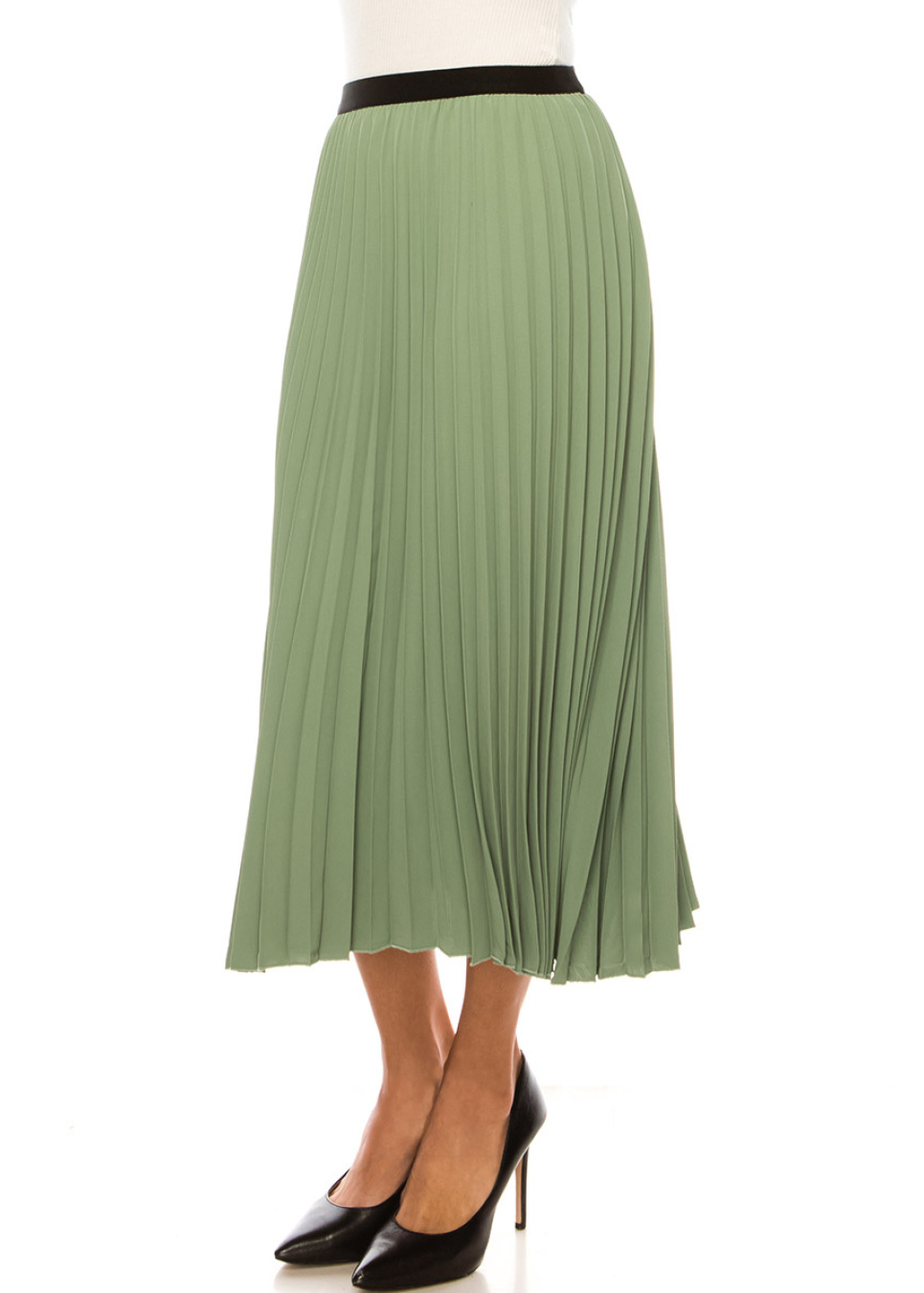 Our mint pleated midi skirt with a black elastic waistband is a stylish and comfortable choice for any occasion. The pleated design adds sophistication to your outfit, while the midi length is both practical and fashionable. Made from high-quality materials, this skirt is both durable and comfortable, ensuring it lasts you through many fashionable seasons. Add a pop of color to your wardrobe with this versatile and chic skirt.