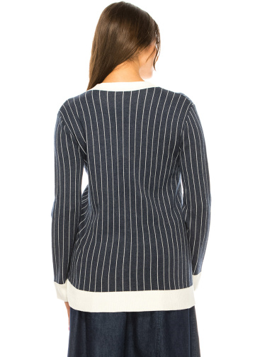 Stay stylish and comfortable with YAL New York's navy striped cardigan. Made with soft and high-quality fabric, this cardigan is perfect for dressing up or down. The striped pattern and white highlighted edges add a touch of class, while the button closure ensures a perfect fit every time. Add it to your modest wardrobe for a versatile and chic look.