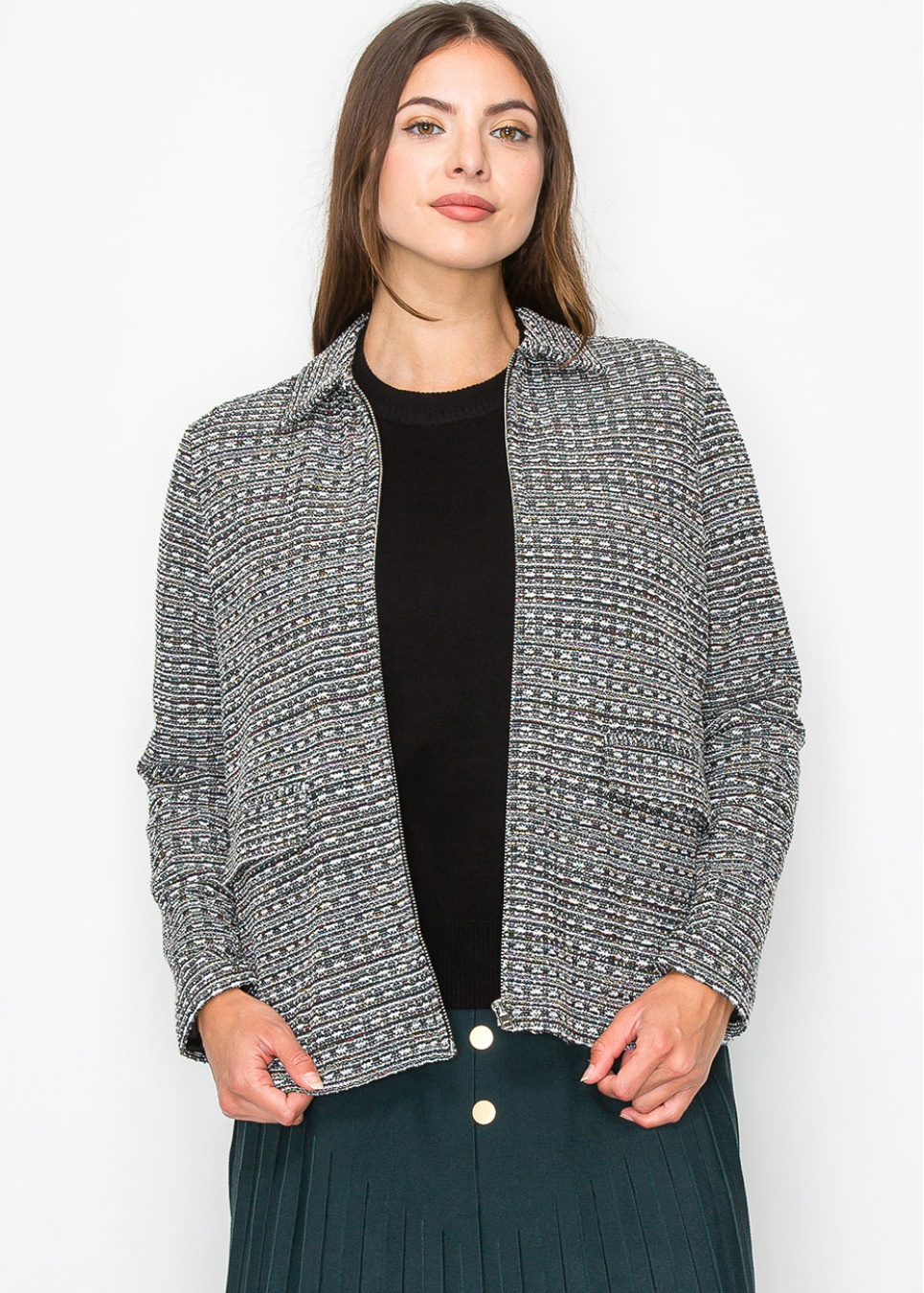 Stay warm and stylish with this patterned knit jacket. The classic collar and sleek, open-front design make it an excellent addition to your layering pieces. The subtle mix of black and gray tones ensures that this jacket pairs well with many outfit combinations, giving you both versatility and sophistication.