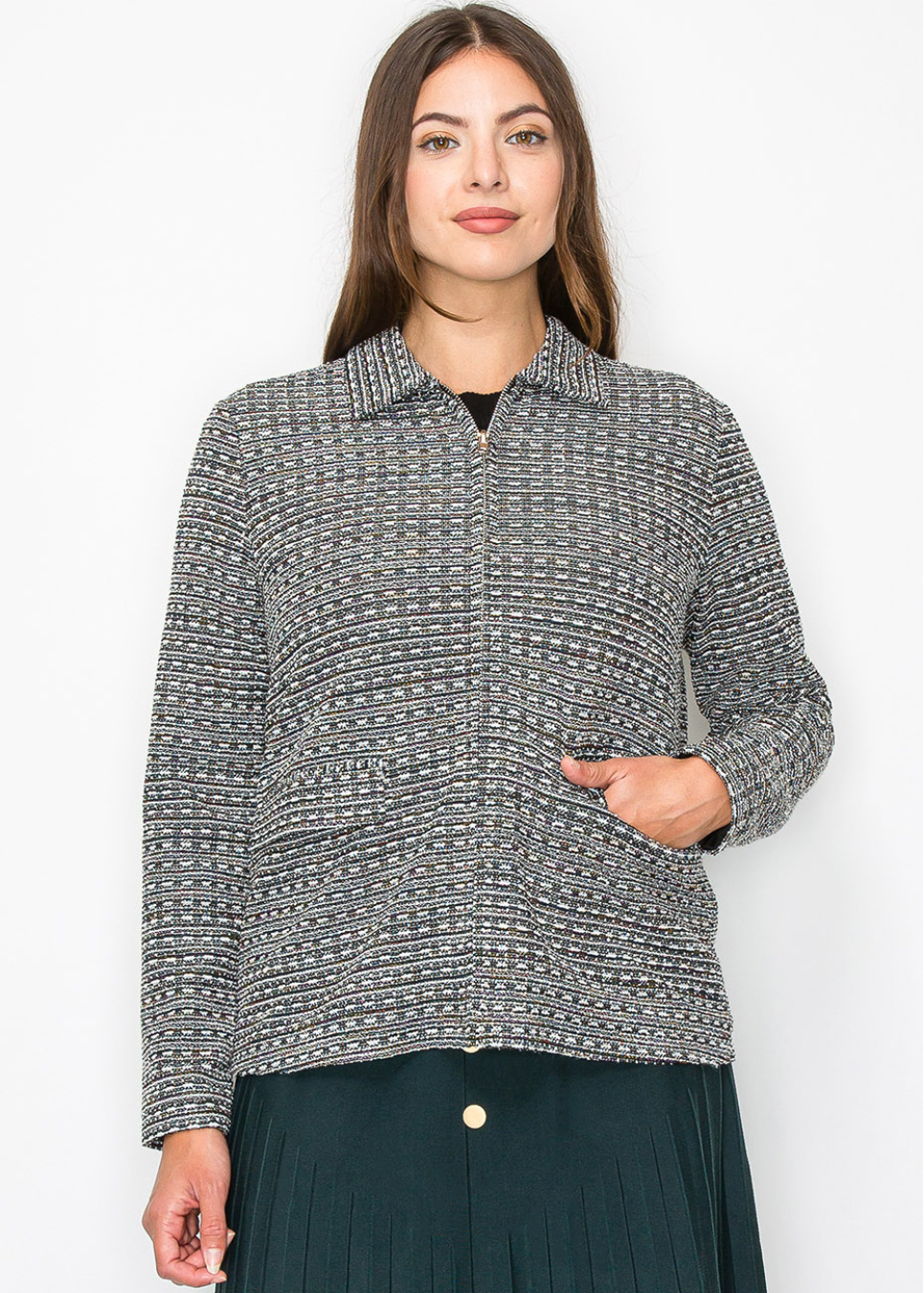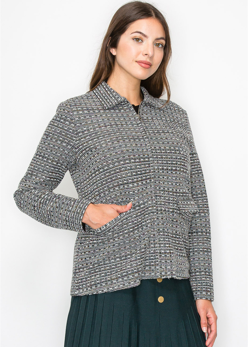 Collared Knit Jacket with Geometric Pattern