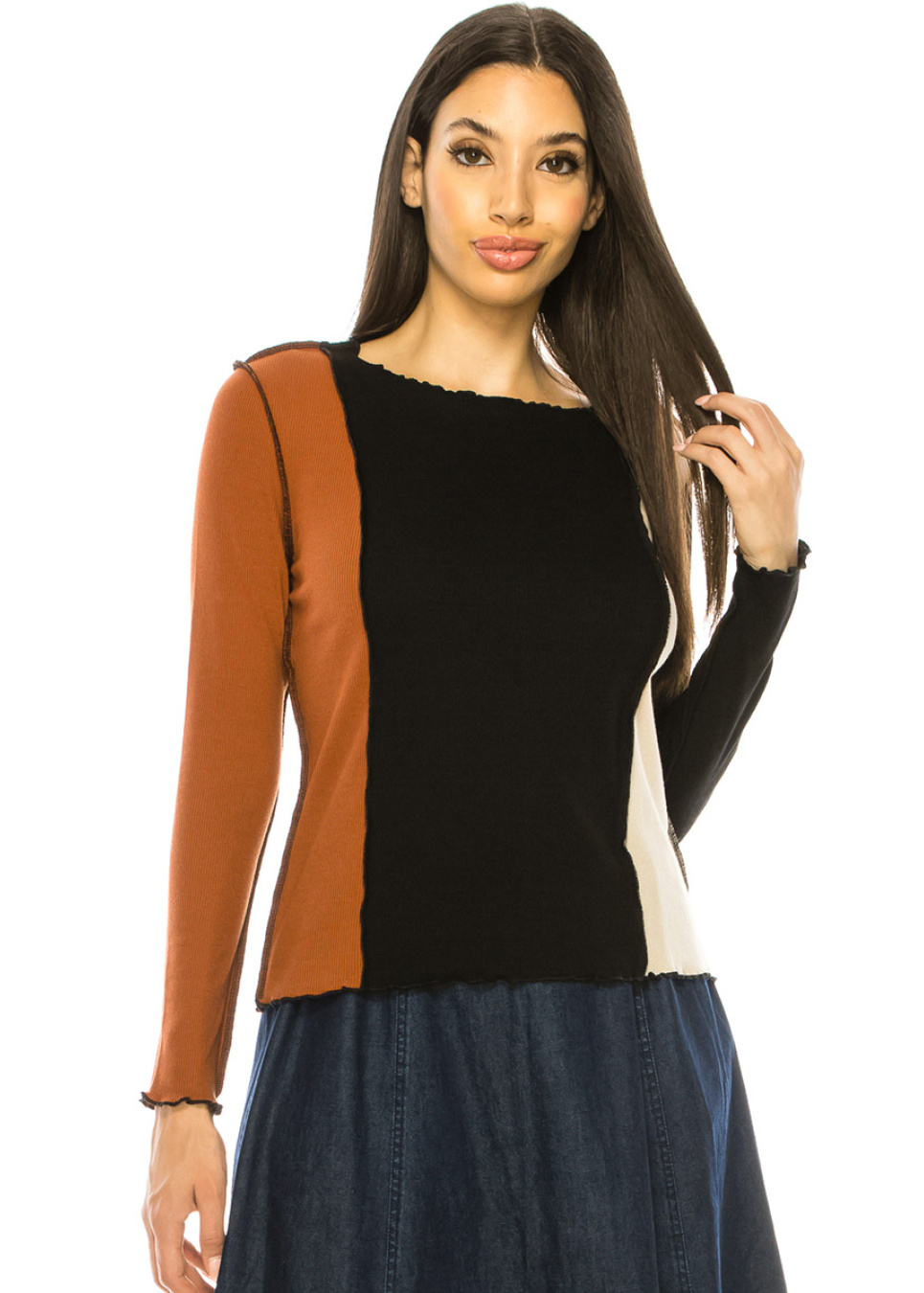 Perfect for those who want to add a playful touch to their wardrobe, this long sleeve t-shirt with a boat neck and color block design features a vibrant combination of shades that is eye-catching and fun. The boat neck adds a touch of elegance, while the soft fabric and classic cut ensure comfort and versatility.