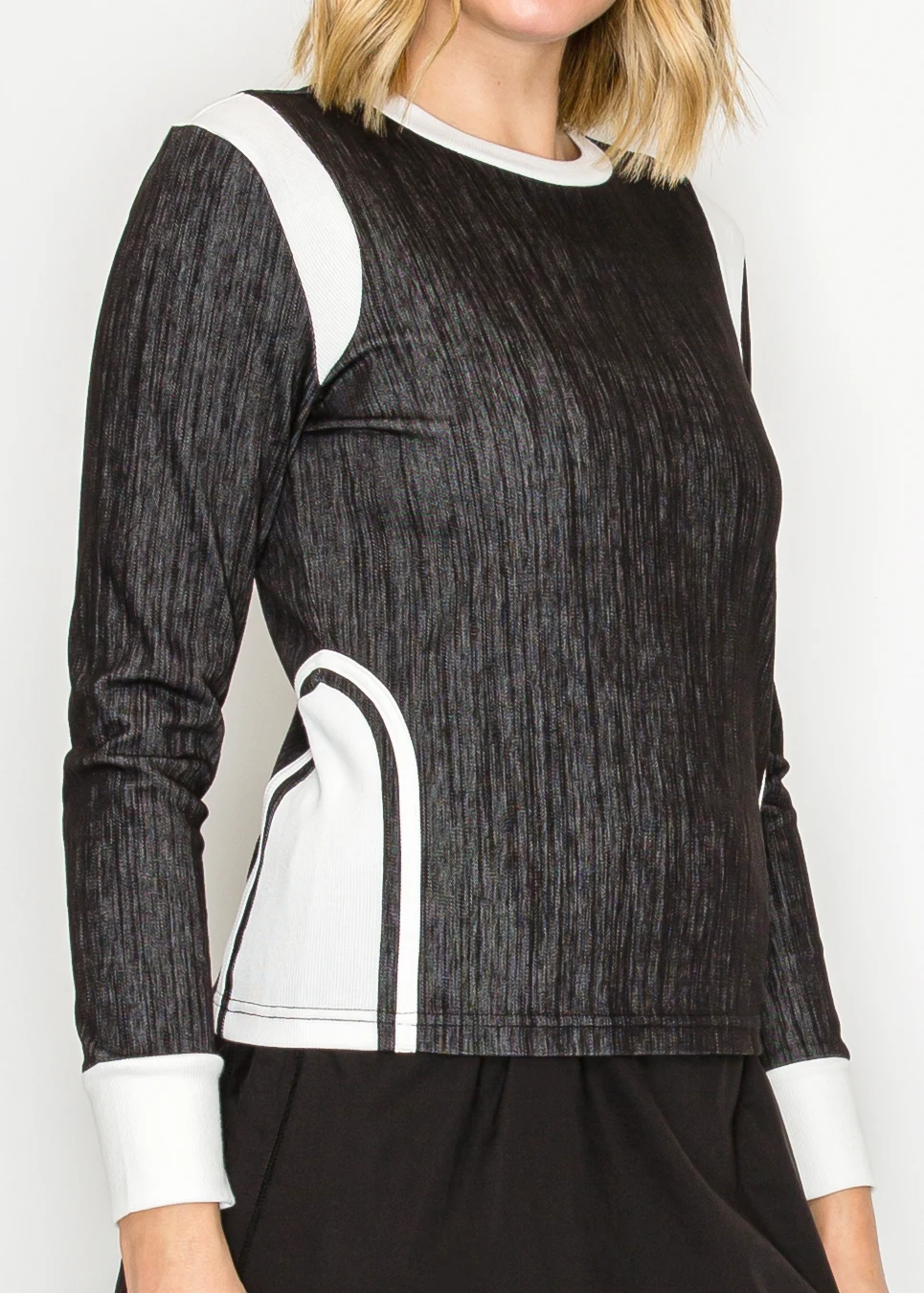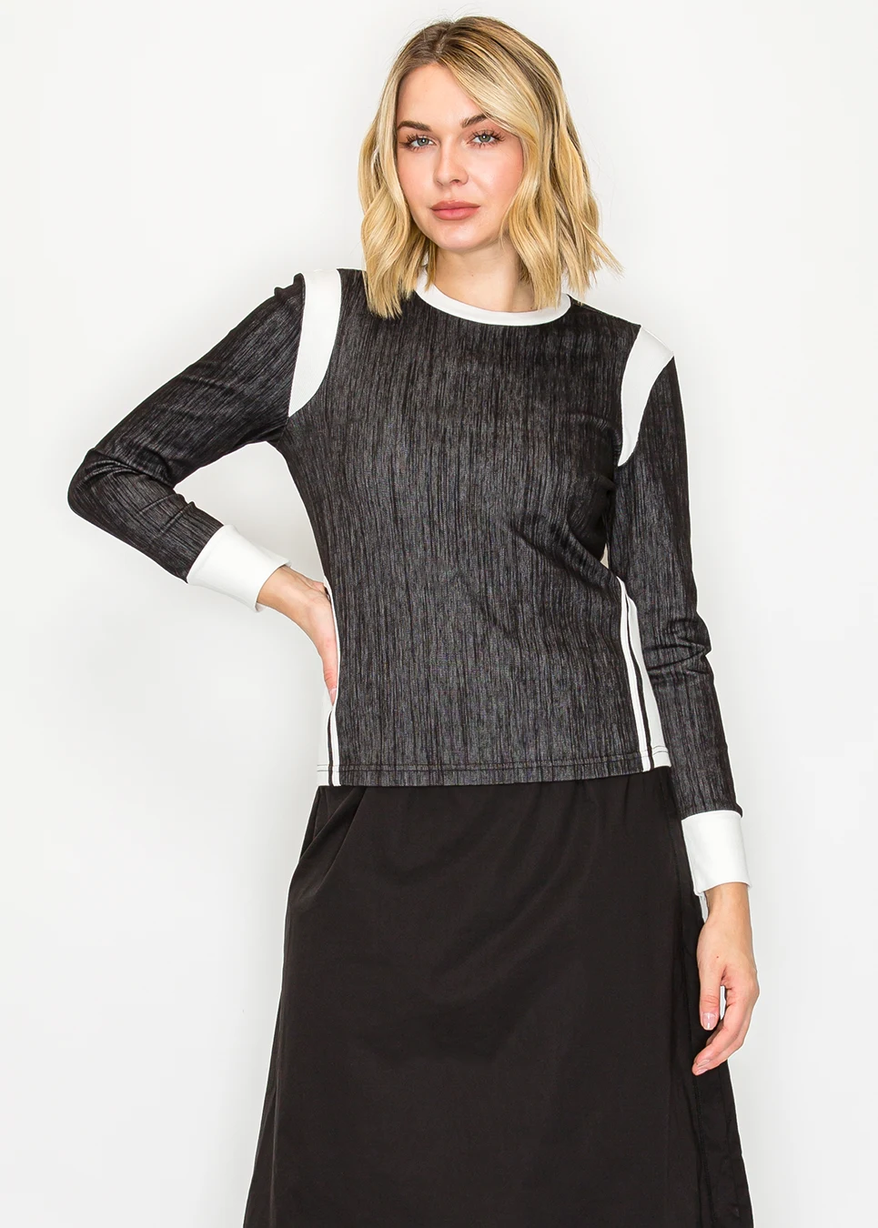 Long Sleeve Black Pullover with Denim Trim