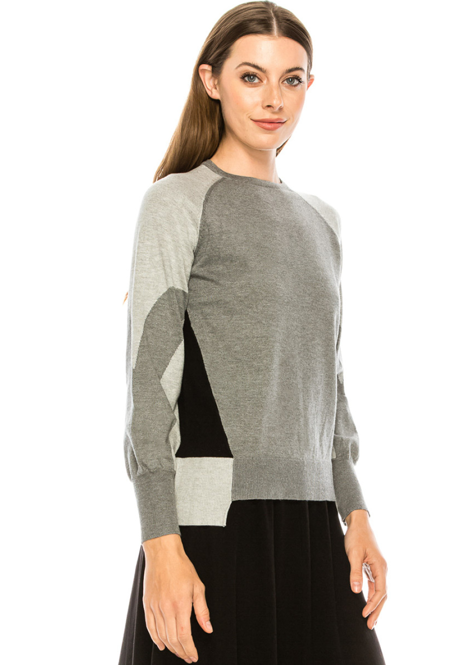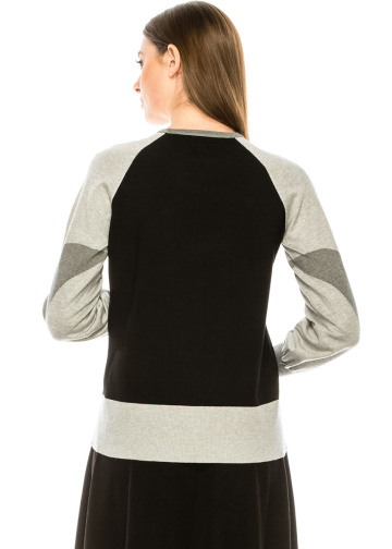 This item proves the sweater can be both trendy and modest. Blouson sleeves, tight-fitting cuffs, and color blocks give the model its stylish look. On the other hand, basic colors and simple cut make the design reserved and classy.
