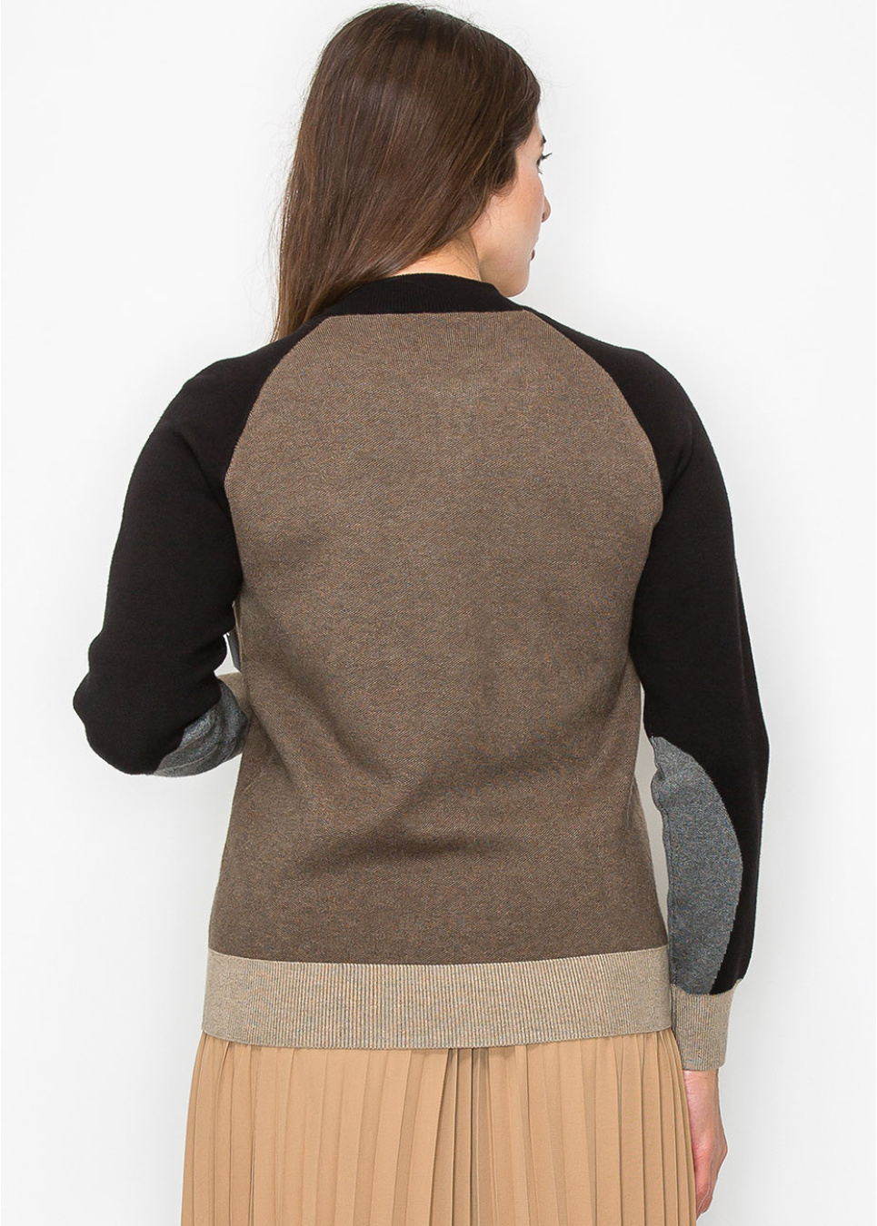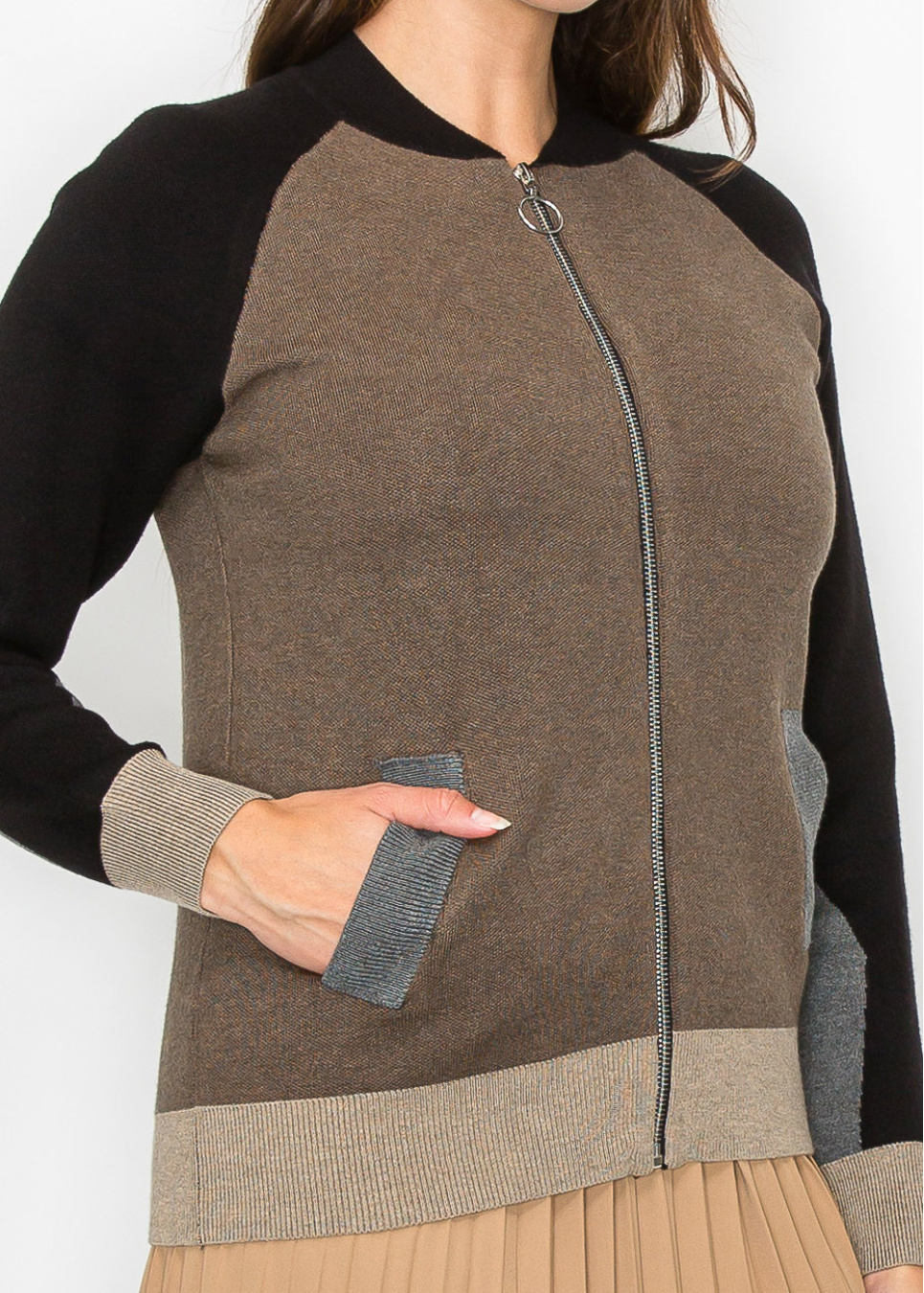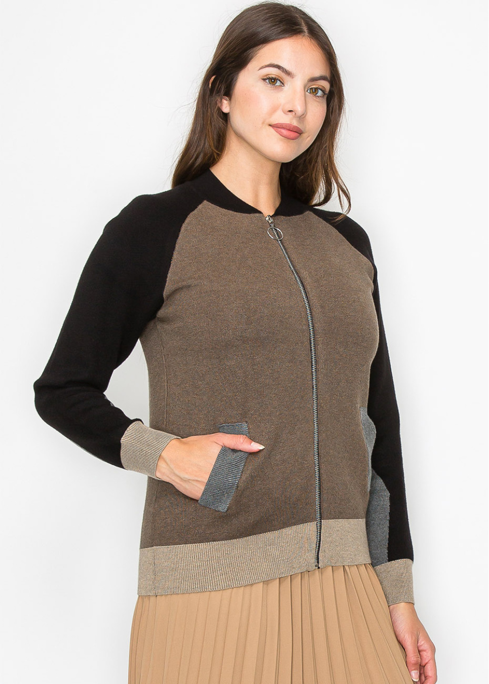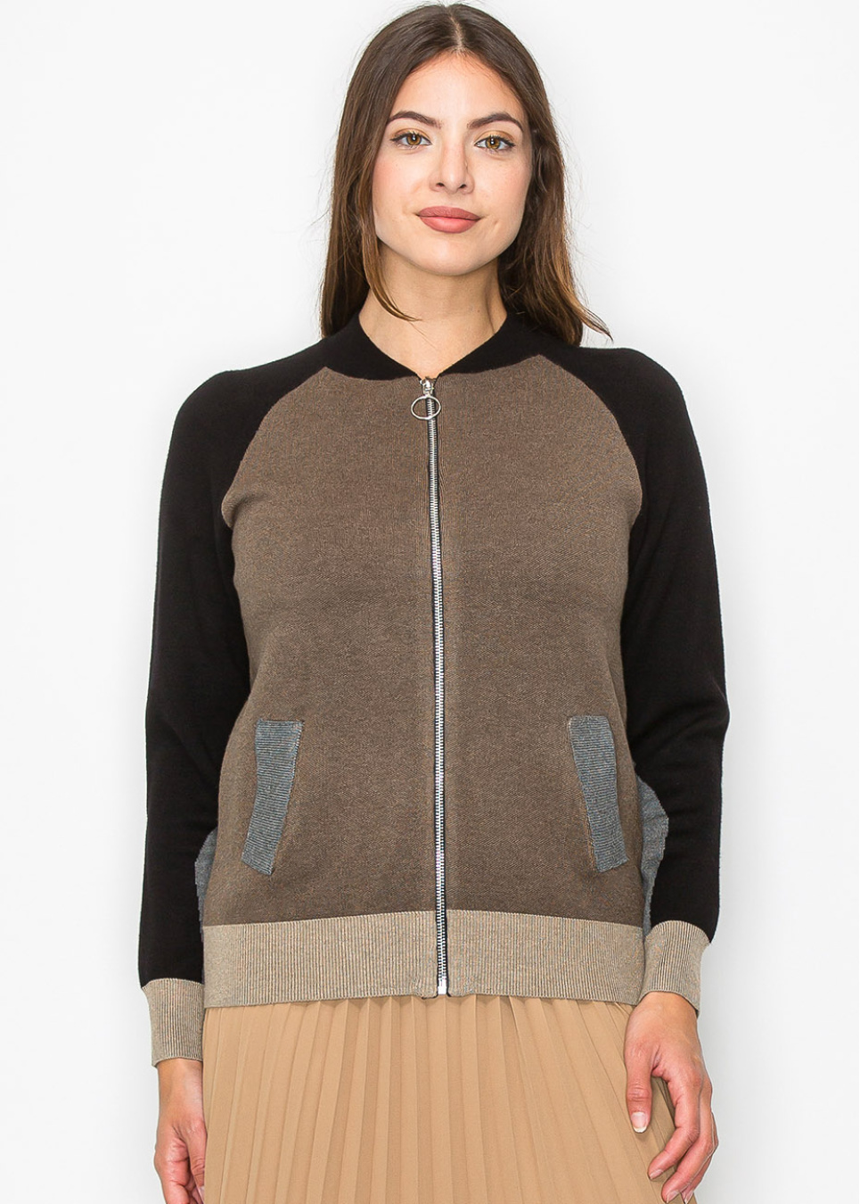 This taupe knit jacket with black sleeves offers a sleek, modern look. The zip-up front is finished with an O-ring zipper pull, adding a subtle stylish touch. The grey pocket accents add a pop of contrast, making this jacket a great choice for cooler days.