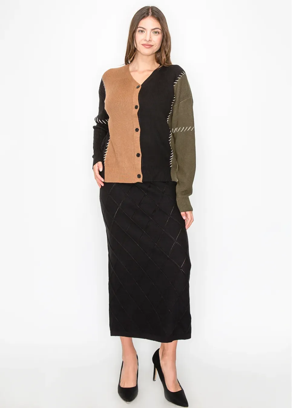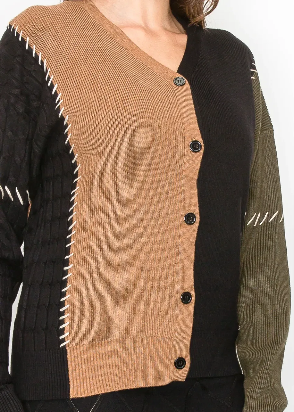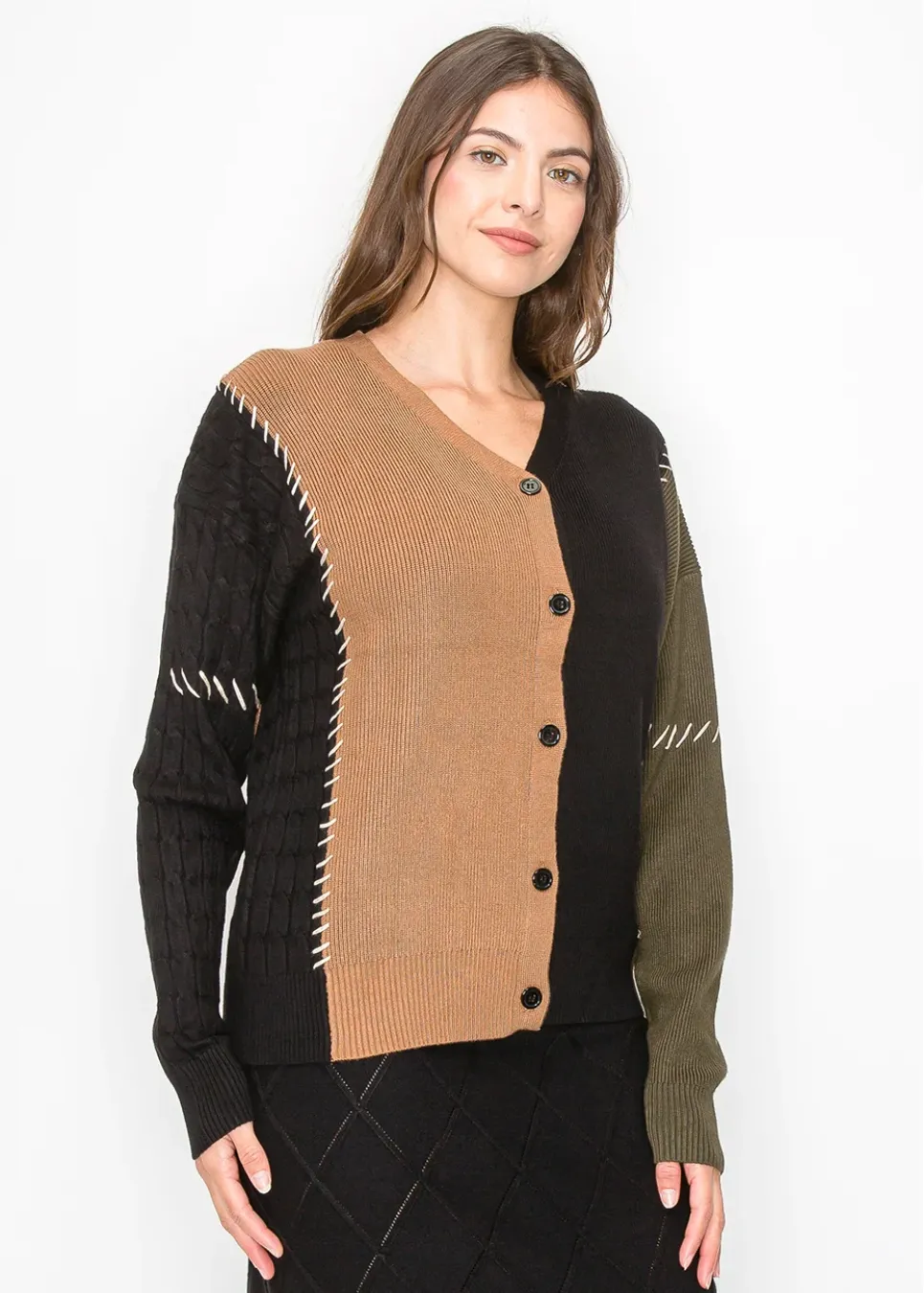 A modern button-front cardigan designed in camel, black, and olive panels. Finished with whipstitch accents that add edge to the classic knit.