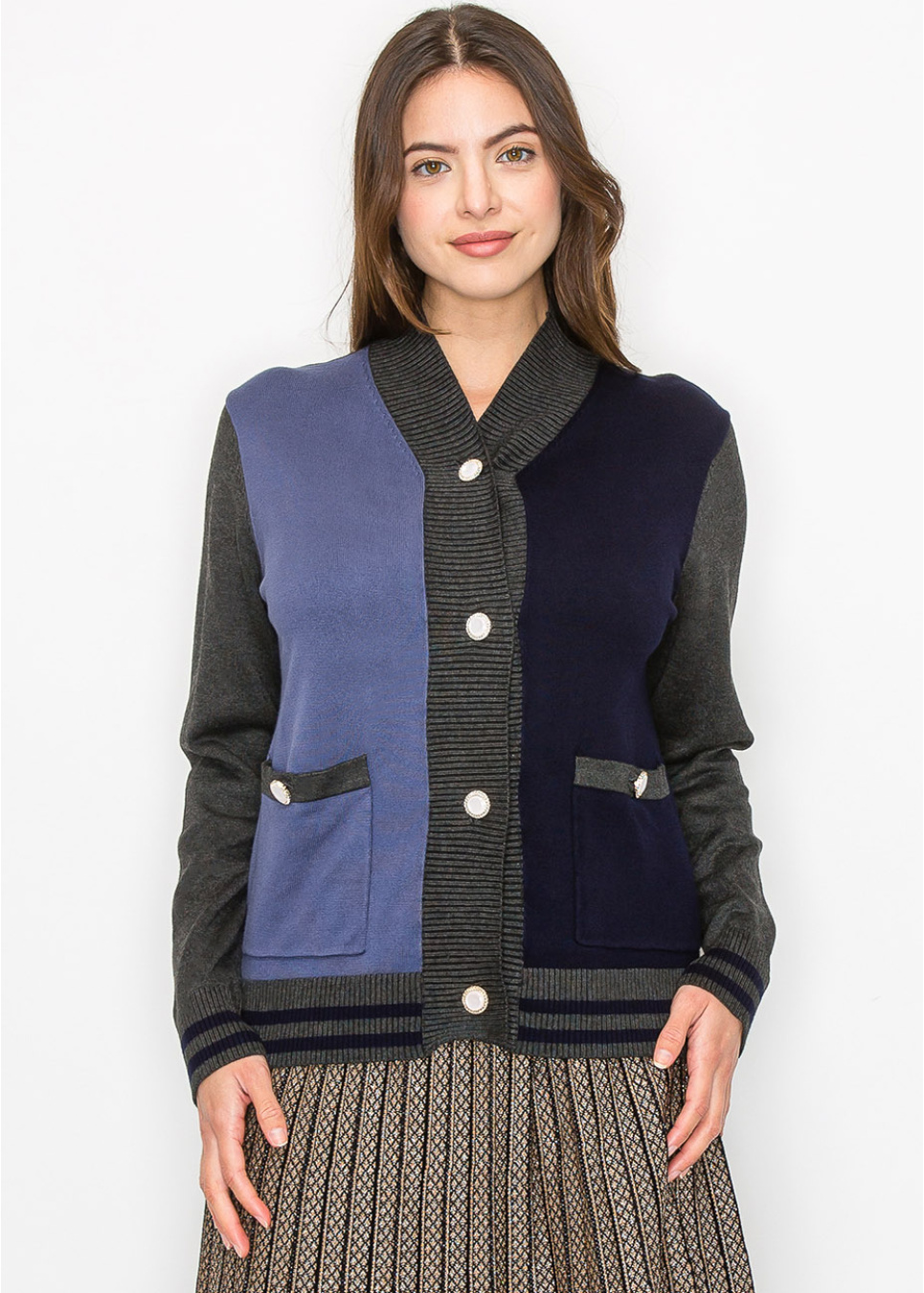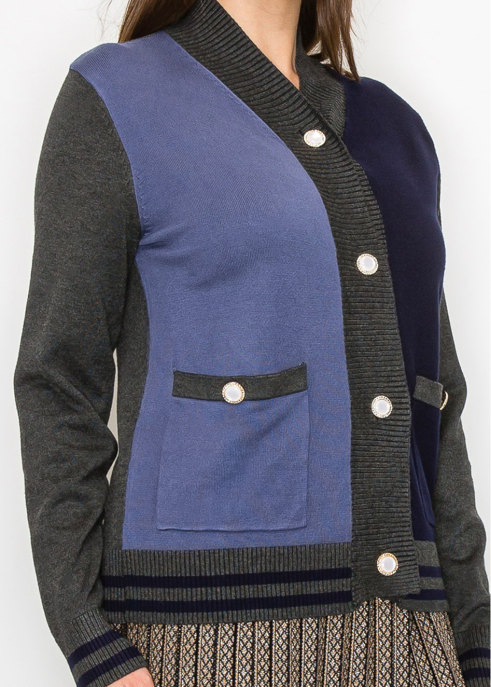 Bold and elegant, this colorblock cardigan in shades of navy, blue, and gray makes a statement. Accented with pearl-like buttons and patch pockets, it’s a standout piece that balances sophistication with comfort. Layer it over a simple top for an effortlessly chic look.