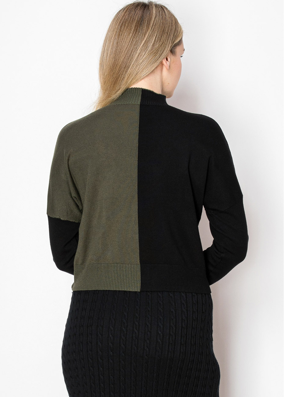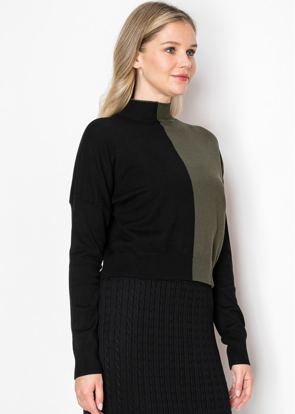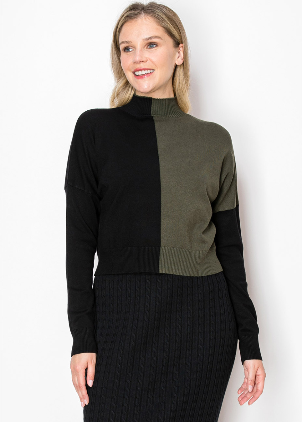 This colorblock knit sweater in olive and black is a stylish addition to any wardrobe. The contrasting colors and high neckline add a modern flair, making it perfect for layering or wearing on its own for a chic, understated look.