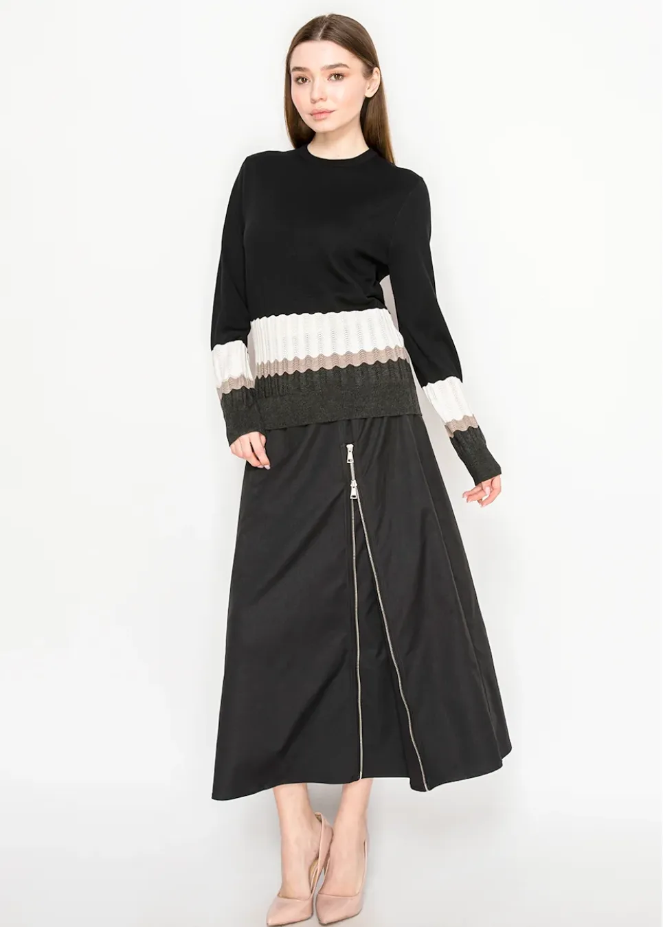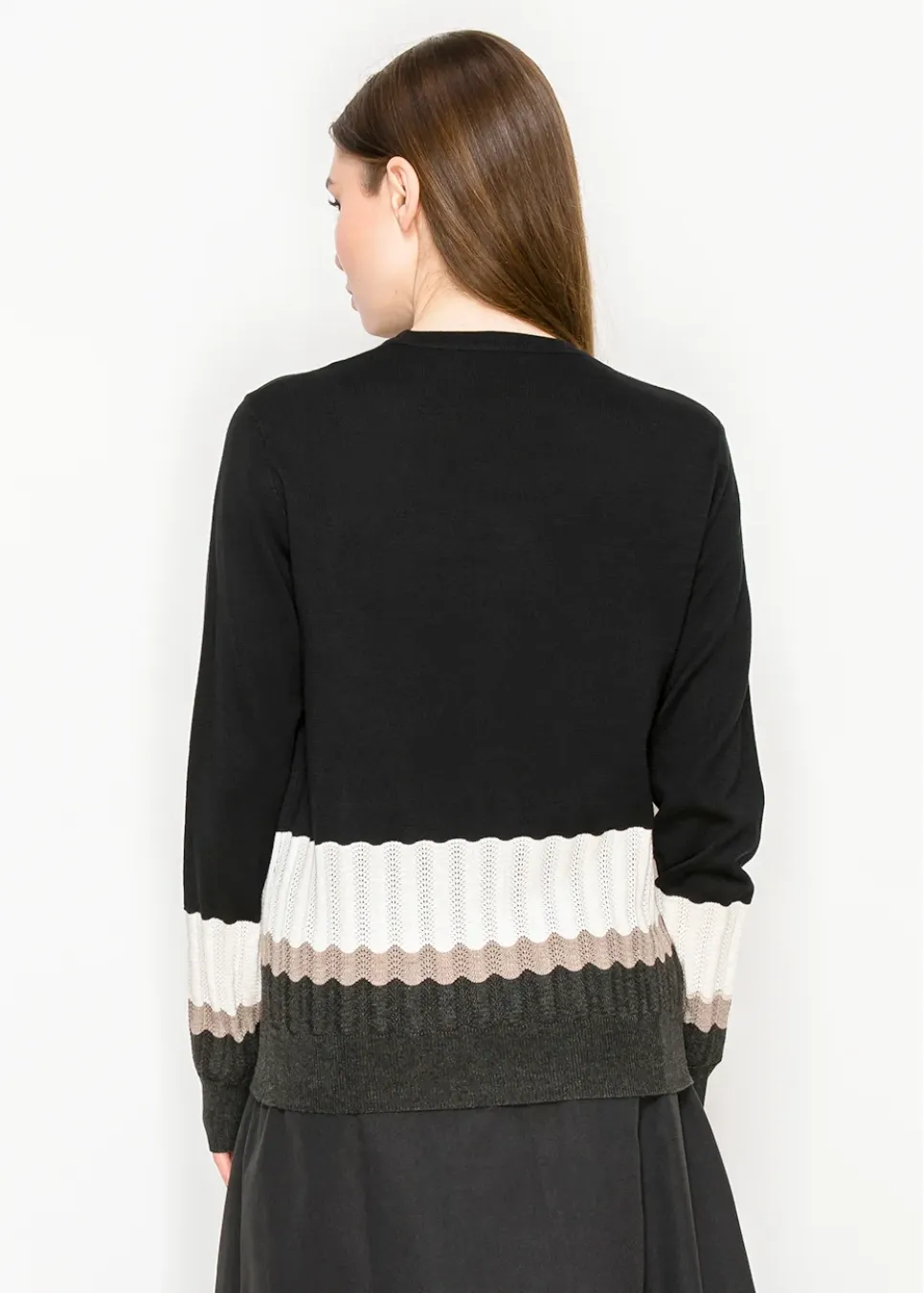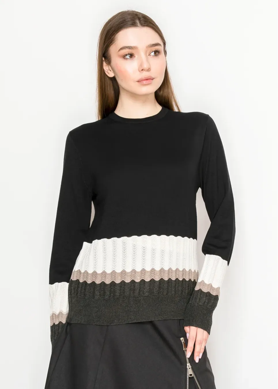 Sleek up top, textured down below. This piece blends a smooth black body with detailed rib-knit stripes for a modern colorblock effect that works from workdays to weekends.