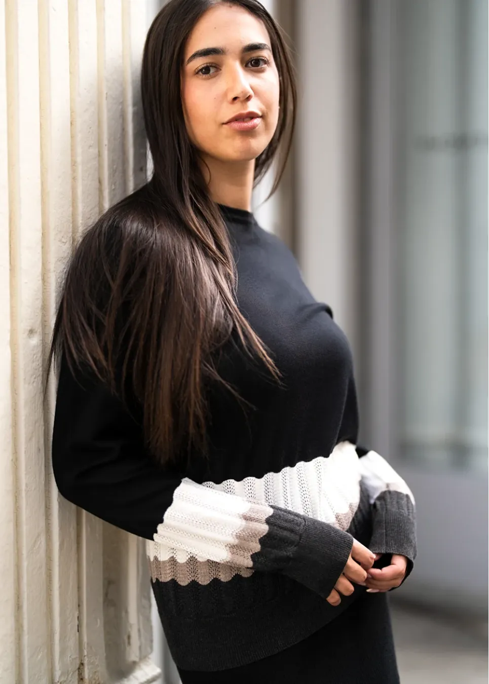 Black Sweater with Patterned Sleeves