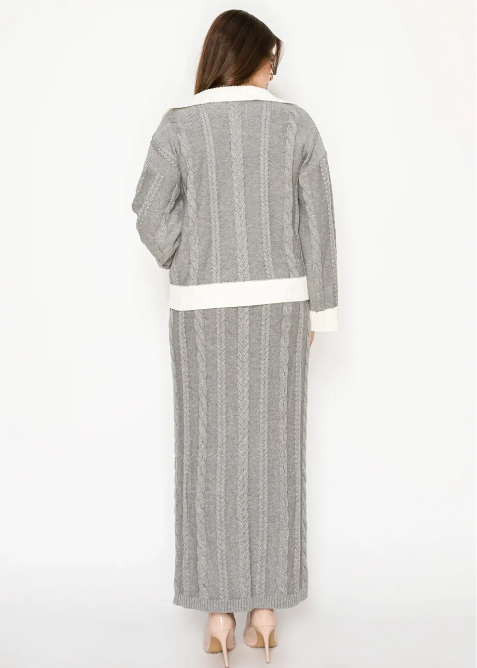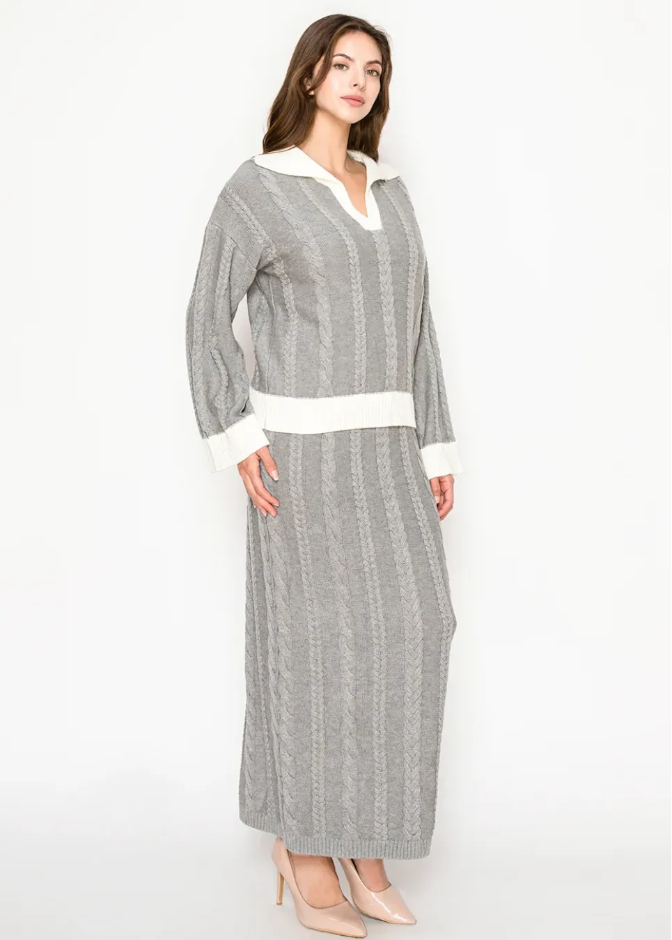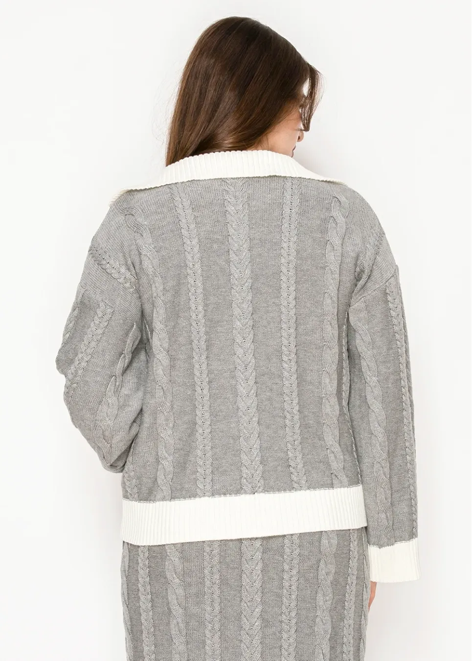Olive Cable Knit Polo Sweater with Contrast Collar