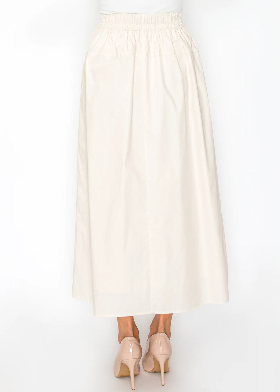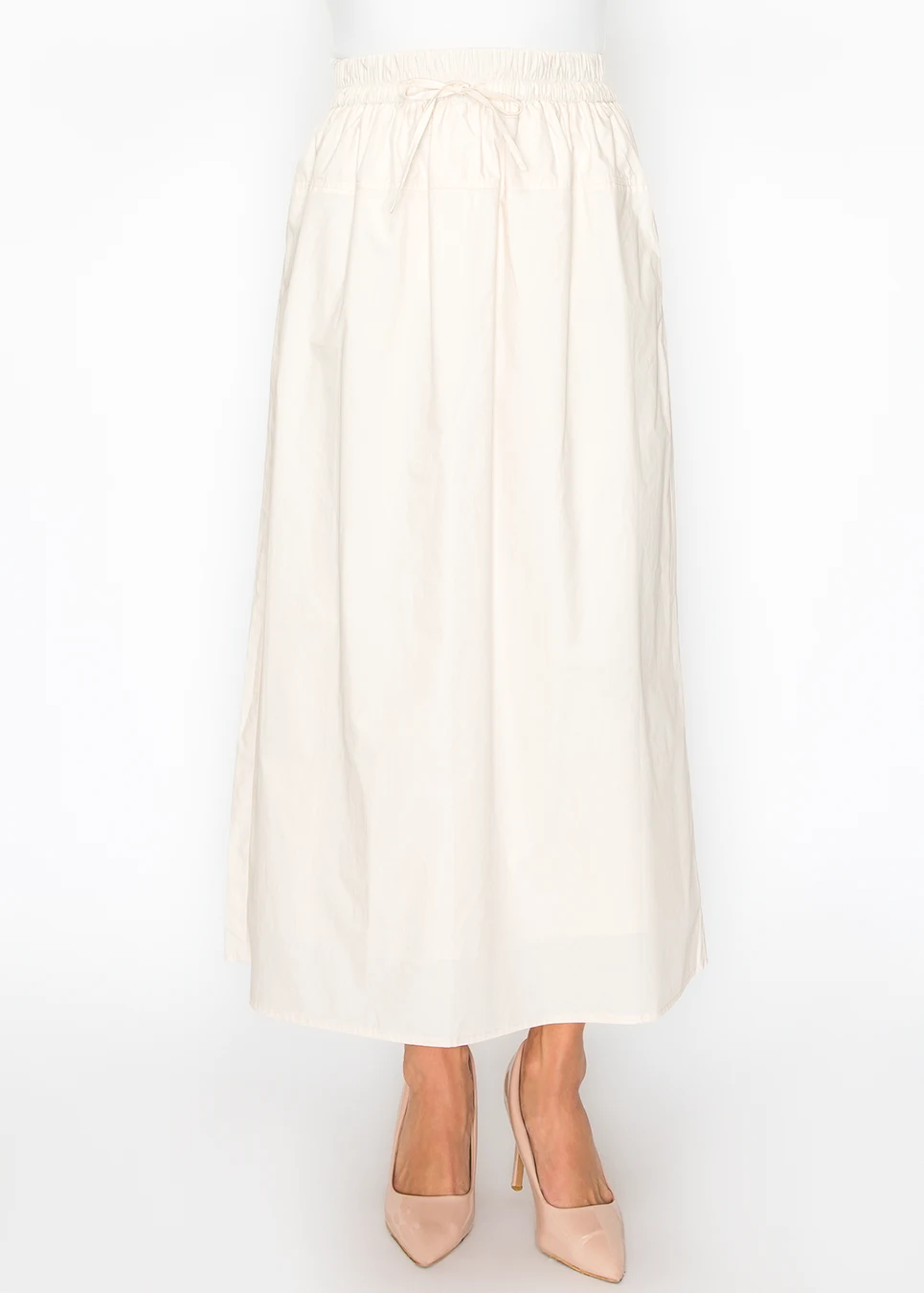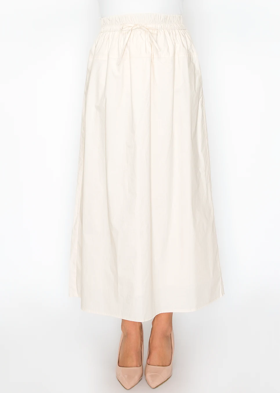 Cream does something beige can't — reads clean without reading cold. This skirt has a brightness that works from spring through fall. Full A-line, drawstring waist, lightweight cotton. Pairs with everything already in the white-and-neutral range.