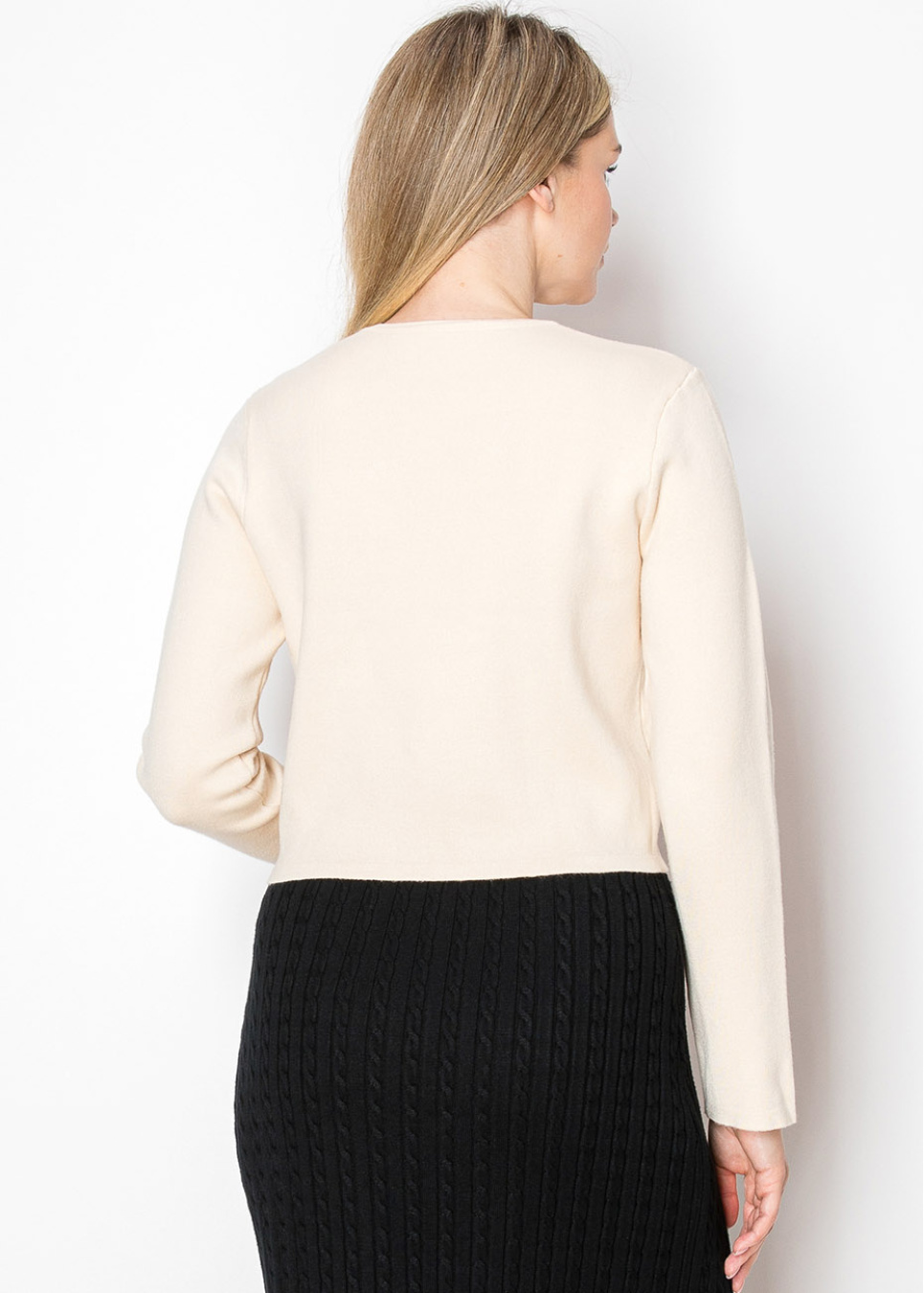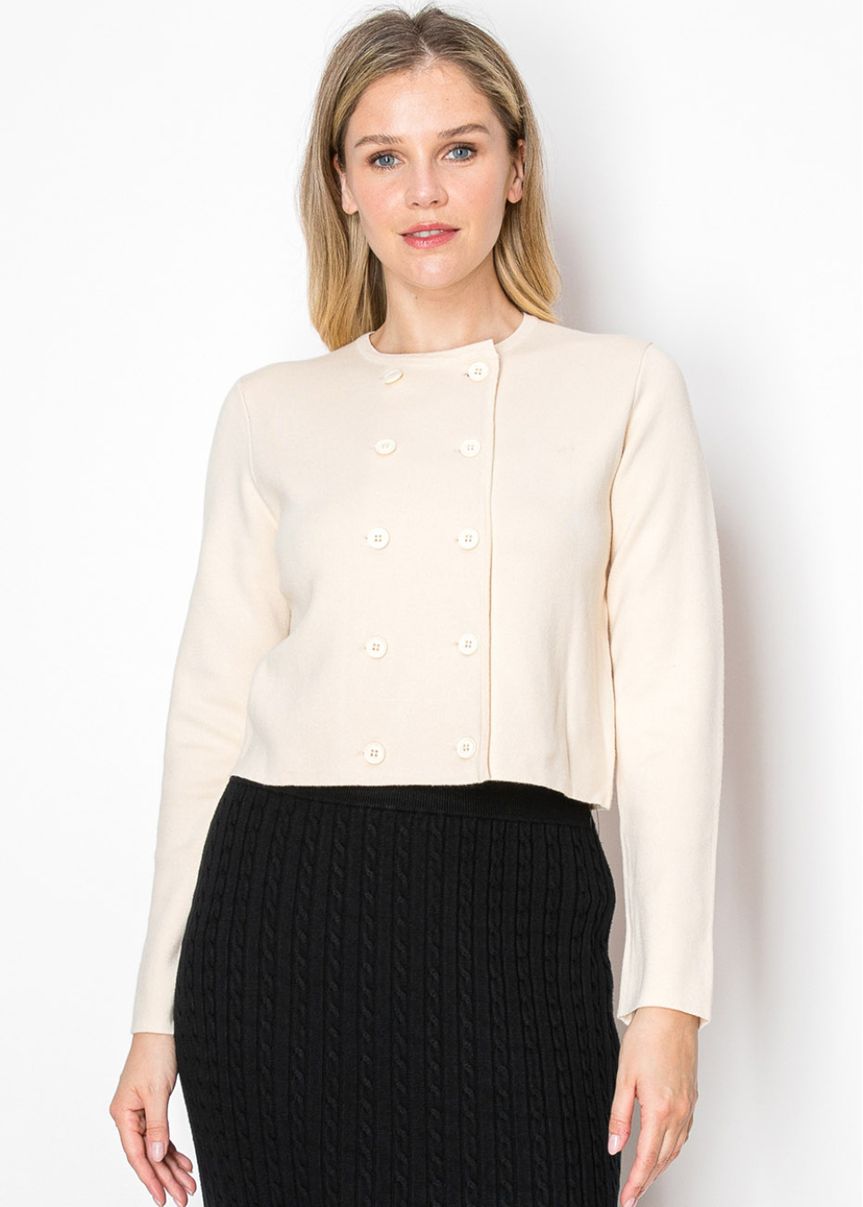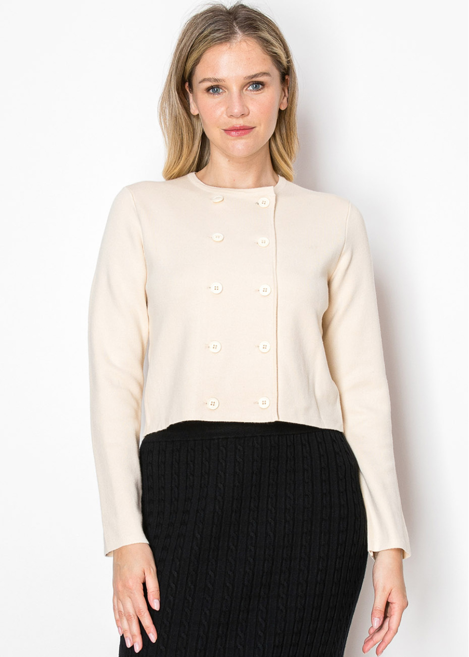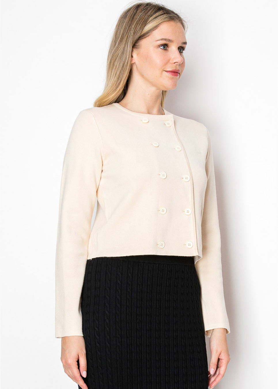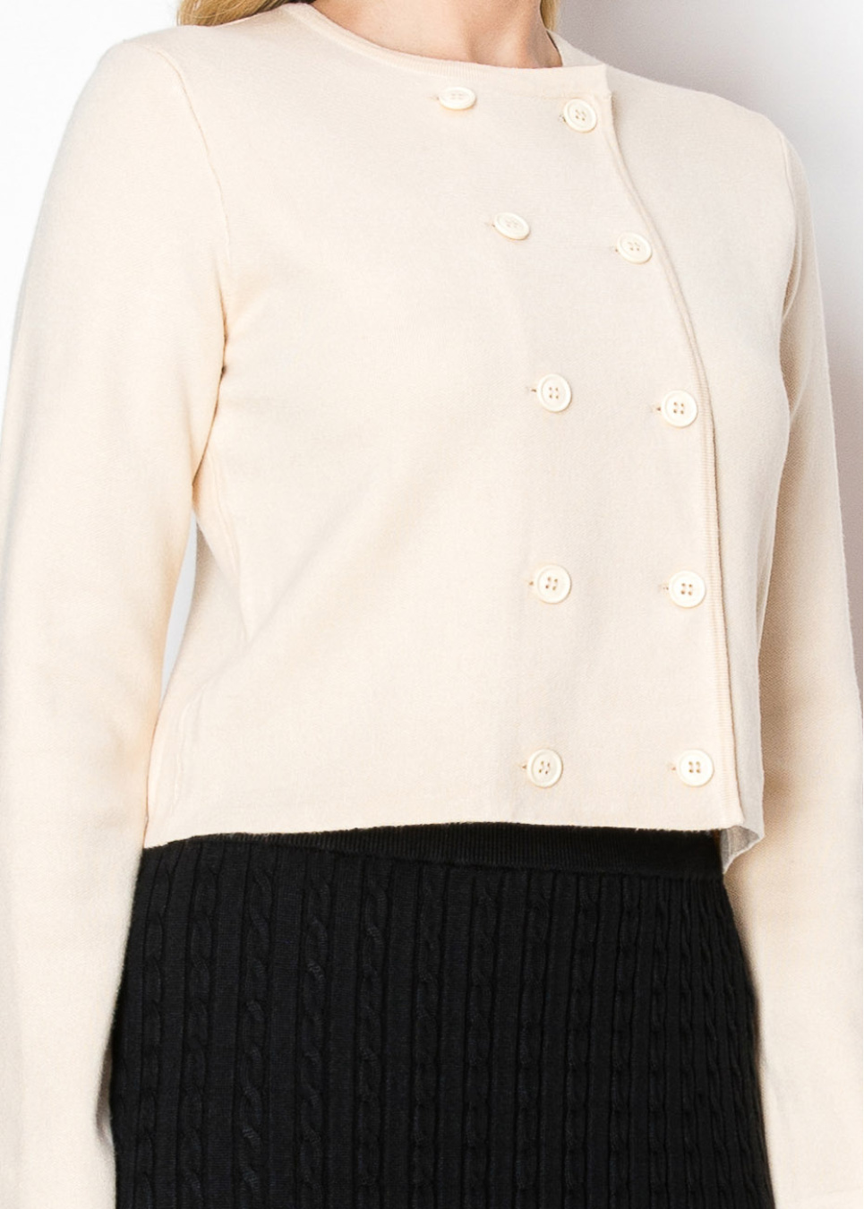 With a sleek, buttoned front and cropped length, this cream cardigan offers a minimalist yet elegant look. The double row of buttons adds a decorative touch, making it a great layering piece for a chic, modest outfit.