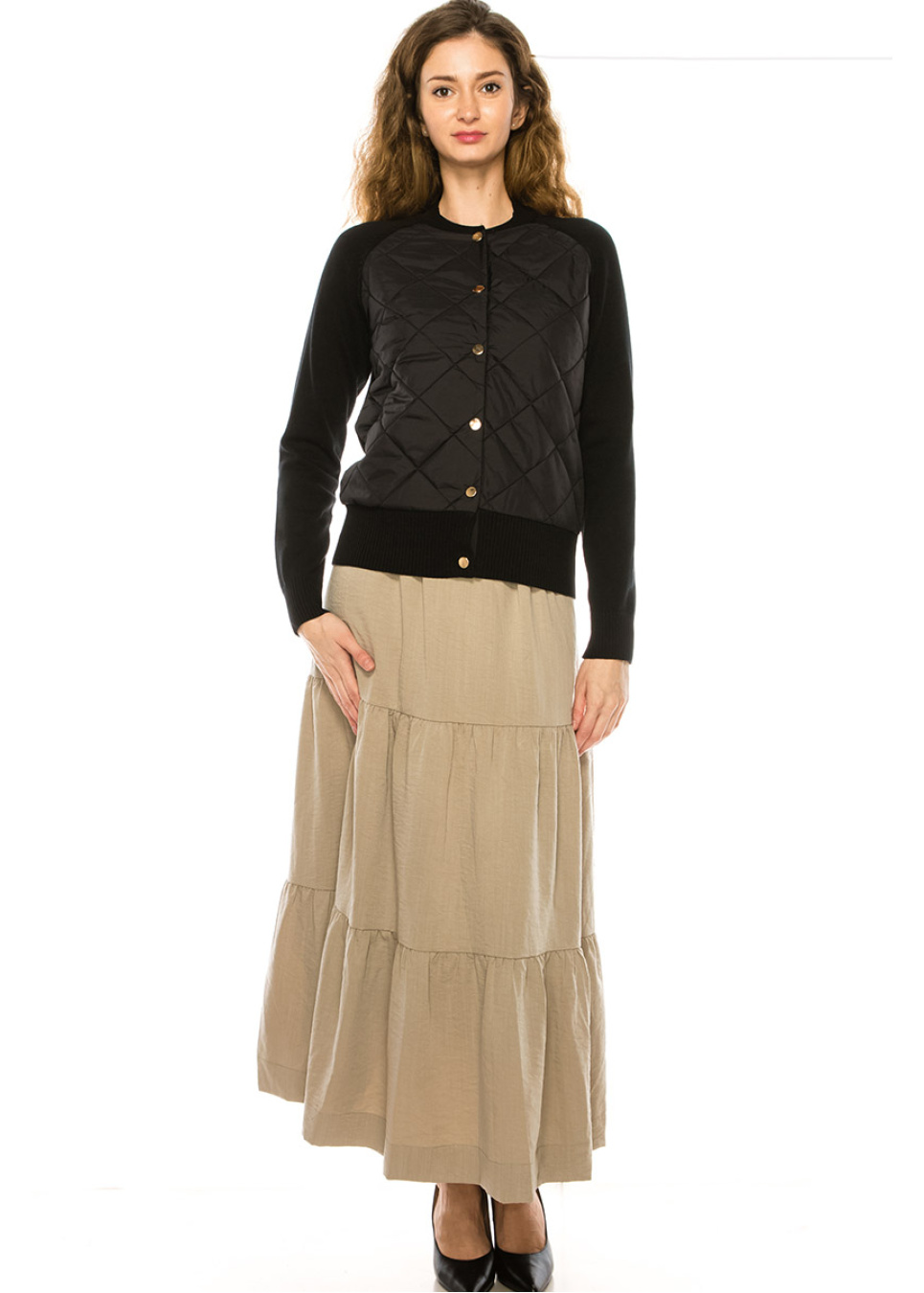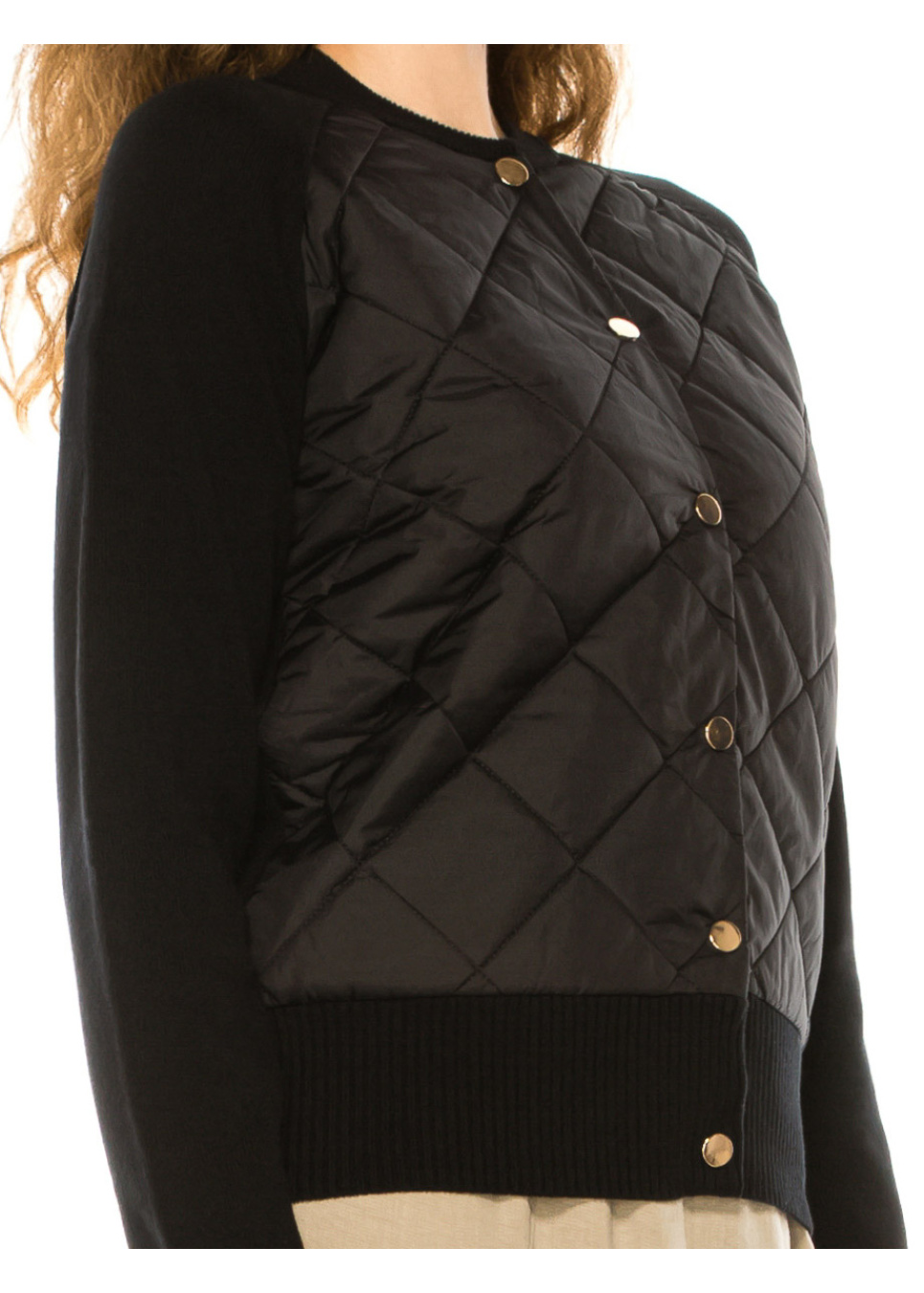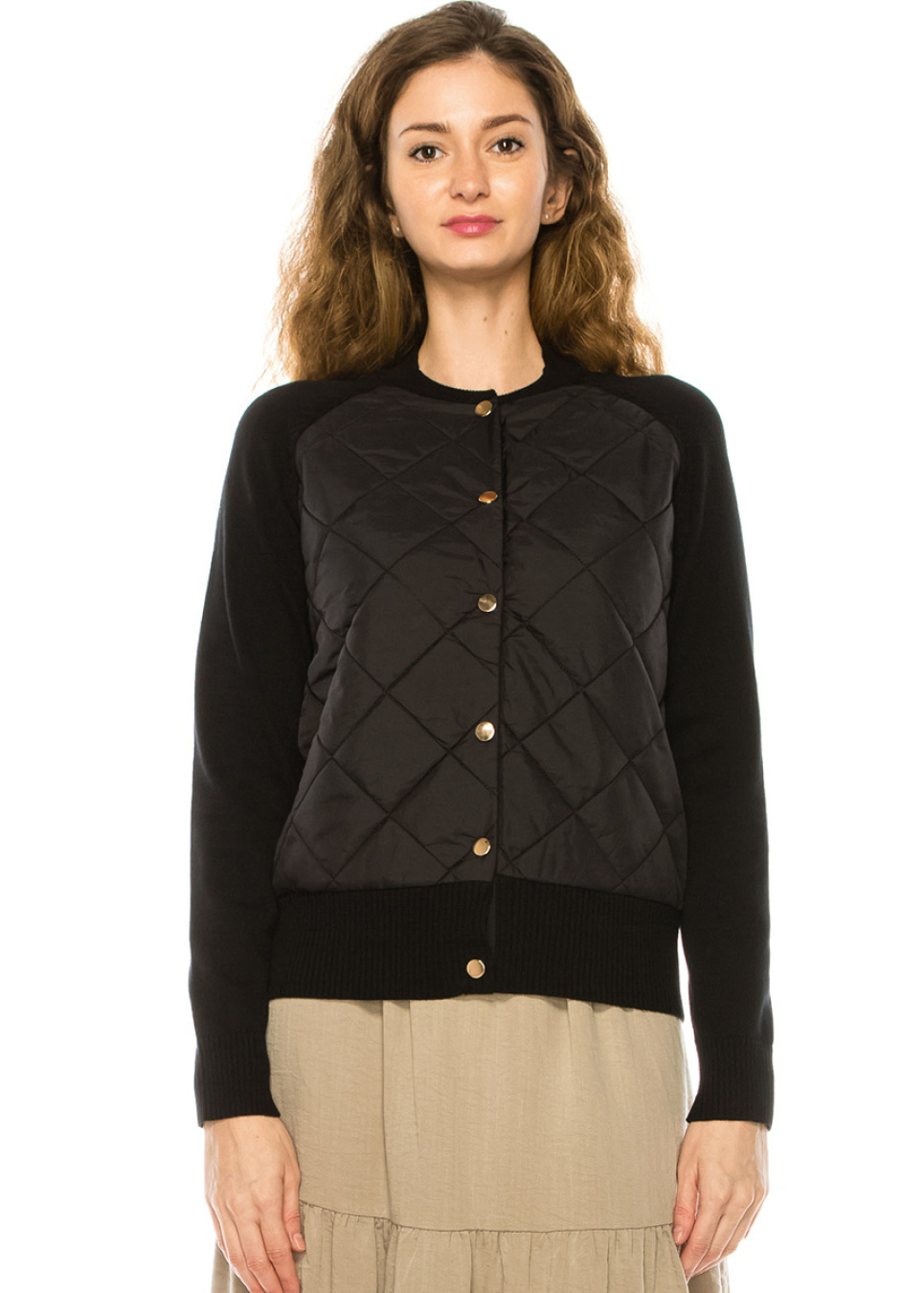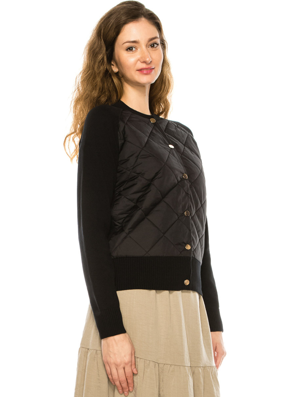Make a stylish yet understated statement with this stunning black quilted cardigan. Its classic button-front style and crew neck offer a clean and sophisticated look, while the quilted body adds a subtle touch of personality and texture to the piece. This versatile cardigan is perfect for adding some extra warmth and interest to your outfit without sacrificing elegance.